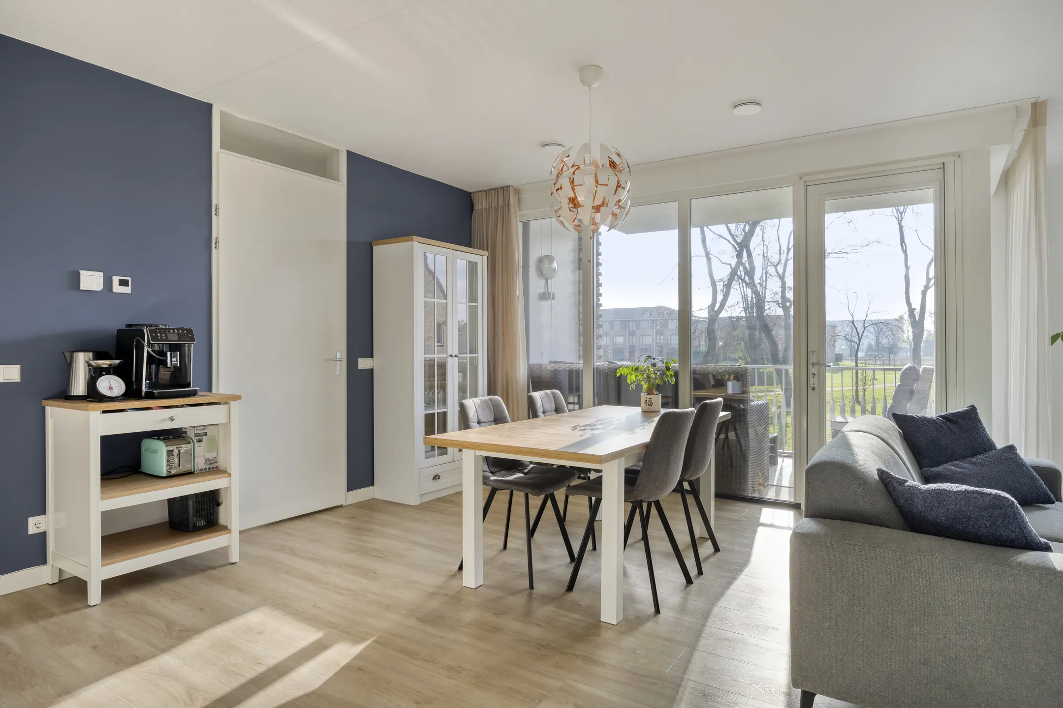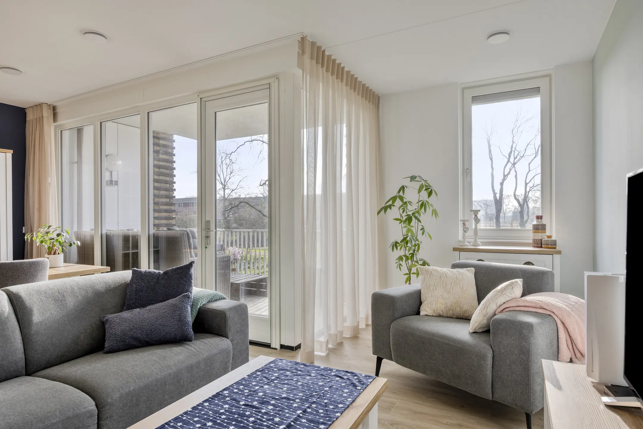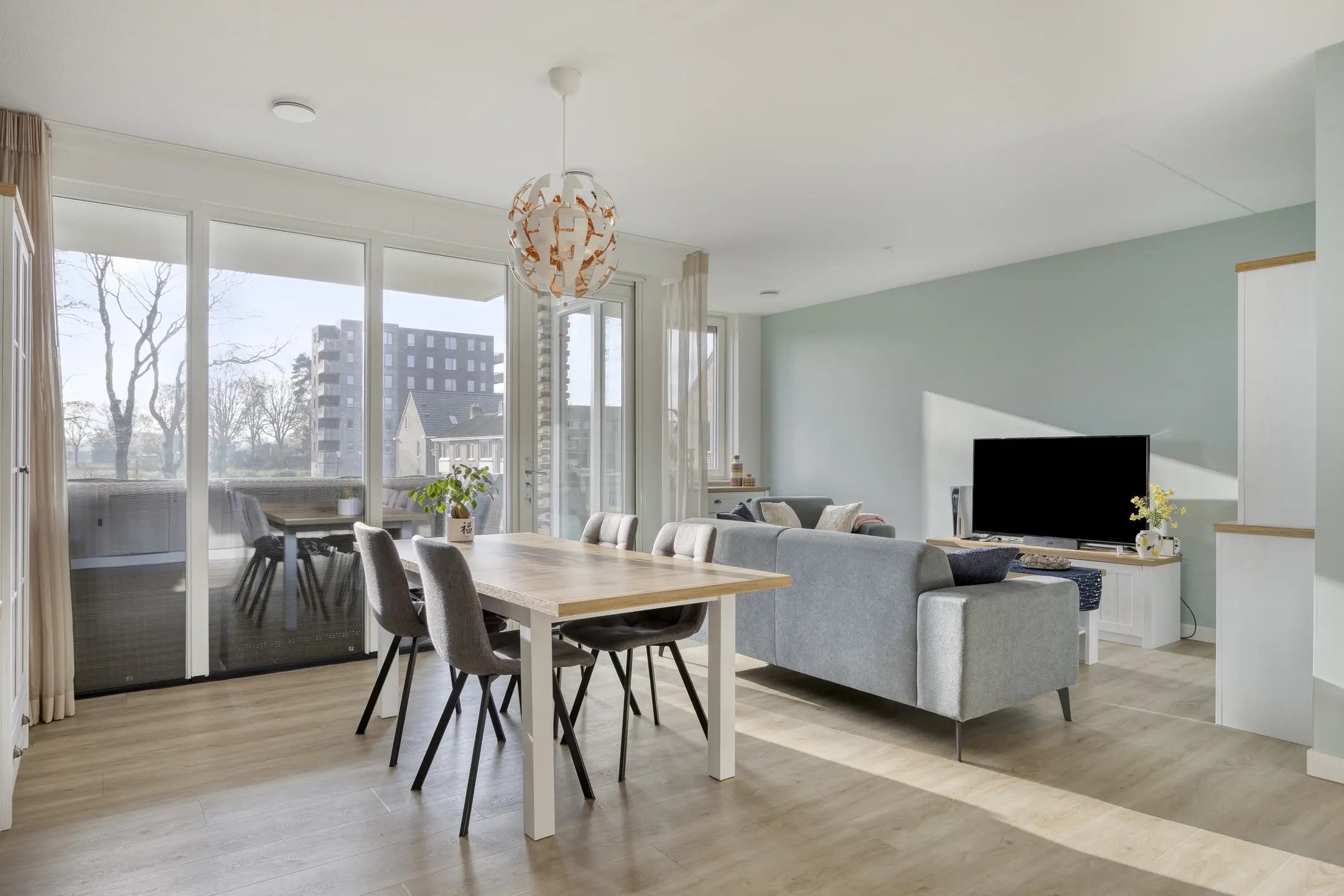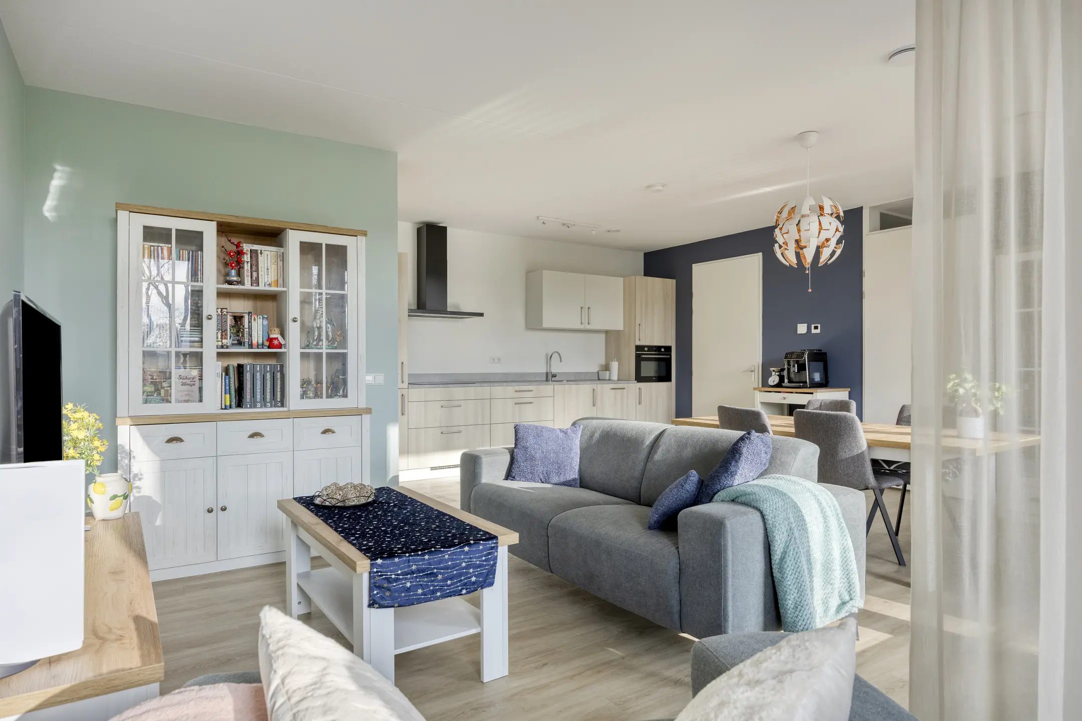 De woonkamer is licht, knus en slim ingedeeld. Dankzij de grote raampartijen stroomt het daglicht rijkelijk naar binnen, wat zorgt voor een open en prettige sfeer. De ruimte is perfect van formaat en biedt volop plek voor een comfortabele zithoek en een gezellige eethoek.