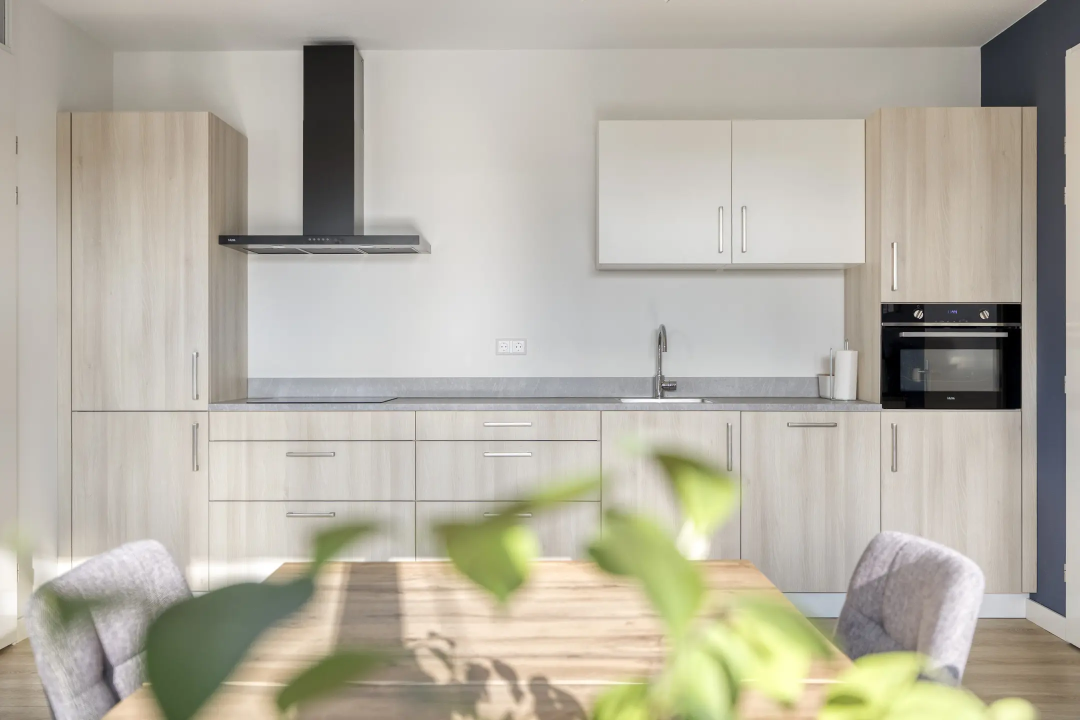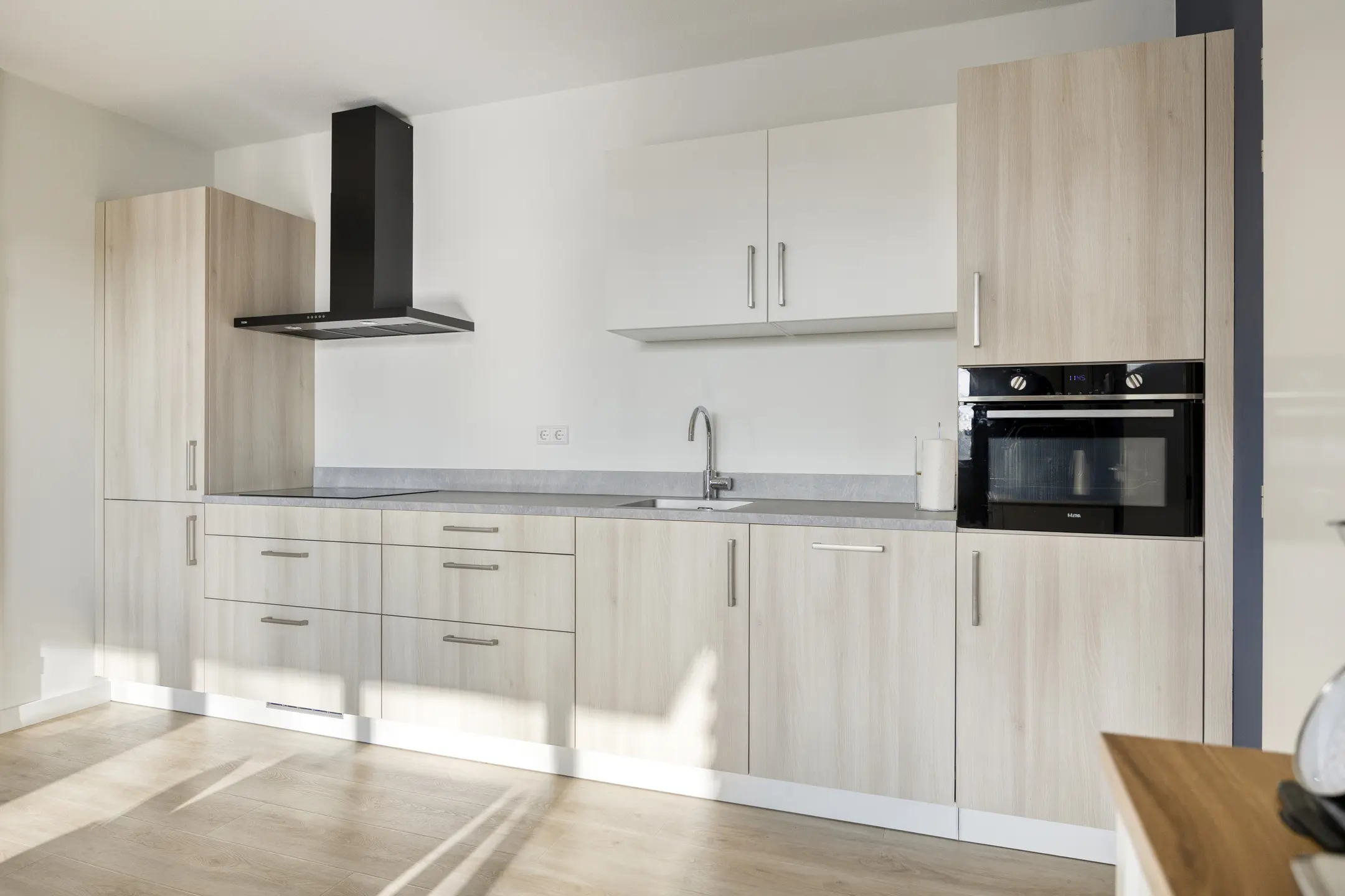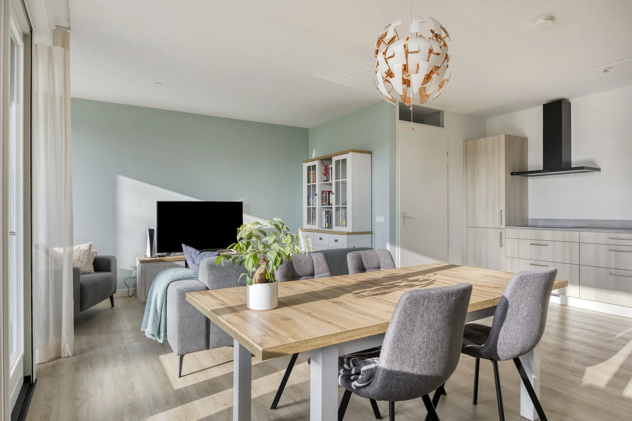 Via de woonkamer bereik je het balkon en de technische-/wasruimte. De open verbinding met de keuken zorgt voor een fijne samenhang tussen koken en wonen.