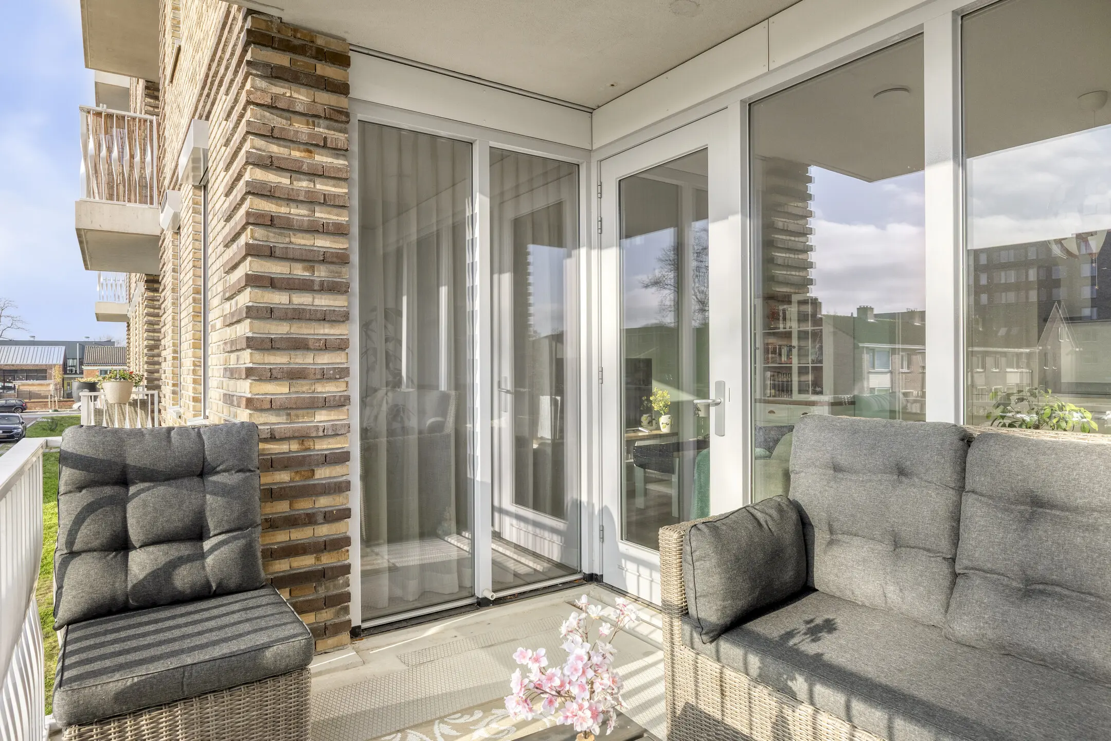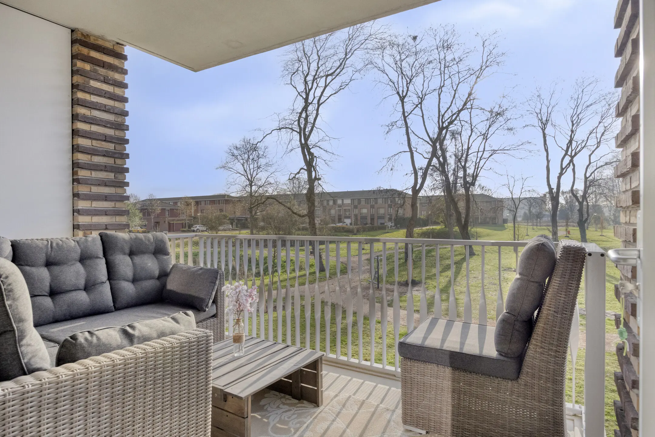 Via de woonkamer stap je op het gezellige balkon met uitzicht op de ganzenvijver en het omliggende groen. Een heerlijke plek voor een kop koffie in de ochtendzon of een ontspannen borrel in de avond.