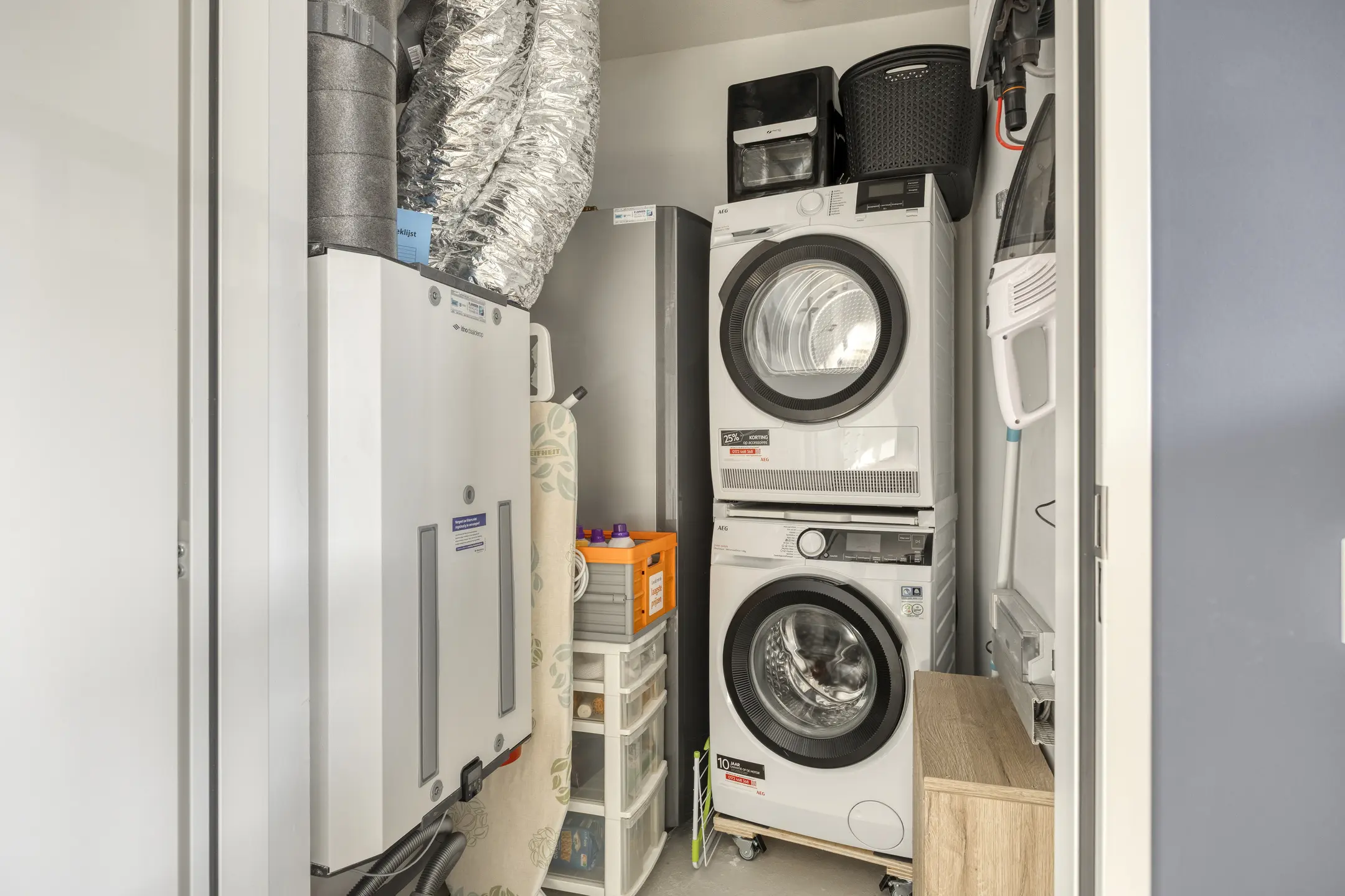 Praktische aparte ruimte voor de wasmachine en droger. Daarnaast perfect voor voorraad, schoonmaakspullen en extra opbergruimte. Alles netjes en uit het zicht.