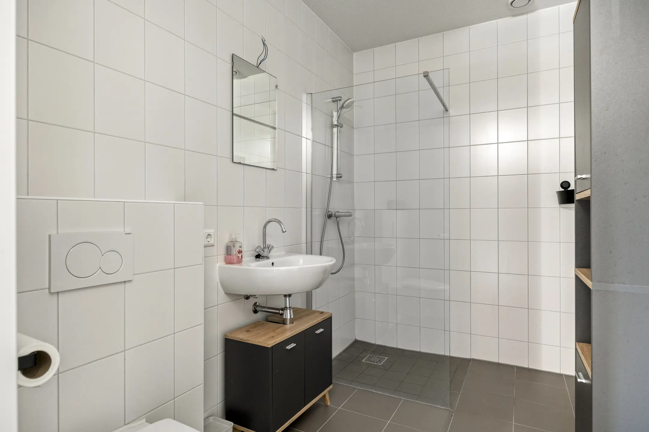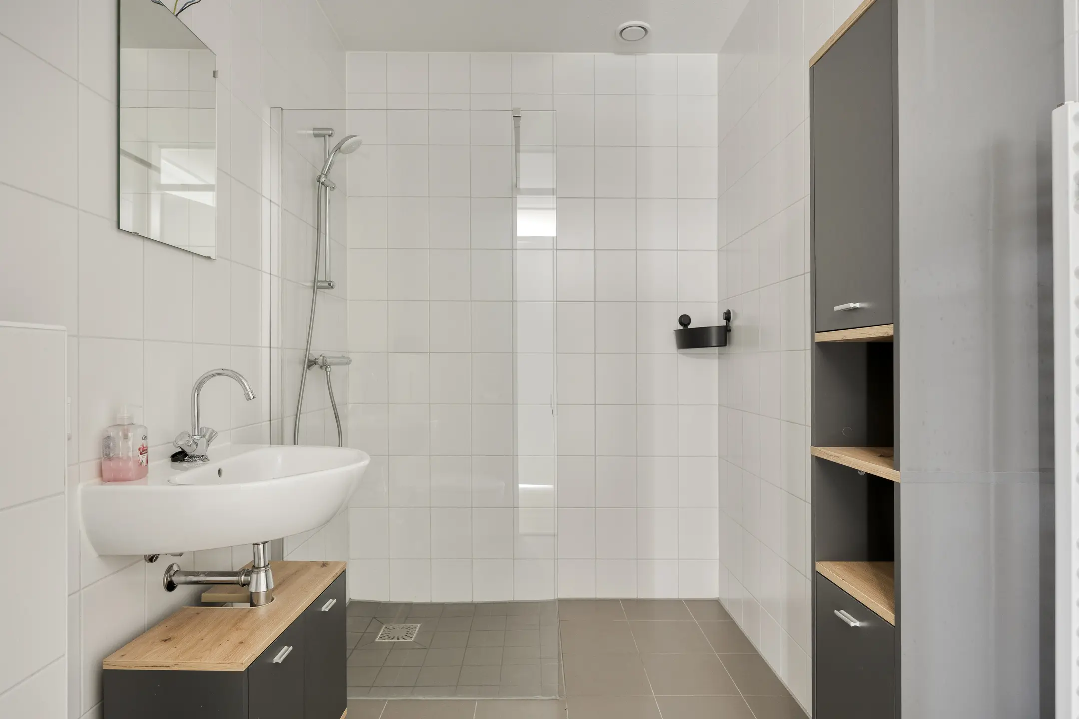 De badkamer is modern en strak afgewerkt met donkere vloertegels en witte wandtegels. Voorzien van een inloopdouche, wastafel en een tweede toilet. Een fijne ruimte om de dag fris te beginnen en ontspannen af te sluiten.