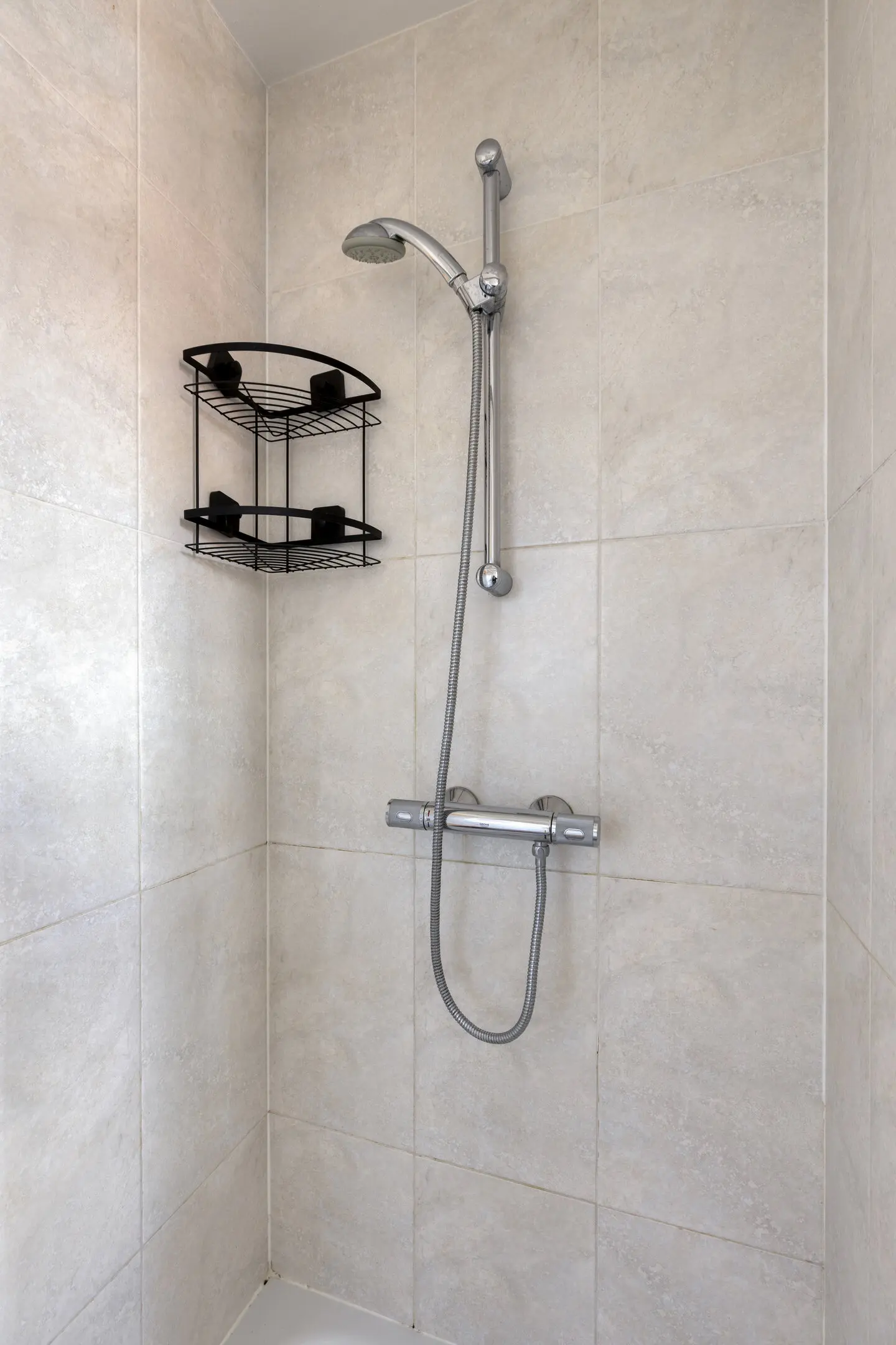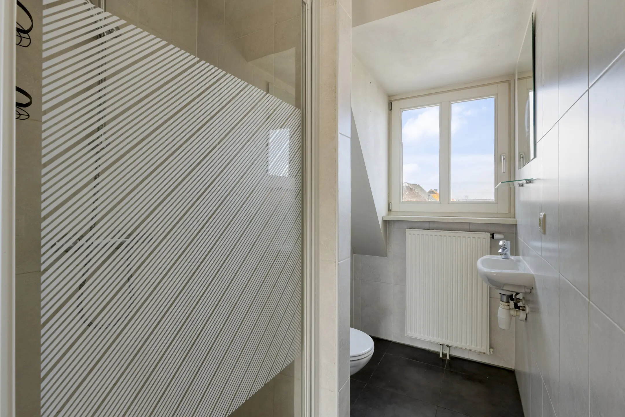 De badkamer is separaat van de slaapkamer en voorzien van een douchecabine en een wastafelmeubel, wat zorgt voor een praktische en functionele indeling.