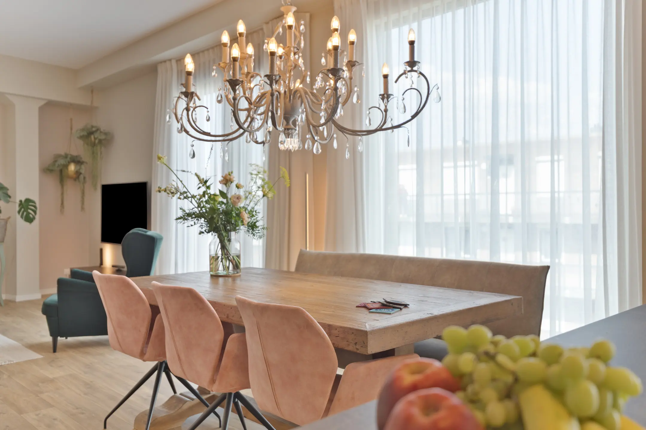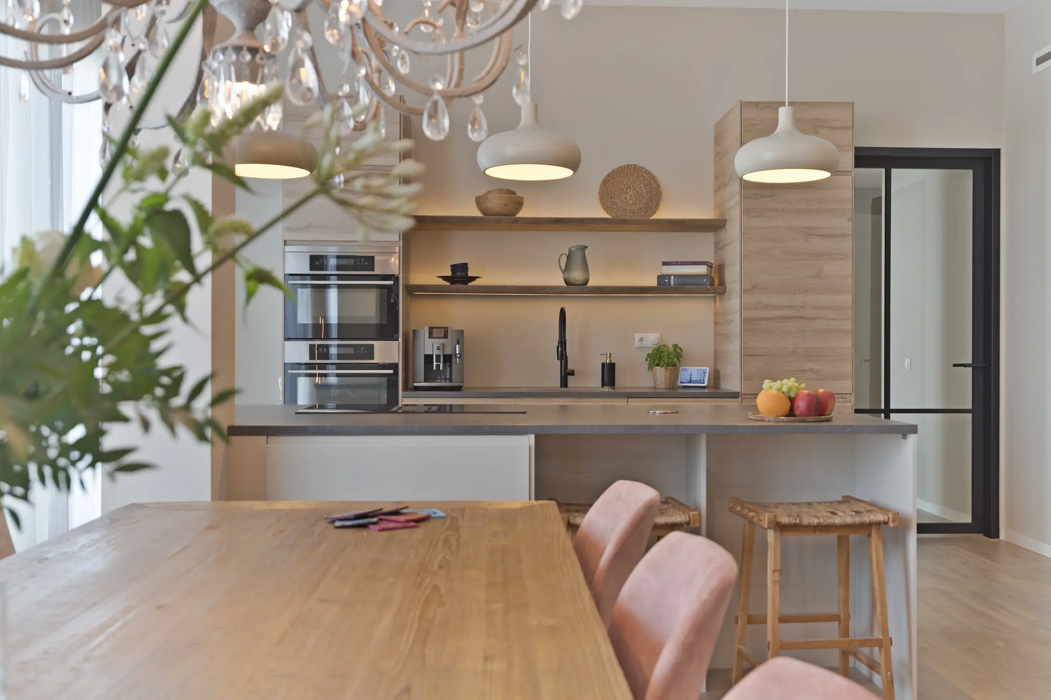 De open keuken is een absolute eyecatcher. Deze moderne keuken is volledig op maat gemaakt en voorzien van luxe inbouwapparatuur van hoogwaardige merken, een strak werkblad, greeploze kasten en veel opbergruimte — perfect voor zowel de hobbykok als de dagelijkse chef.