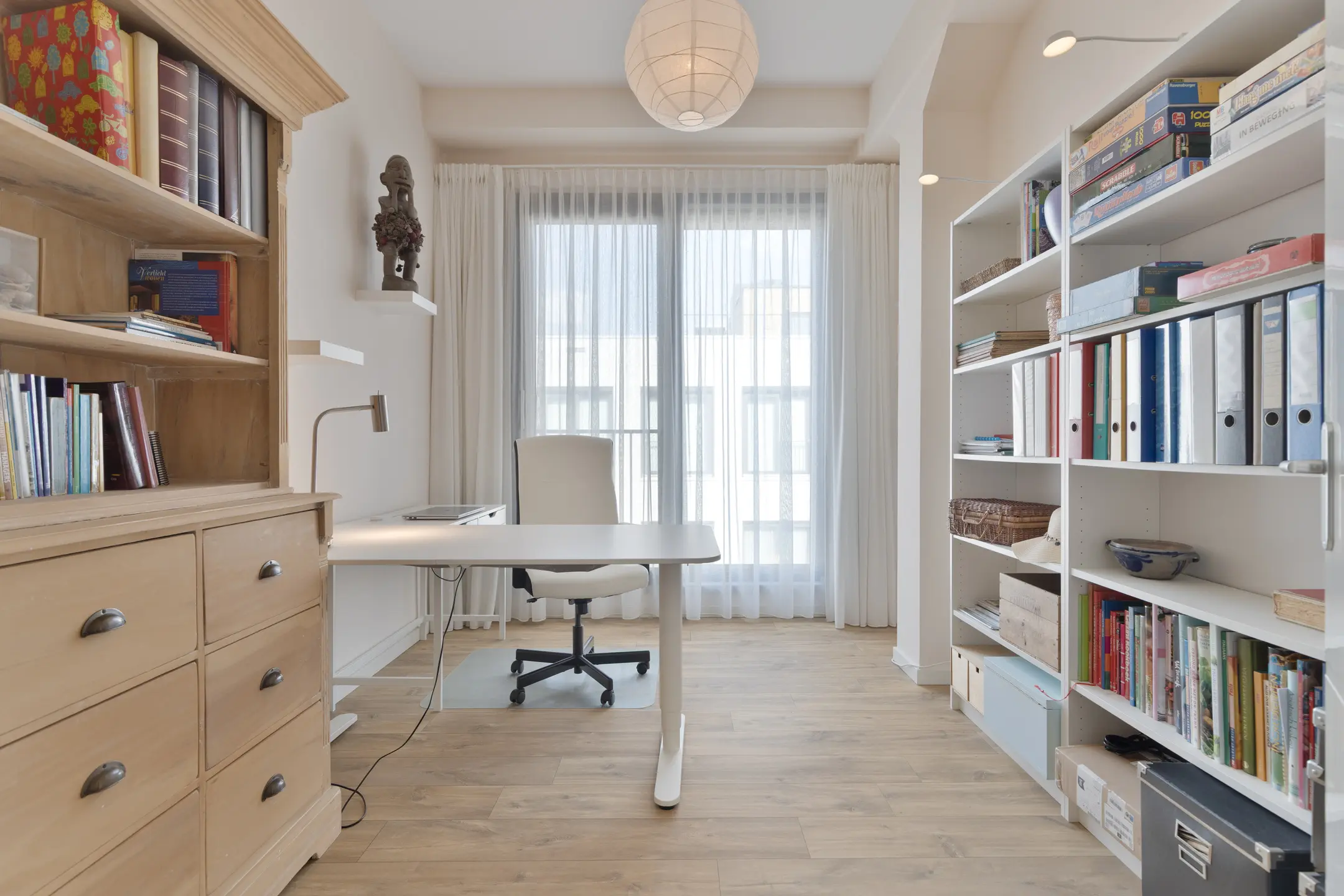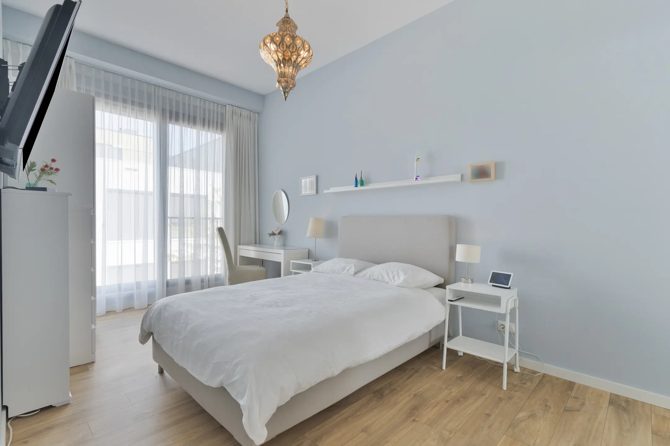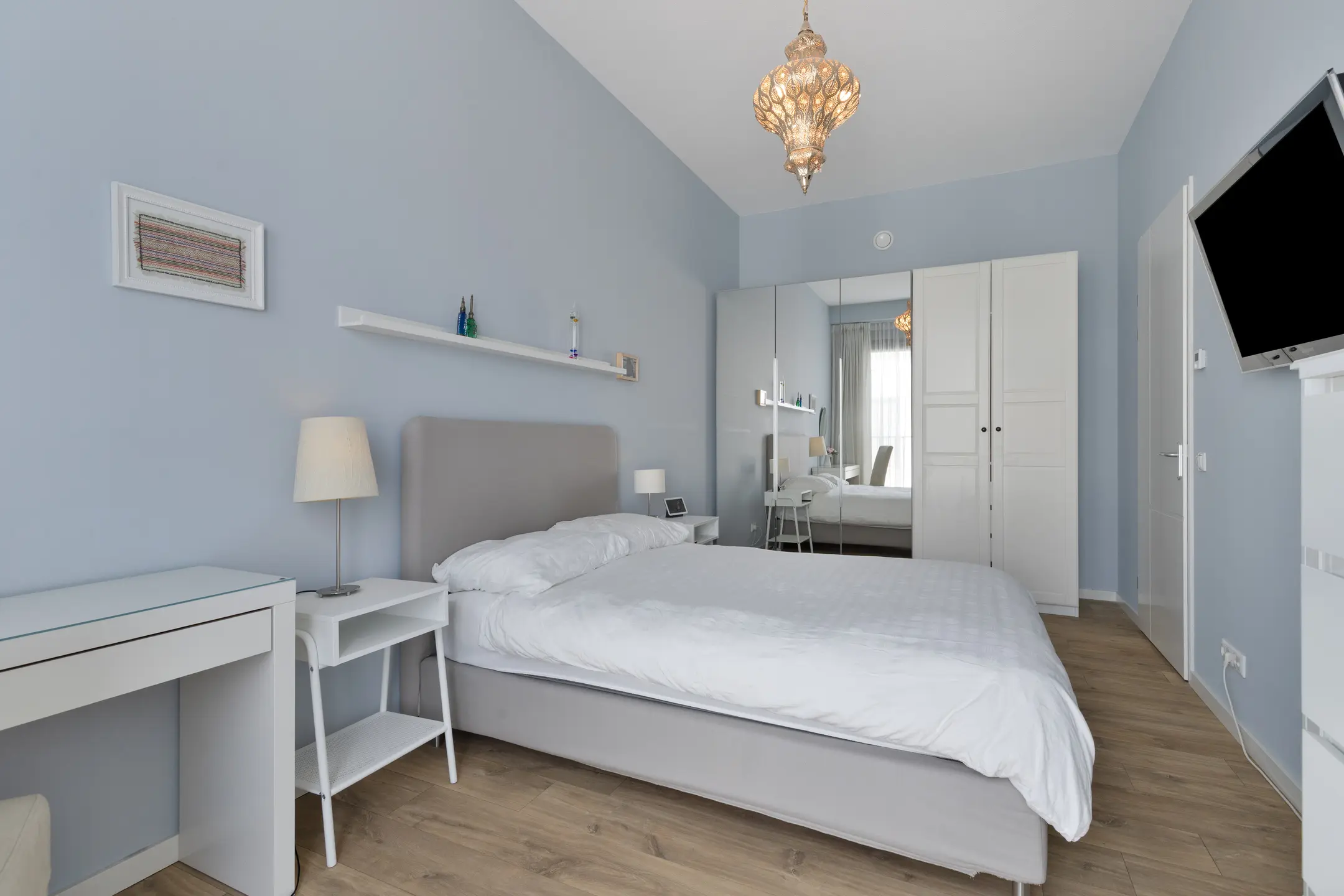 Een stijlvolle gang verbindt de woonkamer met de twee slaapkamers, die beide zijn afgewerkt in dezelfde luxe stijl. De ruime master bedroom biedt voldoende plek voor een groot bed en garderobekast, terwijl de tweede kamer momenteel dienstdoet als comfortabele werkkamer of logeerkamer.