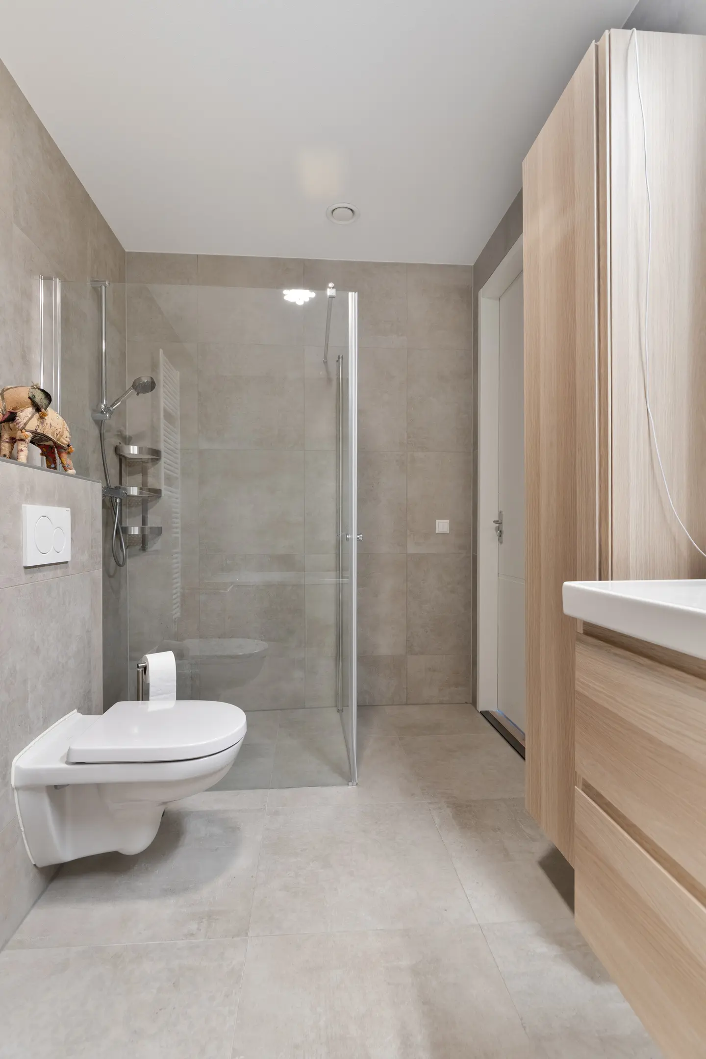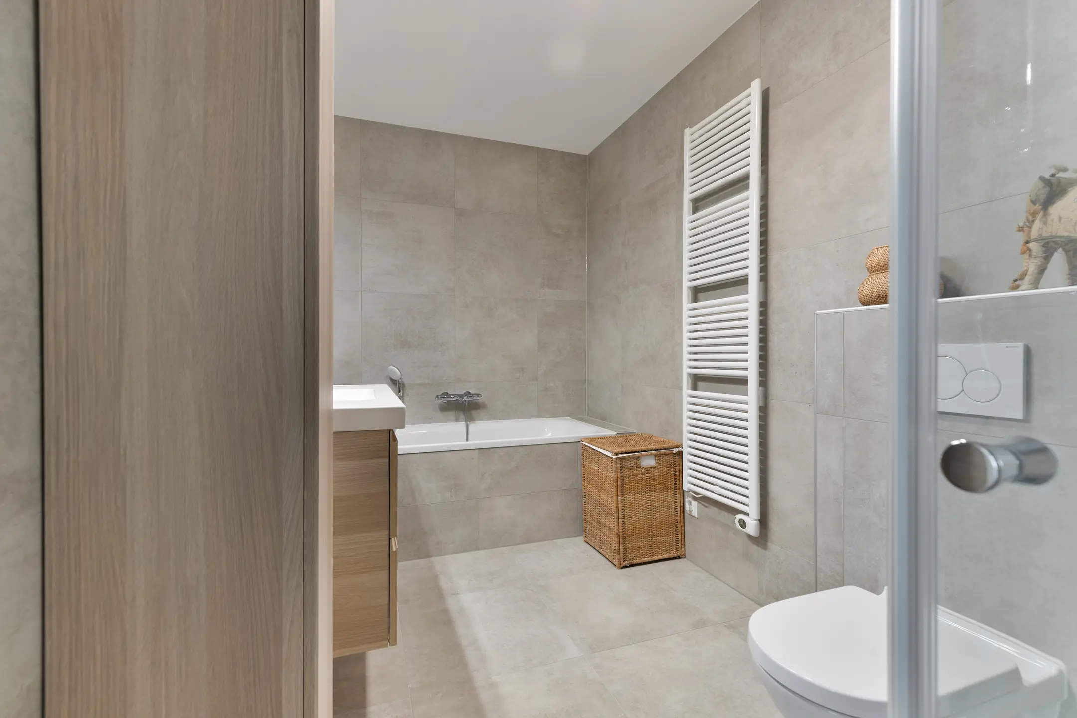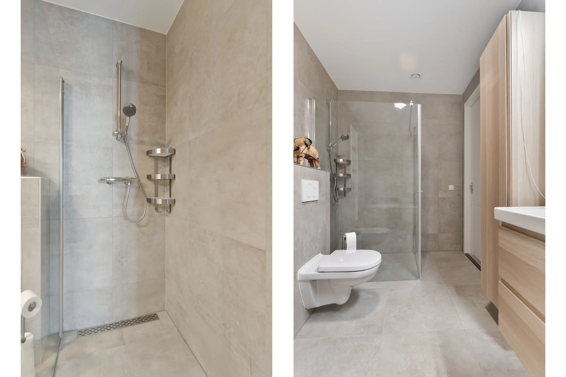De badkamer is een ware wellnessruimte, uitgevoerd met hoogwaardig tegelwerk, een ruim ligbad, een moderne inloopdouche met glazen wand, een tweede toilet en een strak wastafelmeubel met dubbele kraan en veel opbergruimte. Ook hier komt het oog voor detail en afwerking in alles terug.