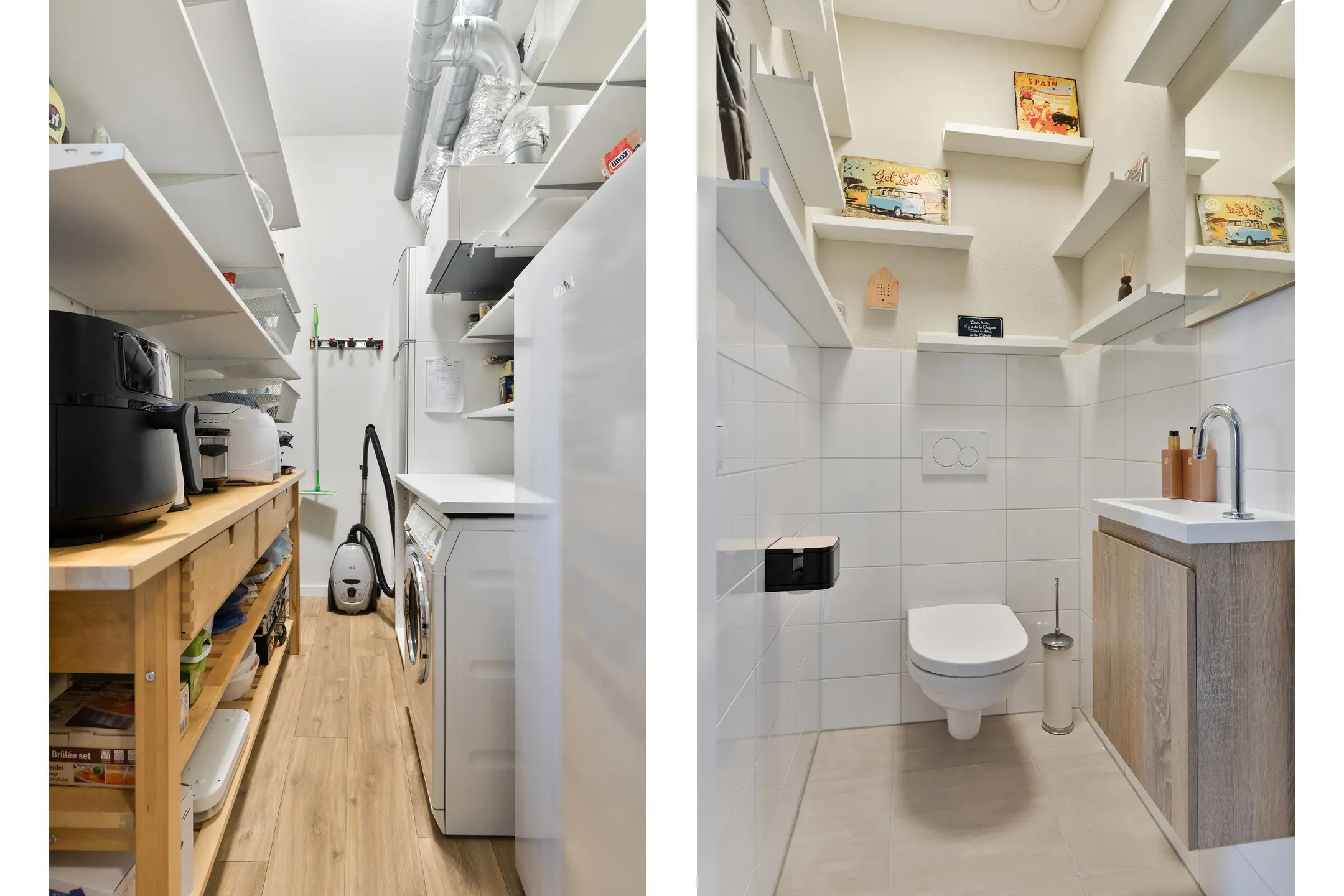 Binnenkomst is in een ruime en lichte hal die direct de toon zet: een hoogwaardige afwerking, strakke lijnen en een sfeervolle, rustige uitstraling. Vanuit de hal heb je toegang tot een modern vormgegeven separaat toilet met luxe tegelwerk en strak sanitair, evenals een praktische berging met ruimte voor wasmachine, droger, opstelplaats warmtepomp en extra opslag.