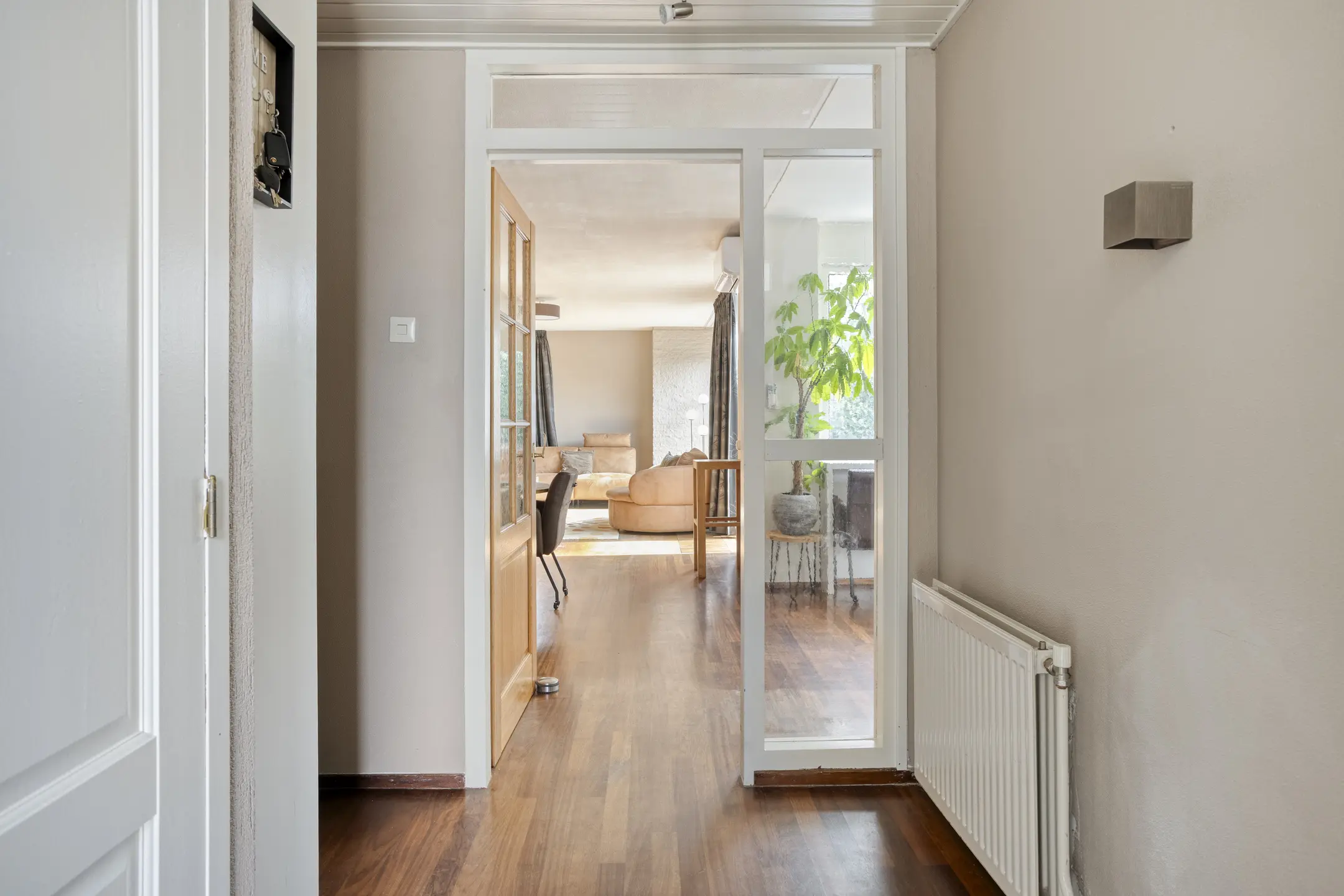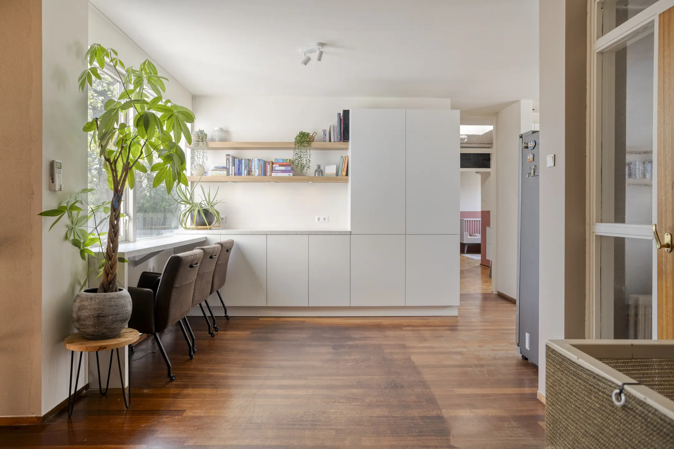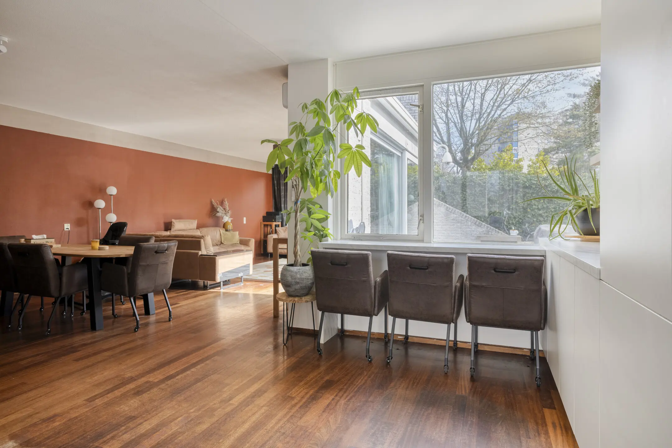Vanuit de hal loopt u door naar de royale woonkamer, waar de grote raampartijen zorgen voor een prachtige lichtinval en een open, frisse uitstraling. De woonkamer biedt volop ruimte voor het creëren van een gezellige zithoek én een ruime eetkameropstelling, waardoor het een heerlijke plek is om samen te komen met familie en vrienden.