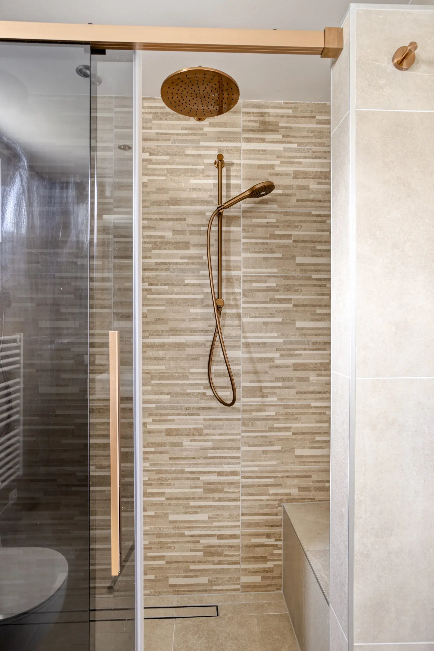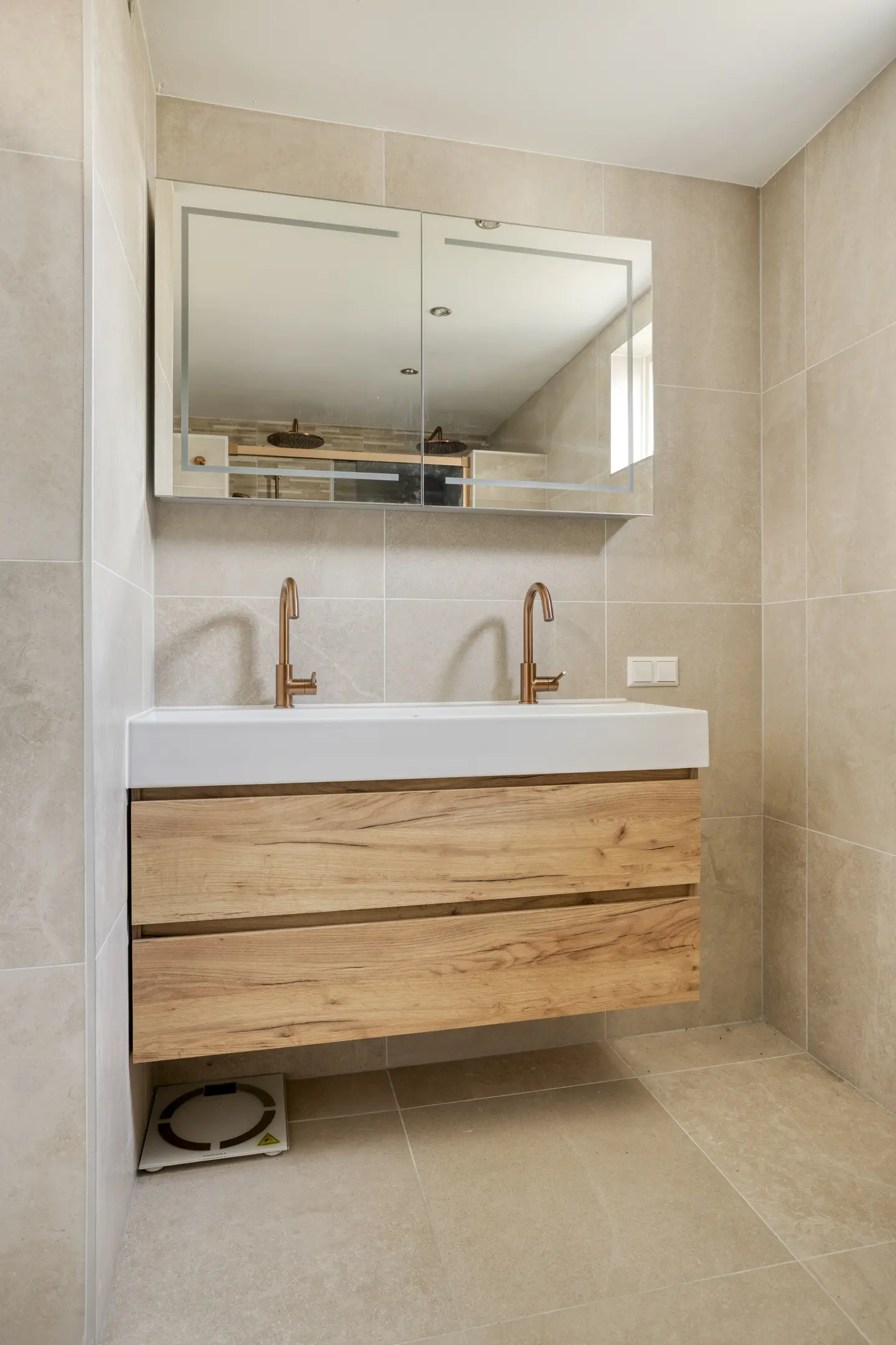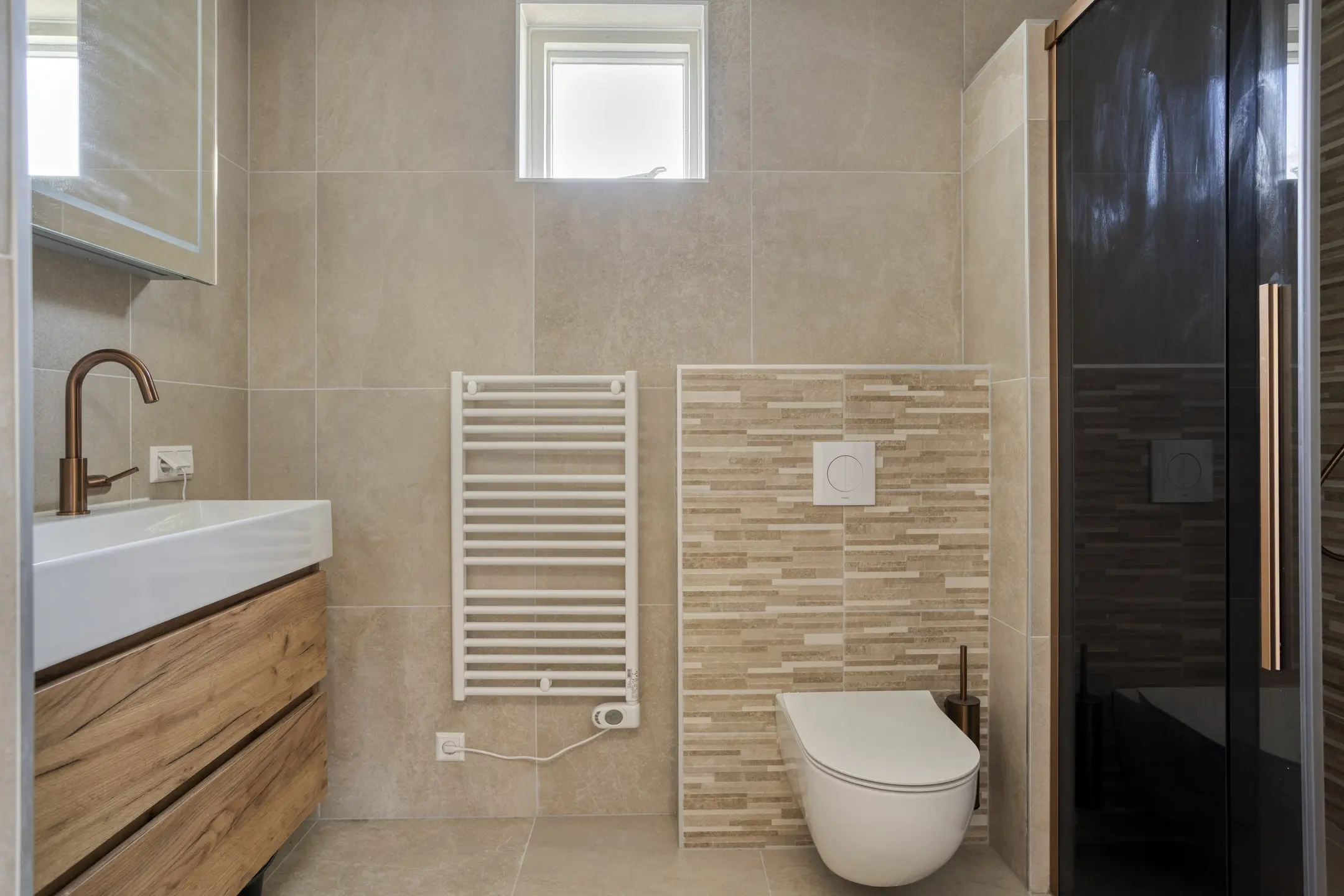 De badkamer is modern en bijzonder stijlvol uitgevoerd (2024) en ademt een gevoel van luxe en comfort. De ruimte is fraai afgewerkt met warme aardetinten tegels, een houtkleurig wastafelmeubel en elegante bronzen kranen, wat zorgt voor een sfeervolle en hoogwaardige uitstraling.