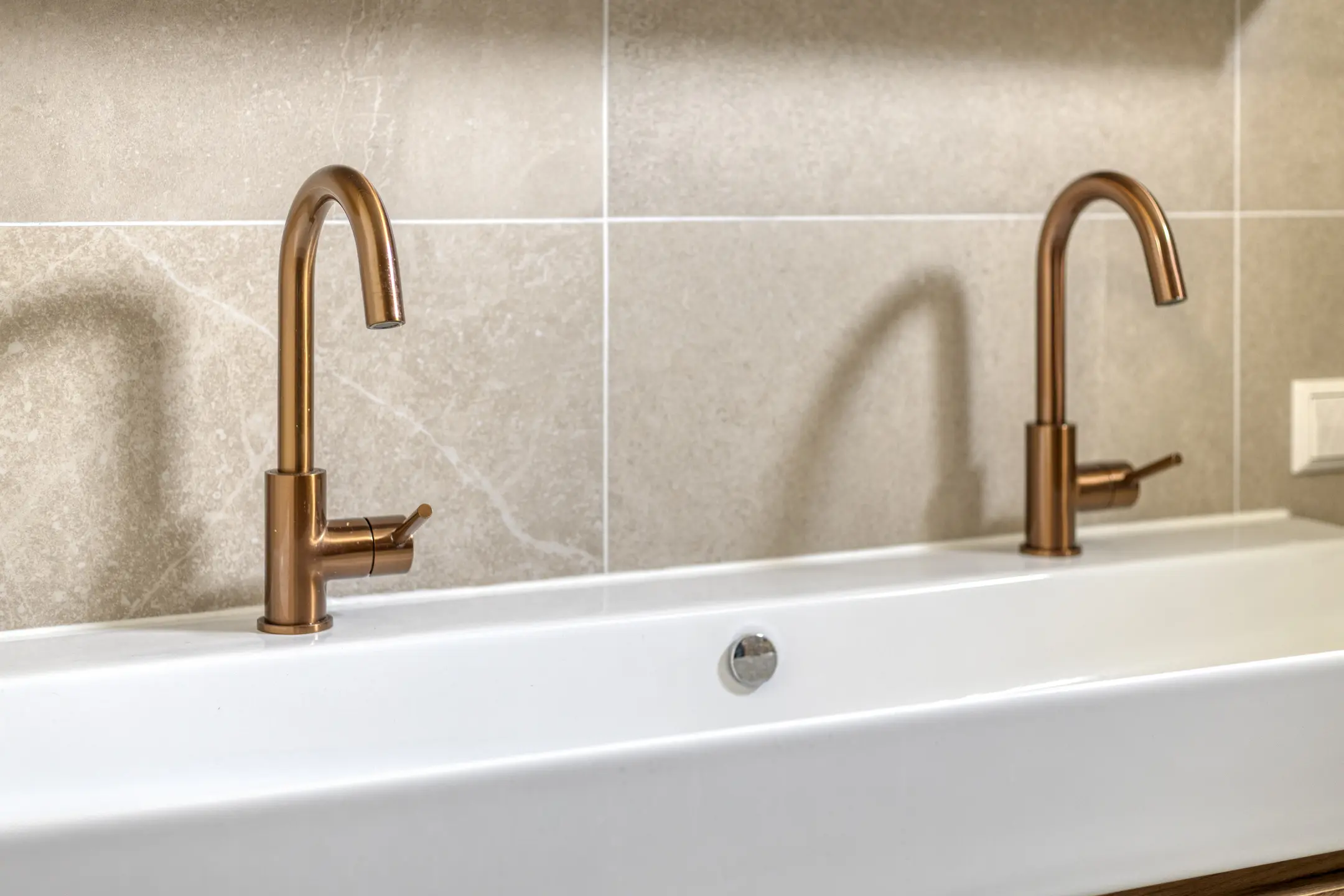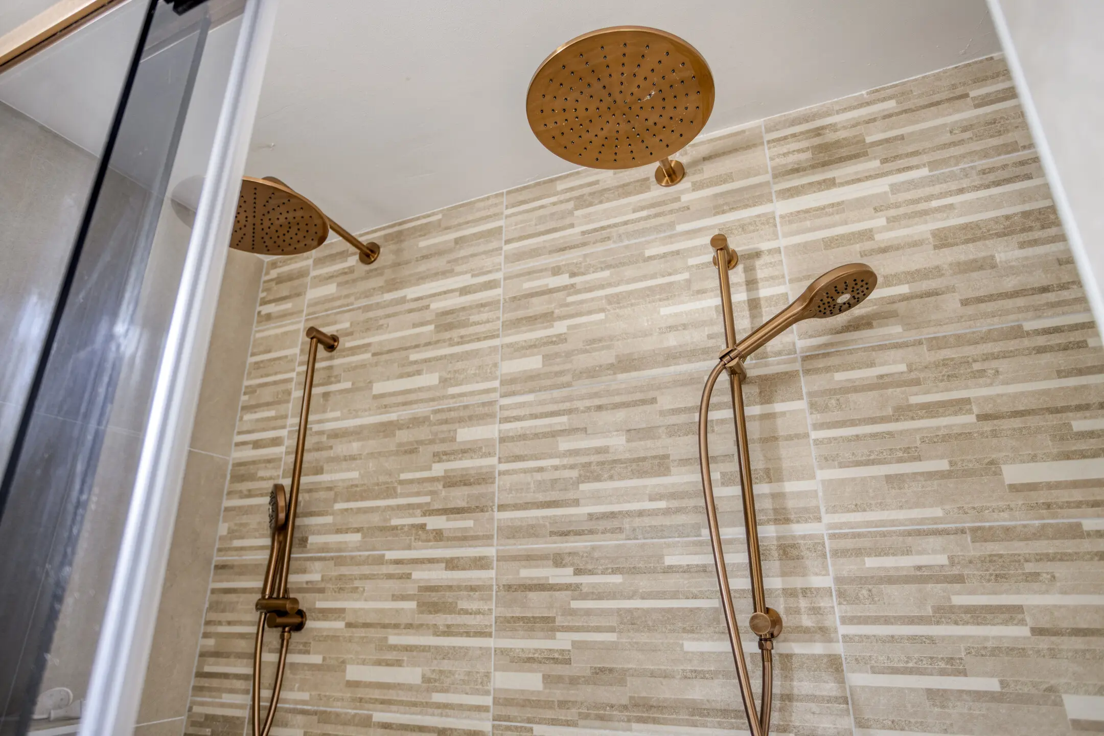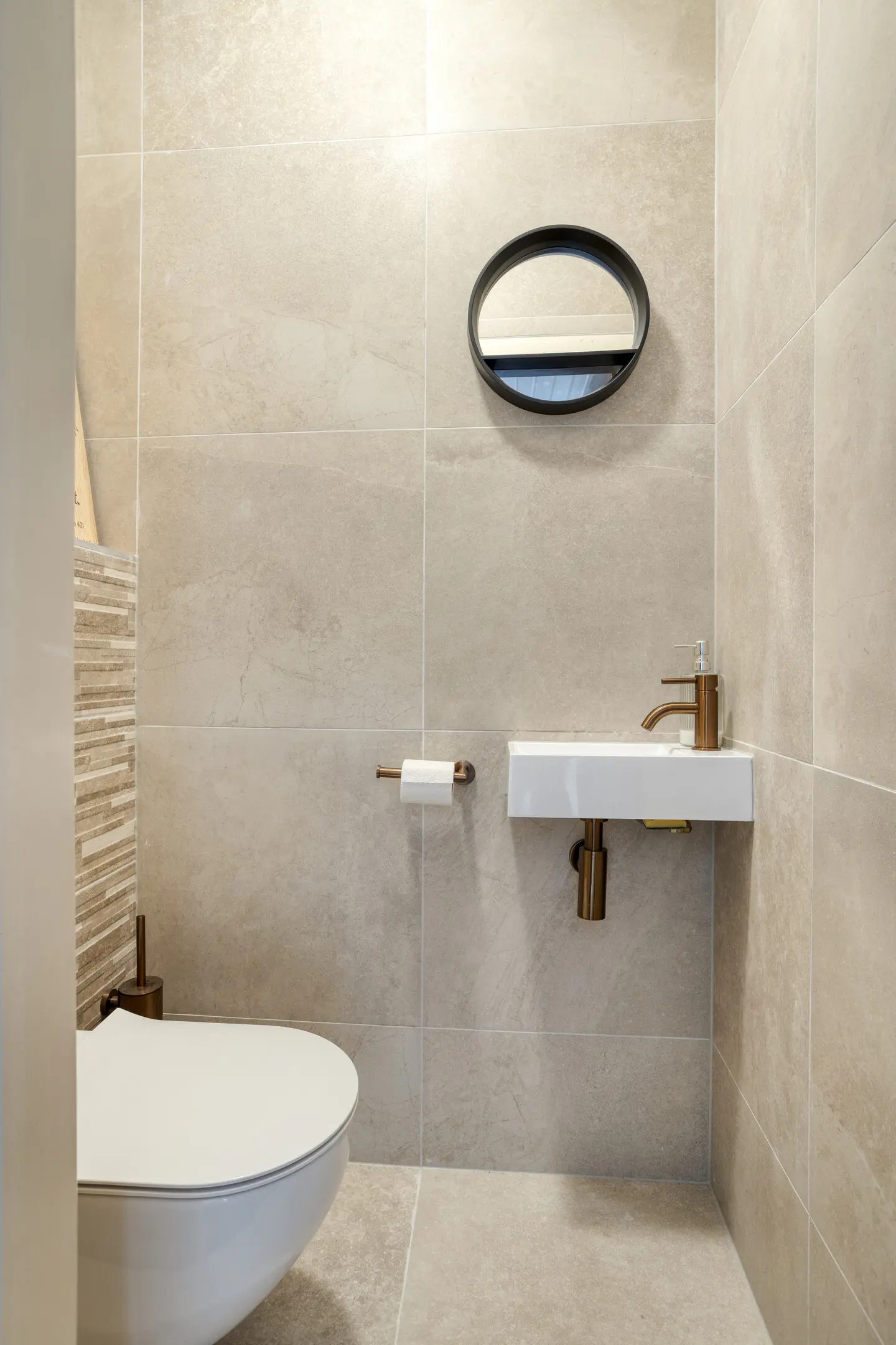 De badkamer is modern en bijzonder stijlvol uitgevoerd (2024) en ademt een gevoel van luxe en comfort. De ruimte is fraai afgewerkt met warme aardetinten tegels, een houtkleurig wastafelmeubel en elegante bronzen kranen, wat zorgt voor een sfeervolle en hoogwaardige uitstraling.