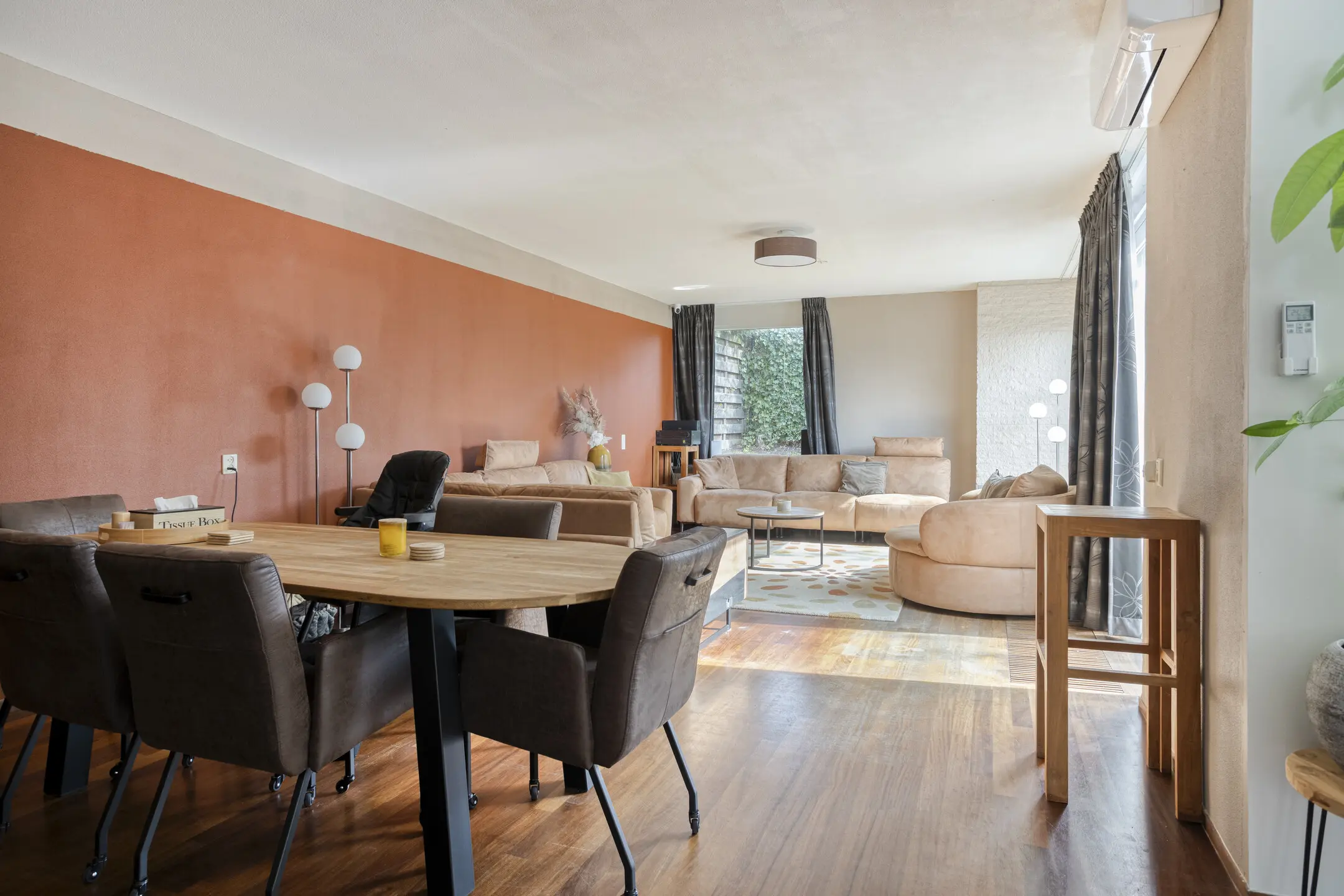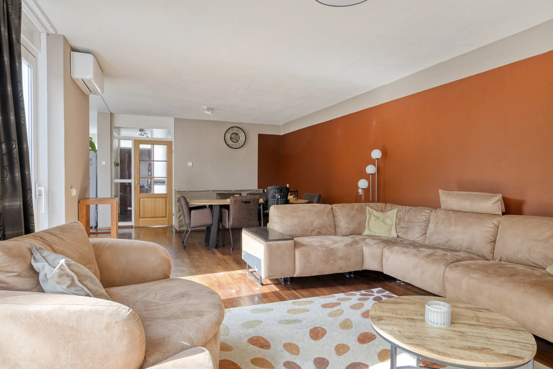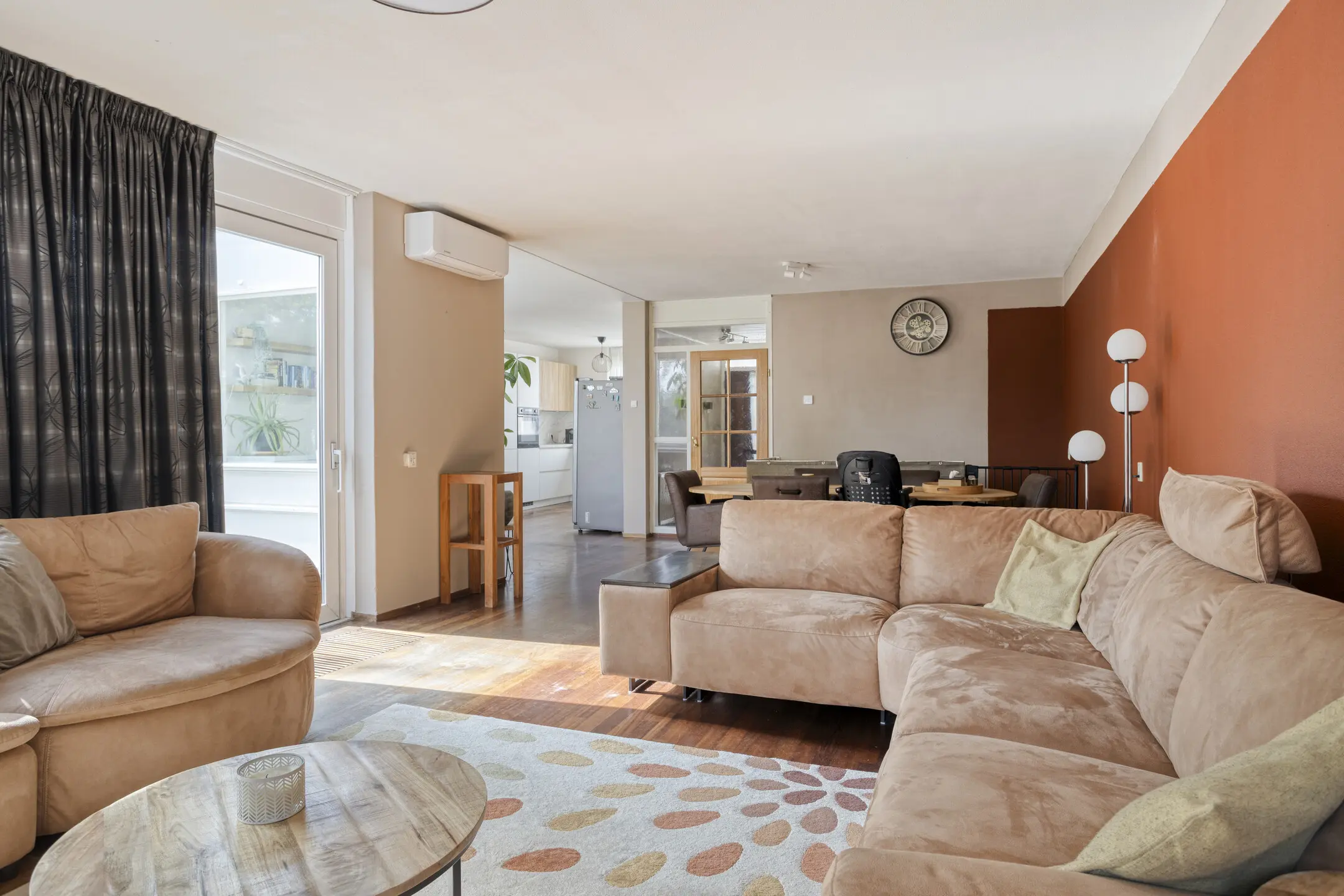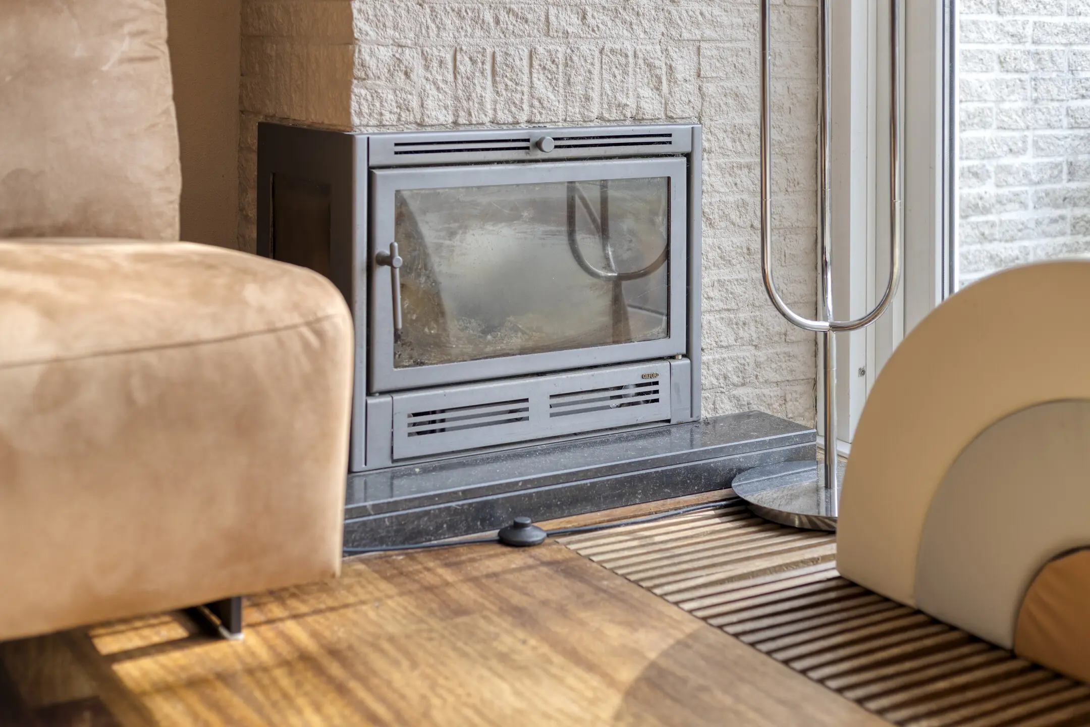 De gezellige open haard en de airco in de woonkamer zorgen voor een fijn woonklimaat.