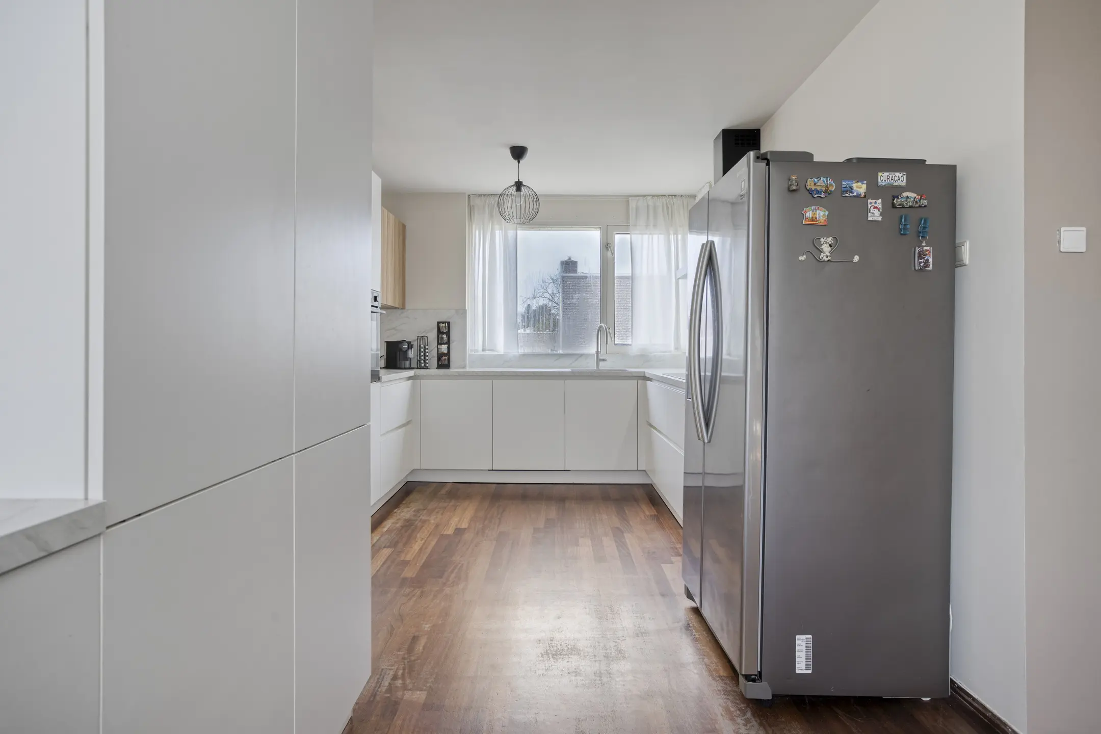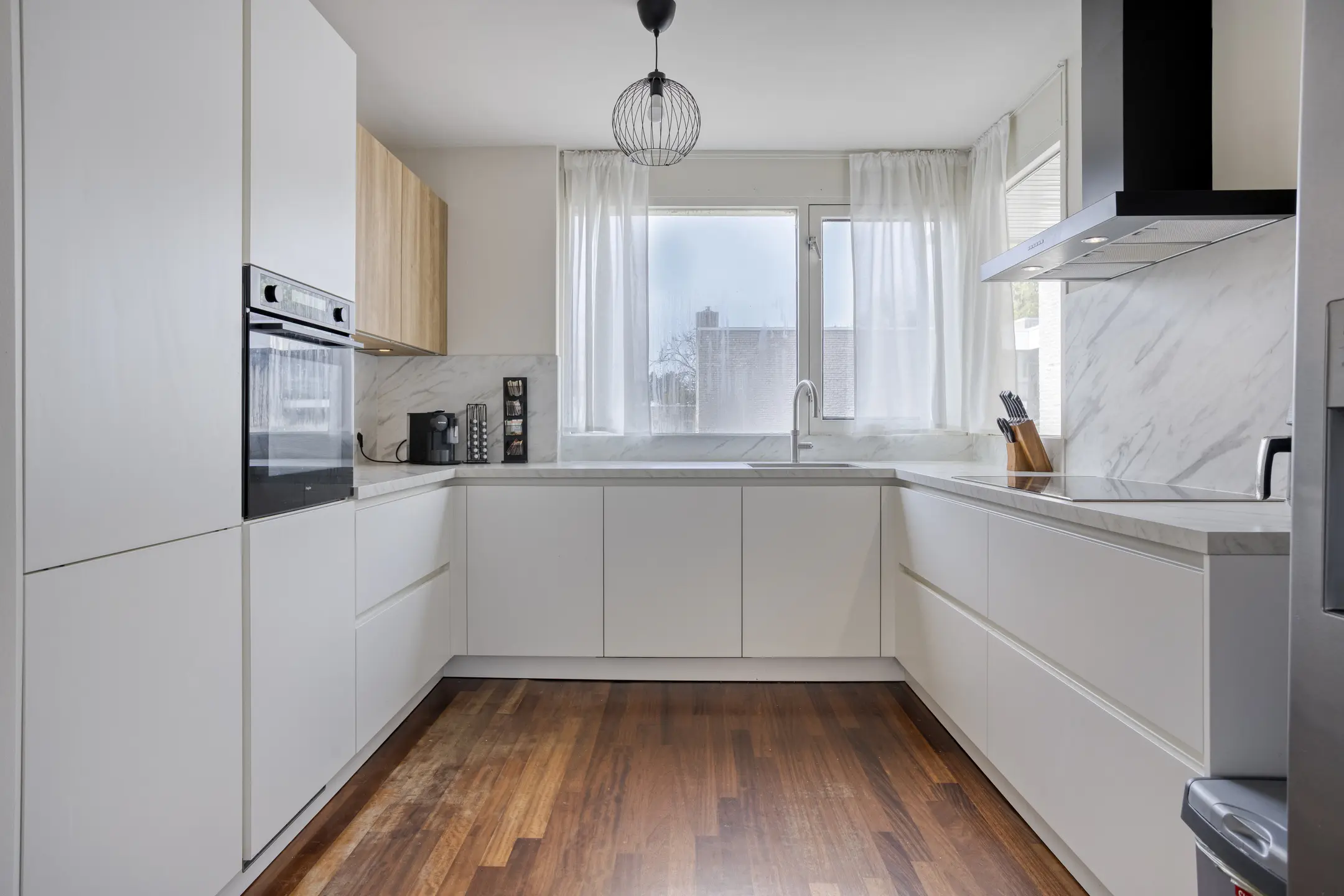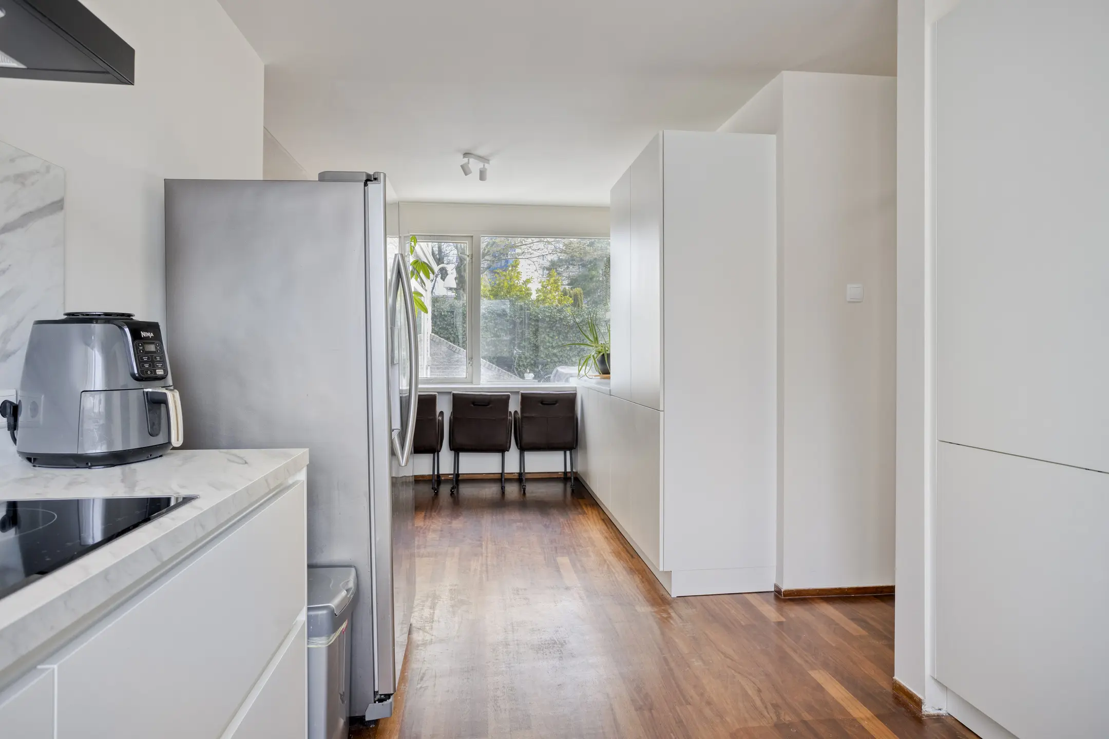 De moderne keuken (2024) sluit naadloos aan op de woonkamer en is praktisch ingericht met diverse hoogwaardige voorzieningen. Zo beschikt de keuken over een spoelbak met een Quooker, inductiekookplaat, afzuigsysteem, combi oven-/magnetron en een vaatwasser. Daarnaast is er volop bergruimte aanwezig dankzij de verschillende laden en kasten, waardoor koken hier niet alleen comfortabel maar ook overzichtelijk is.