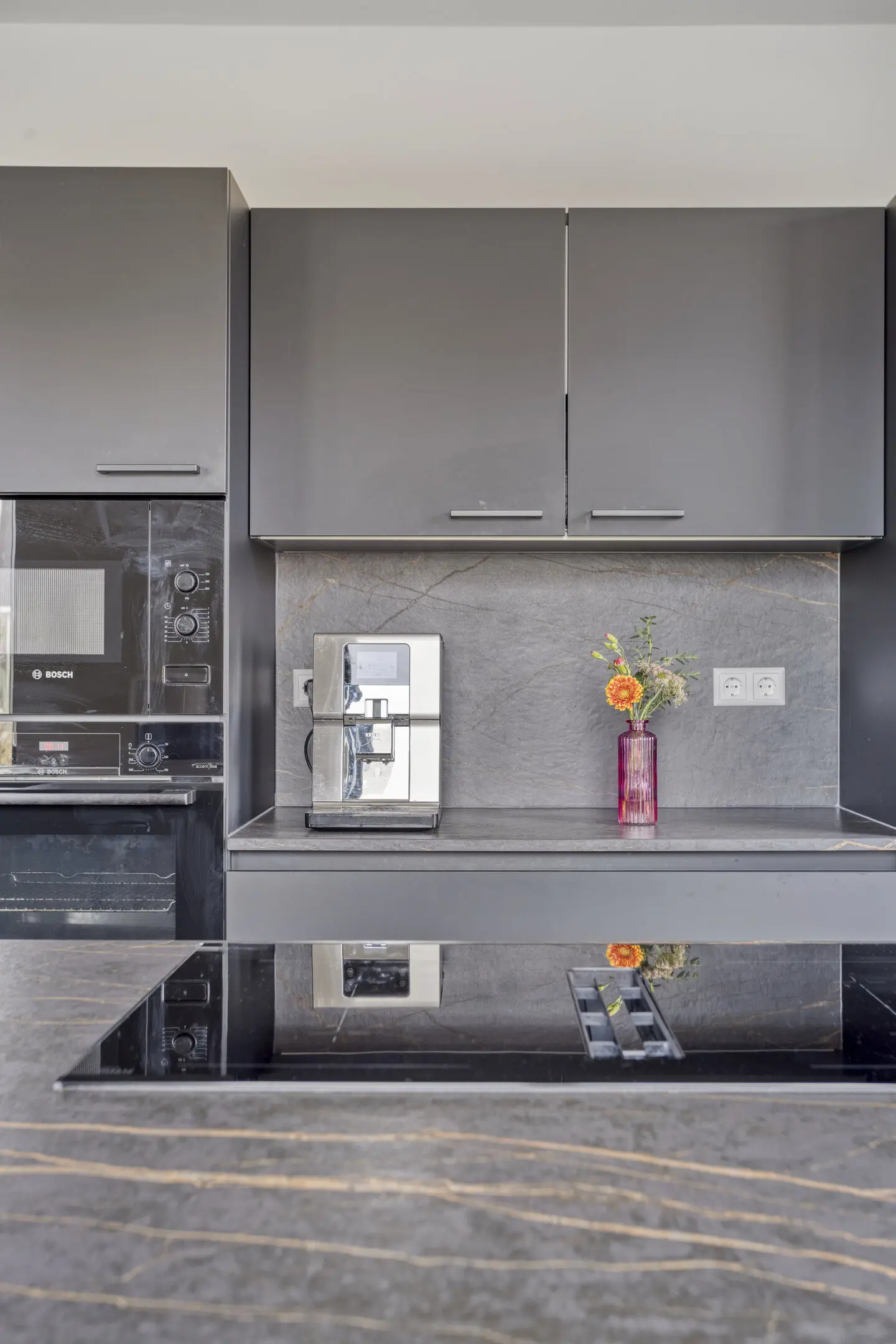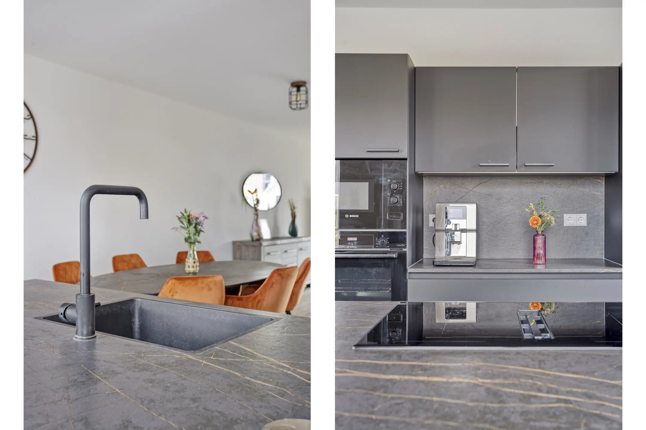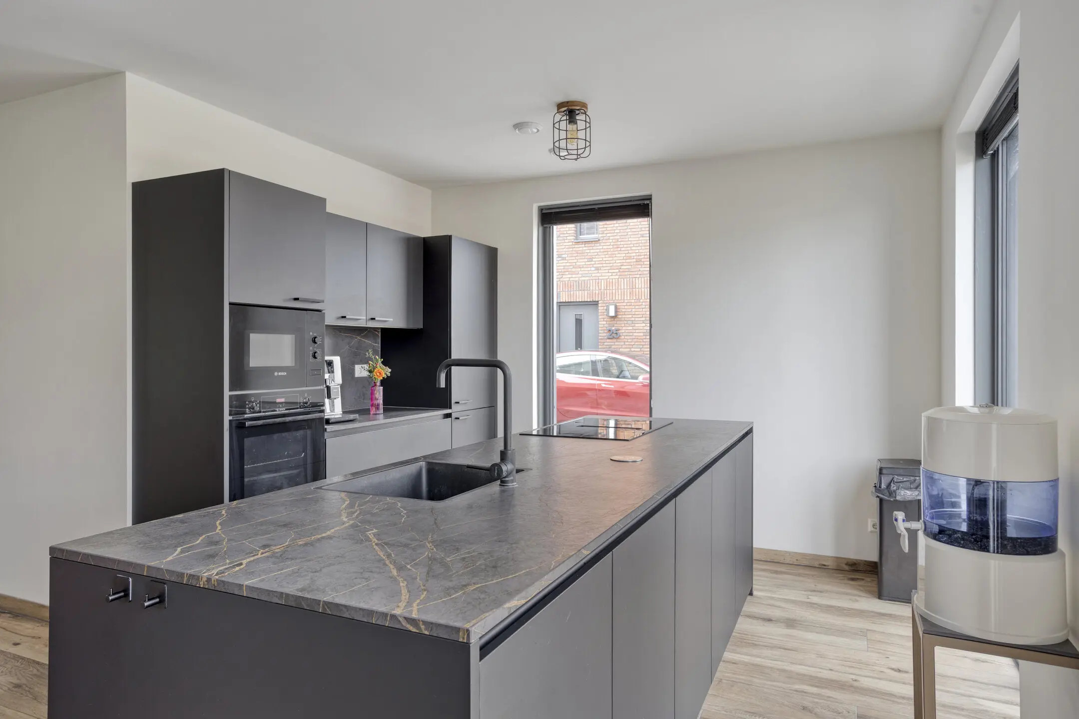 De open keuken is een schitterend, modern hart van de woning en is gelegen aan de voorzijde van de woning. Het kookeiland nodigt uit tot koken en samenzijn, met een inductiekookplaat met geïntegreerd afzuigsysteem en een ruime werkruimte rondom de spoelbak. Het eiland biedt ook extra opbergruimte en plek om samen te genieten van een ontbijt of een diner. Het vaste keukendeel is voorzien van hoogwaardige inbouwapparatuur (Bosch)– alles van topkwaliteit en volledig nieuw. De keuken is voorzien van dekton werkbladen.