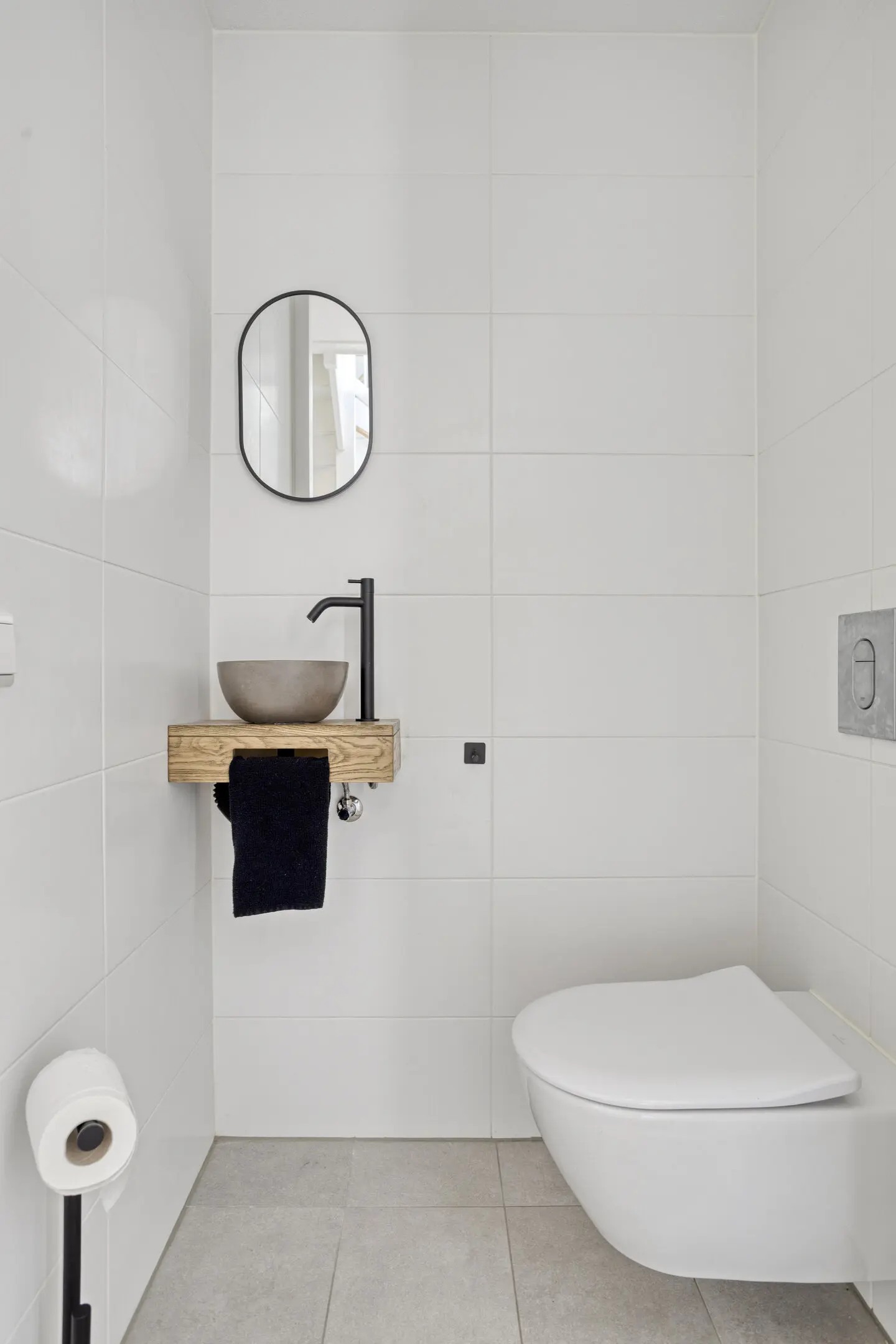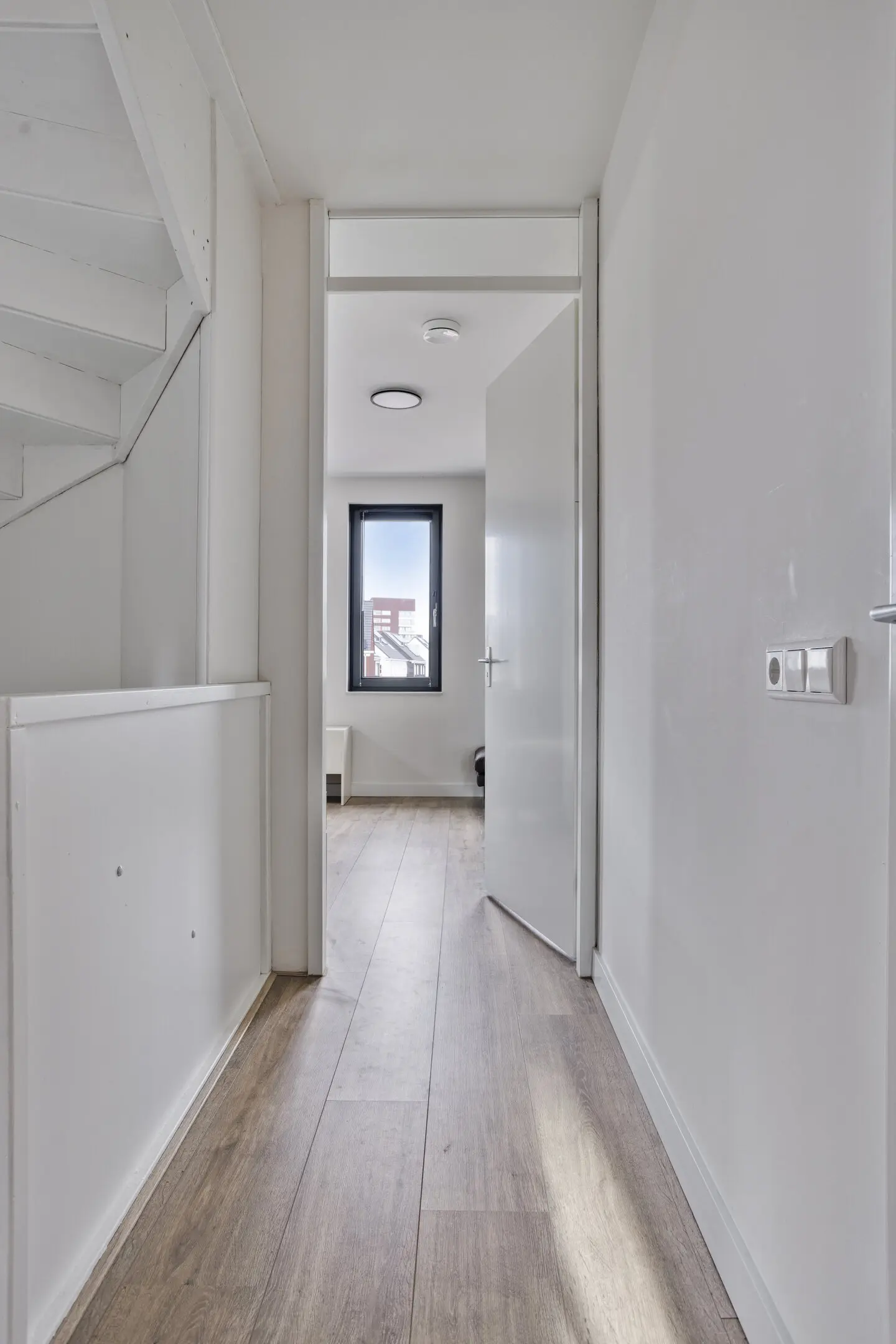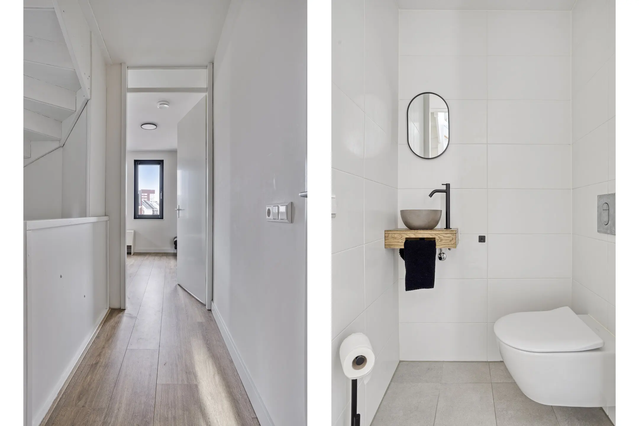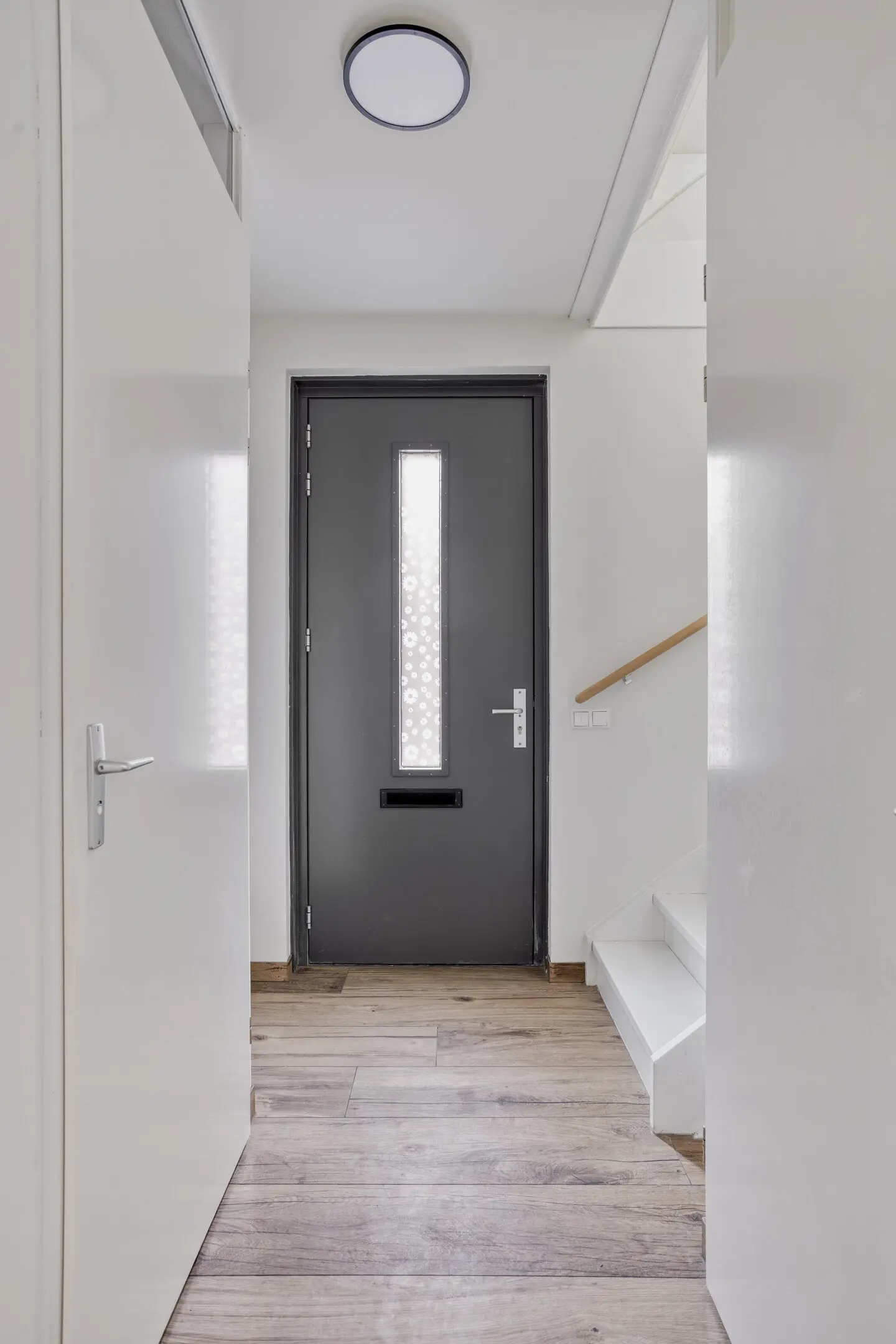 Via je eigen oprit bereik je de voordeur (aan de zijkant van de woning), welke toegang geeft tot een lichte hal met trapopgang, modern toilet en doorgang naar de woonkamer. Een elegante zwarte deur leidt je naar de woonkamer.