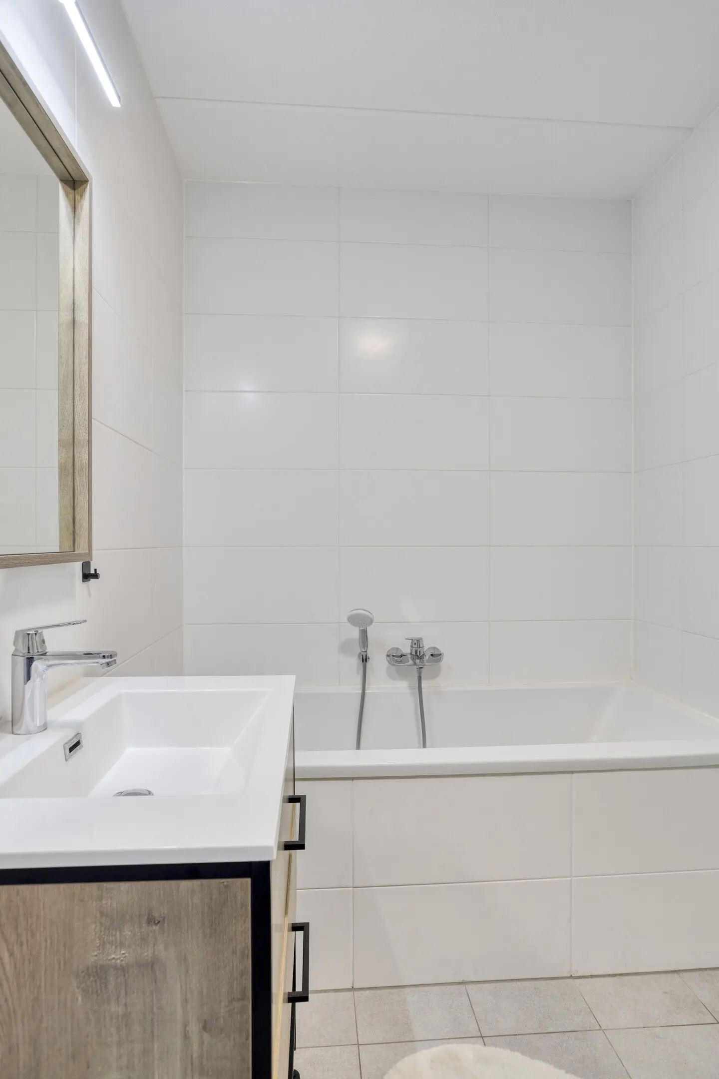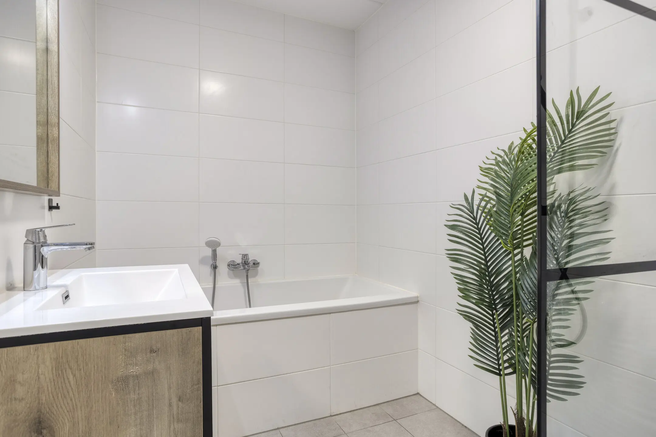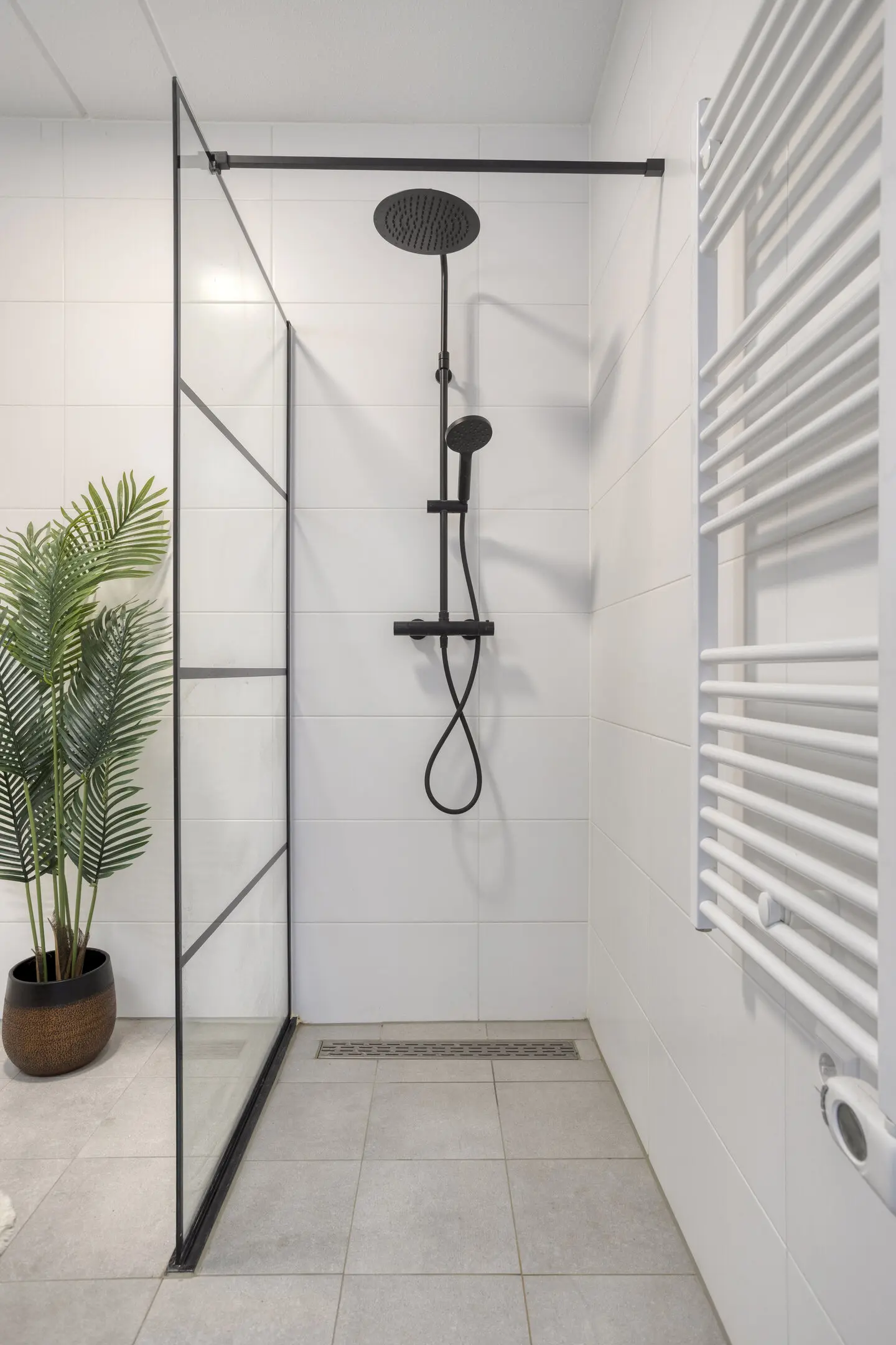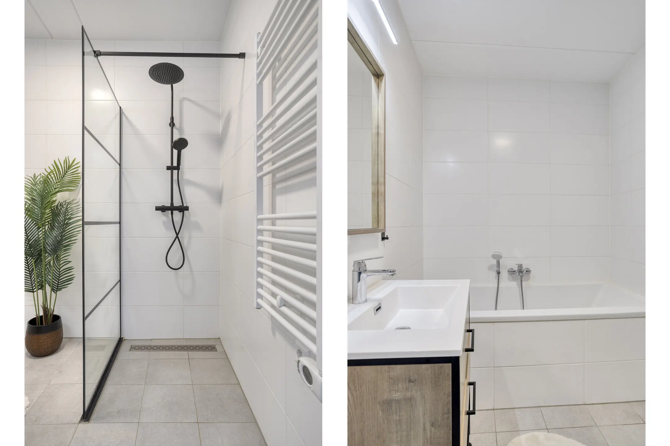De badkamer straalt rust en luxe uit, met een ligbad, inloopdouche, wastafel met meubel, handdoekenradiator en vloerverwarming. Hier geniet je elke dag van een wellness-gevoel thuis.