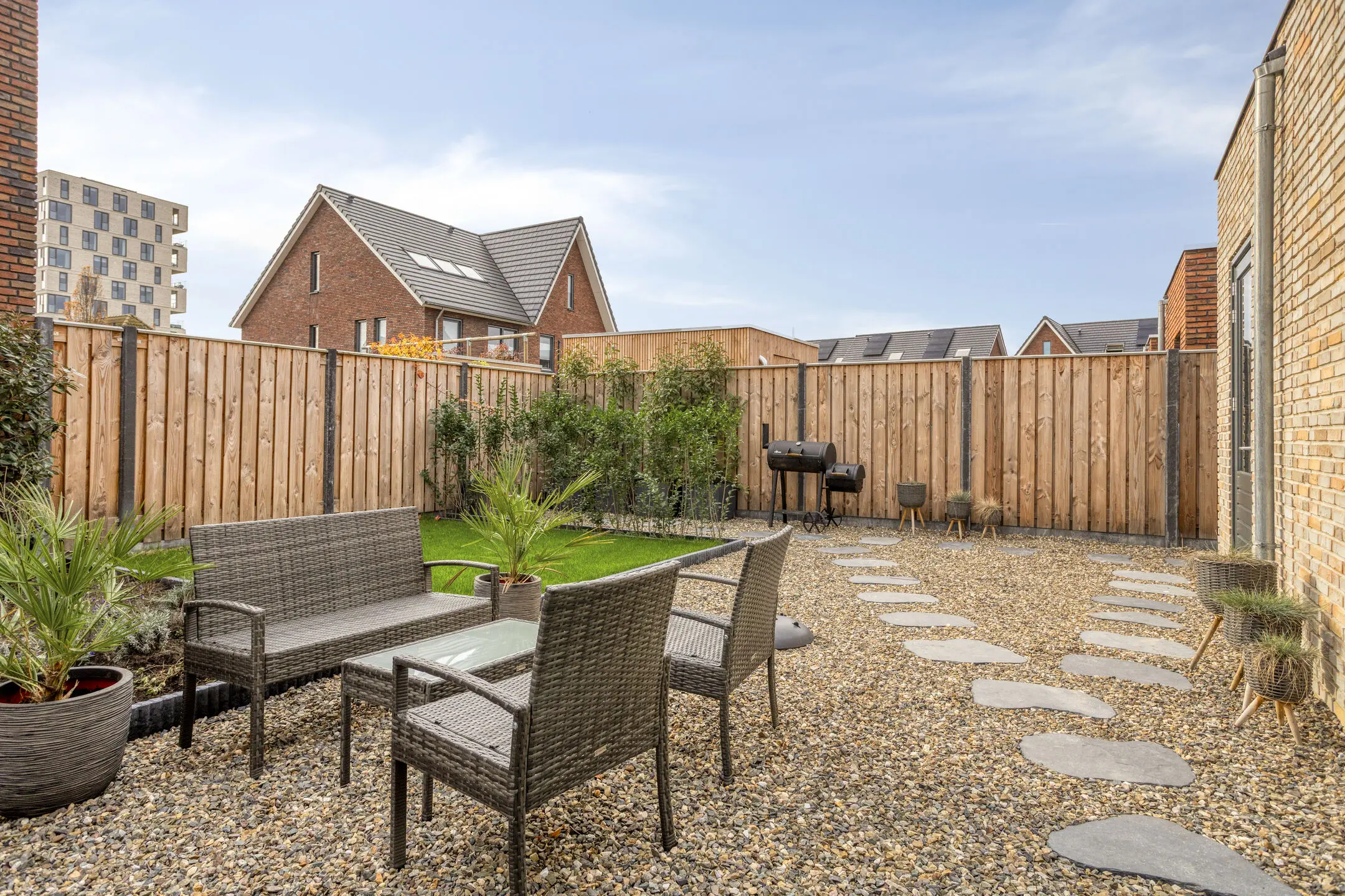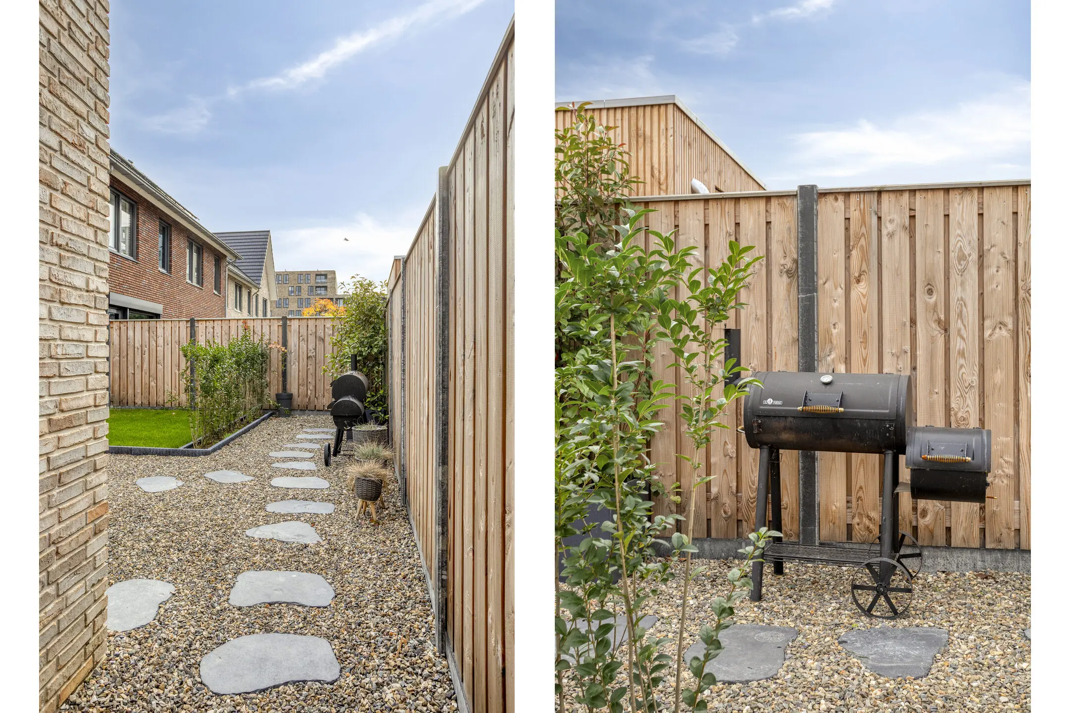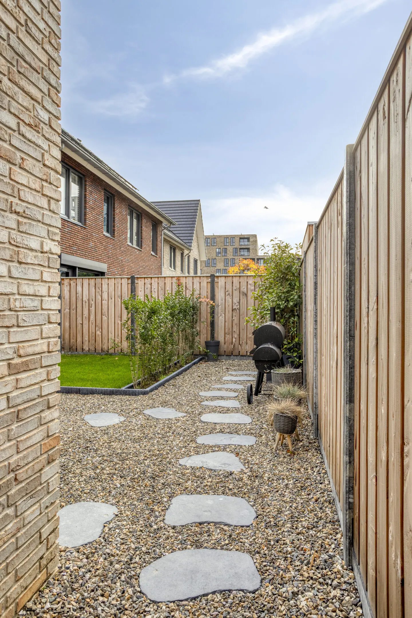 De achtertuin is verzorgd aangelegd, deels met grind en een gazon, en biedt een achterom en toegang tot de berging. Een plek om in de zomer te genieten van zon, groen en gezellige buitenmomenten. De gehele achtertuin is voorzien van een drainage systeem.