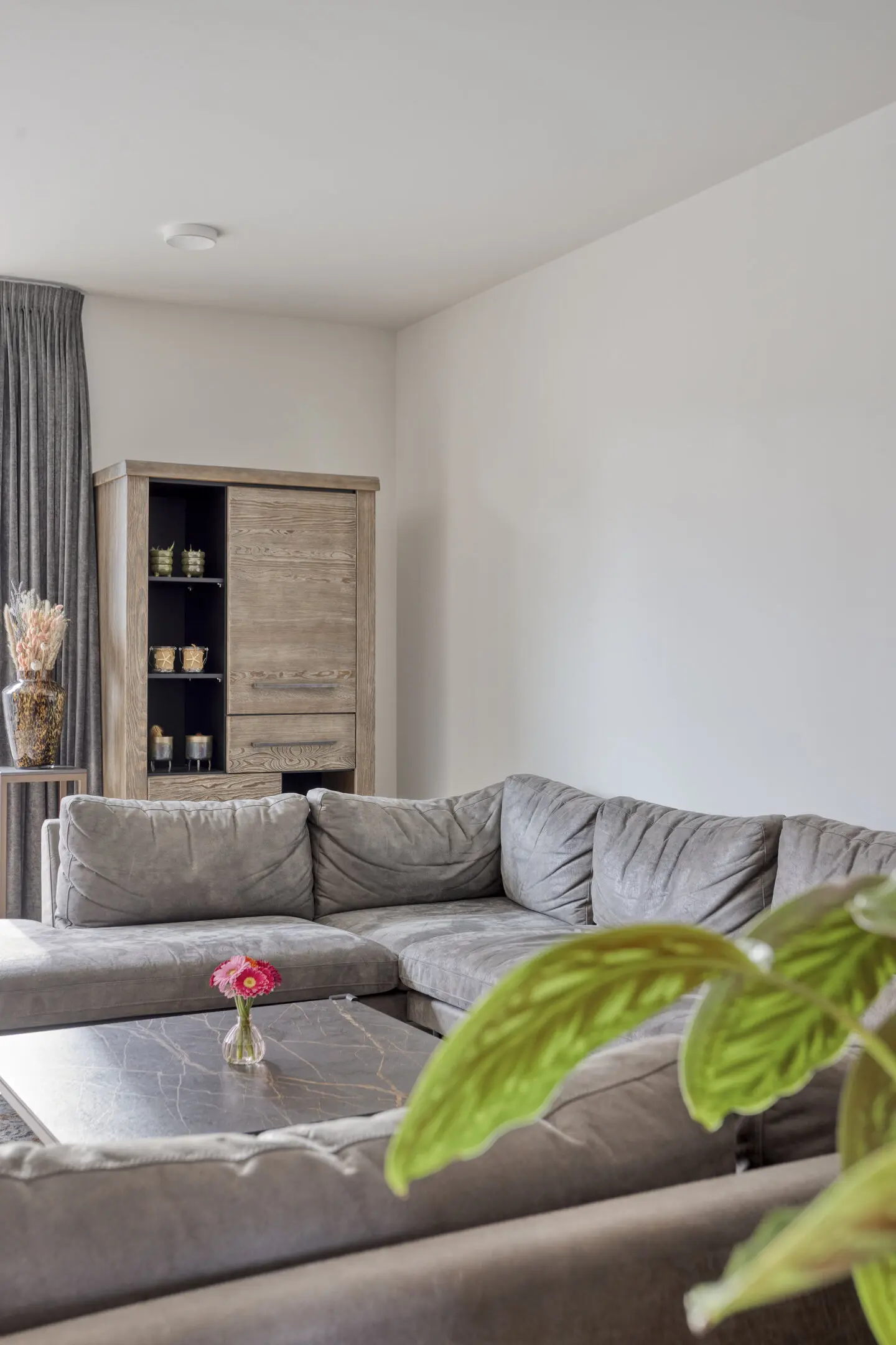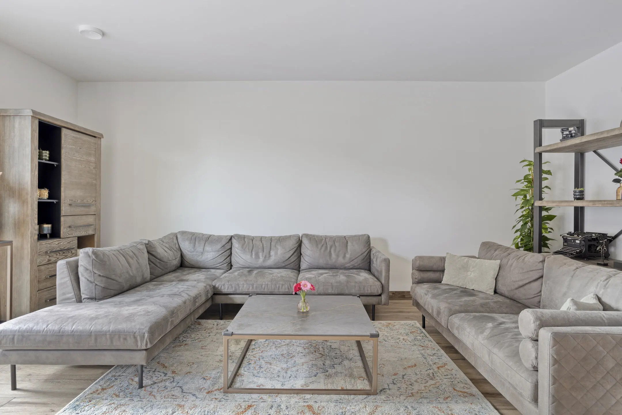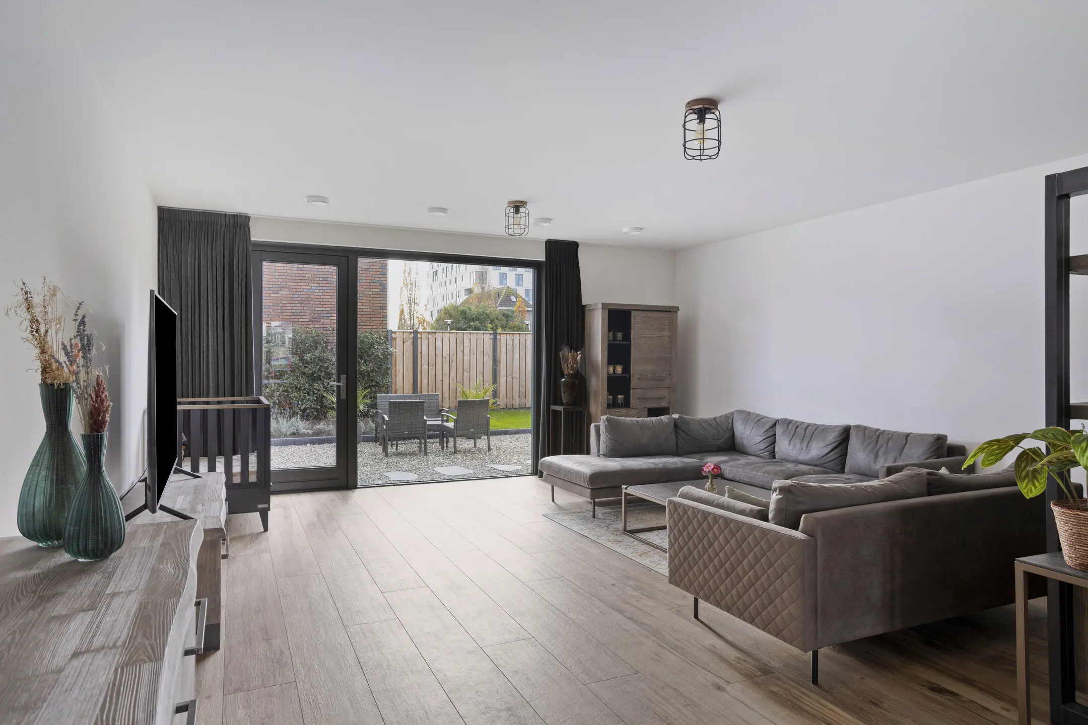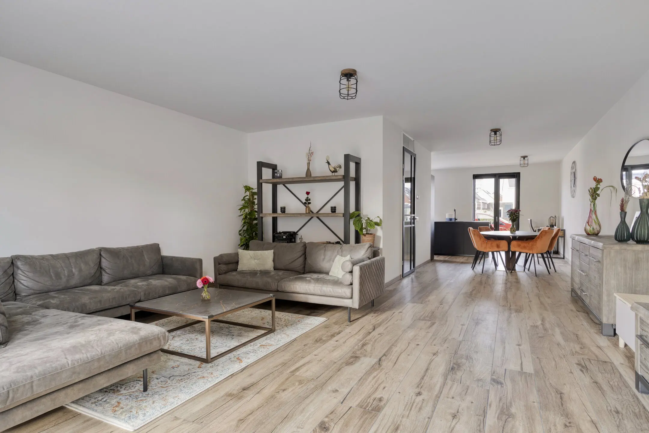 Stap binnen in de riante woonkamer, waar ruimte en licht meteen opvallen. De warme houtkleurige tegelvloer loopt door het hele vertrek en geeft een gevoel van elegantie en gezelligheid. Dankzij de grote glazen pui met loopdeur valt er volop daglicht naar binnen en wordt het contact met de achtertuin prachtig geïntegreerd, waardoor binnen en buiten als het ware één worden. De woonkamer biedt voldoende plek voor een royale zithoek, comfortabele fauteuils en stijlvolle accenten, zodat je een echte leefruimte kunt creëren waarin zowel ontspanning als samenzijn centraal staat.