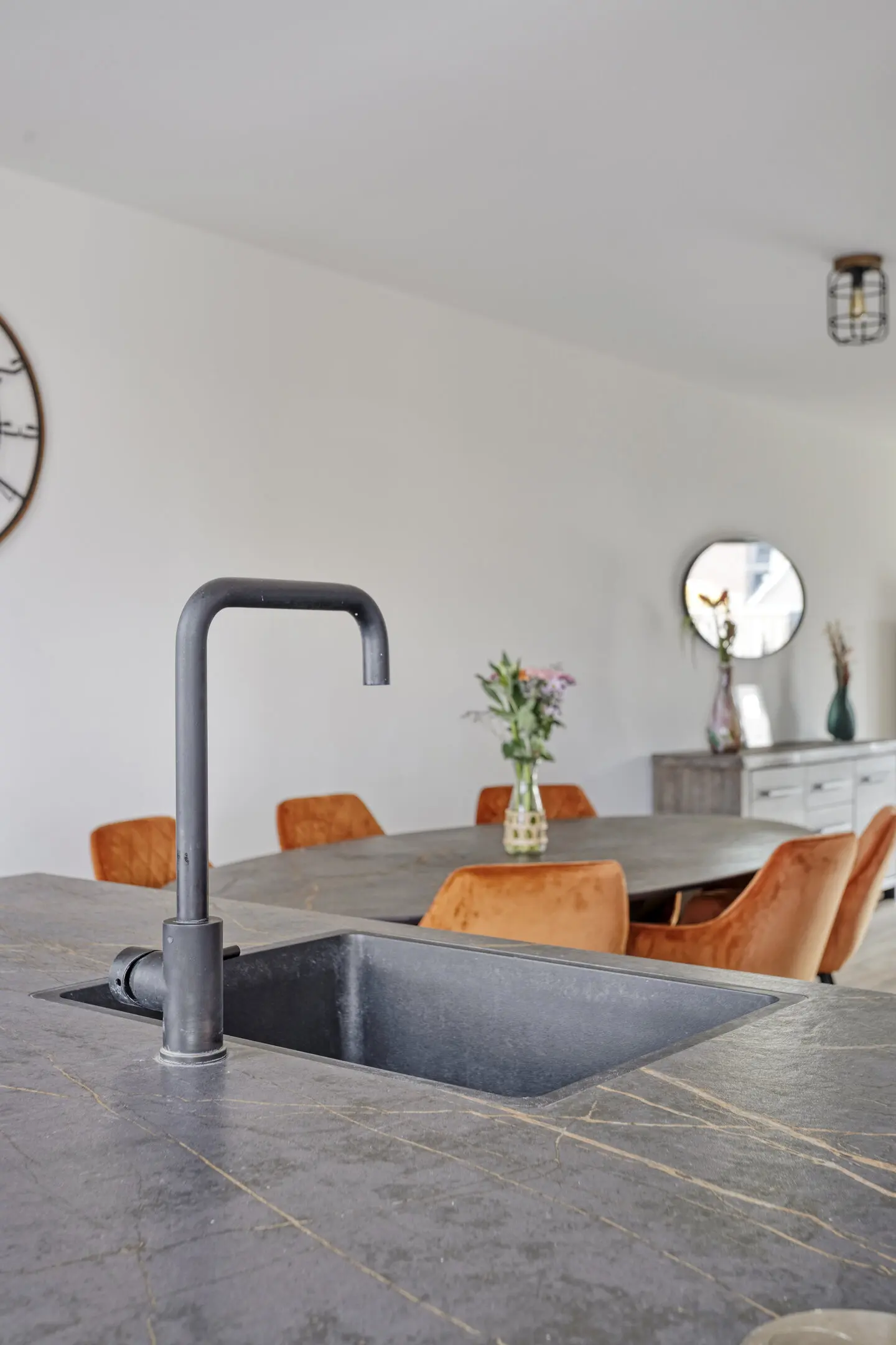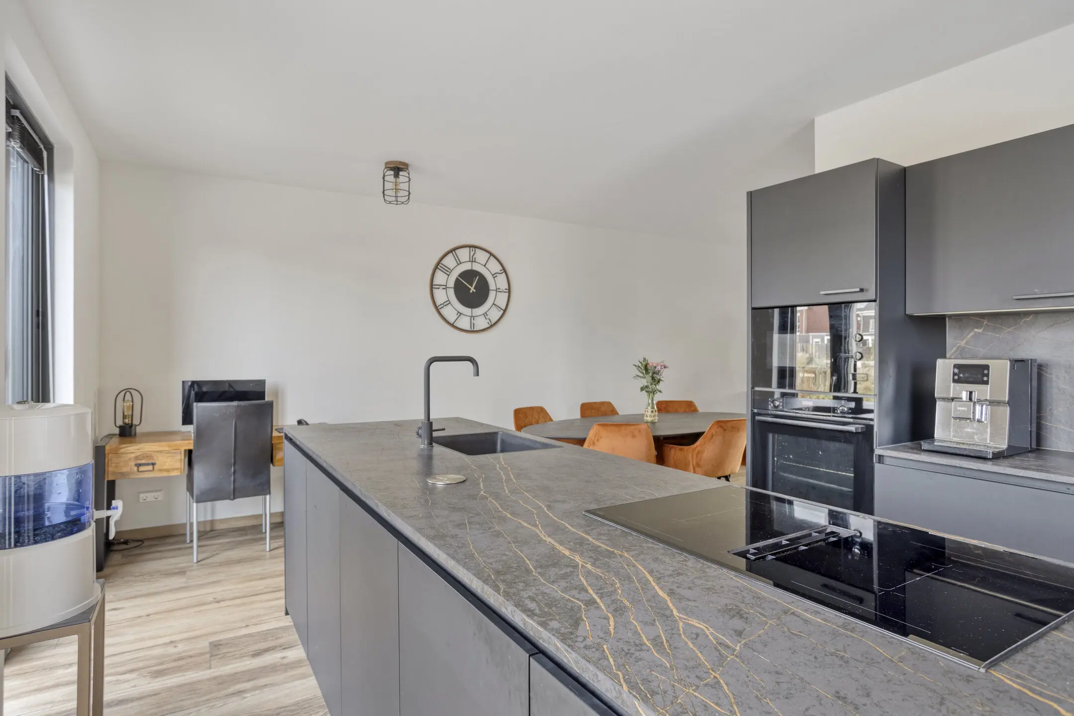 De keuken wordt omringd door grote raampartijen, waardoor er de hele dag door natuurlijk licht binnenvalt en je uitzicht hebt op de voortuin en het water. Dankzij de open verbinding met de woonkamer en het eetgedeelte ontstaat een lichte, sociale leefruimte waarin koken, eten en ontspannen naadloos samenkomen.