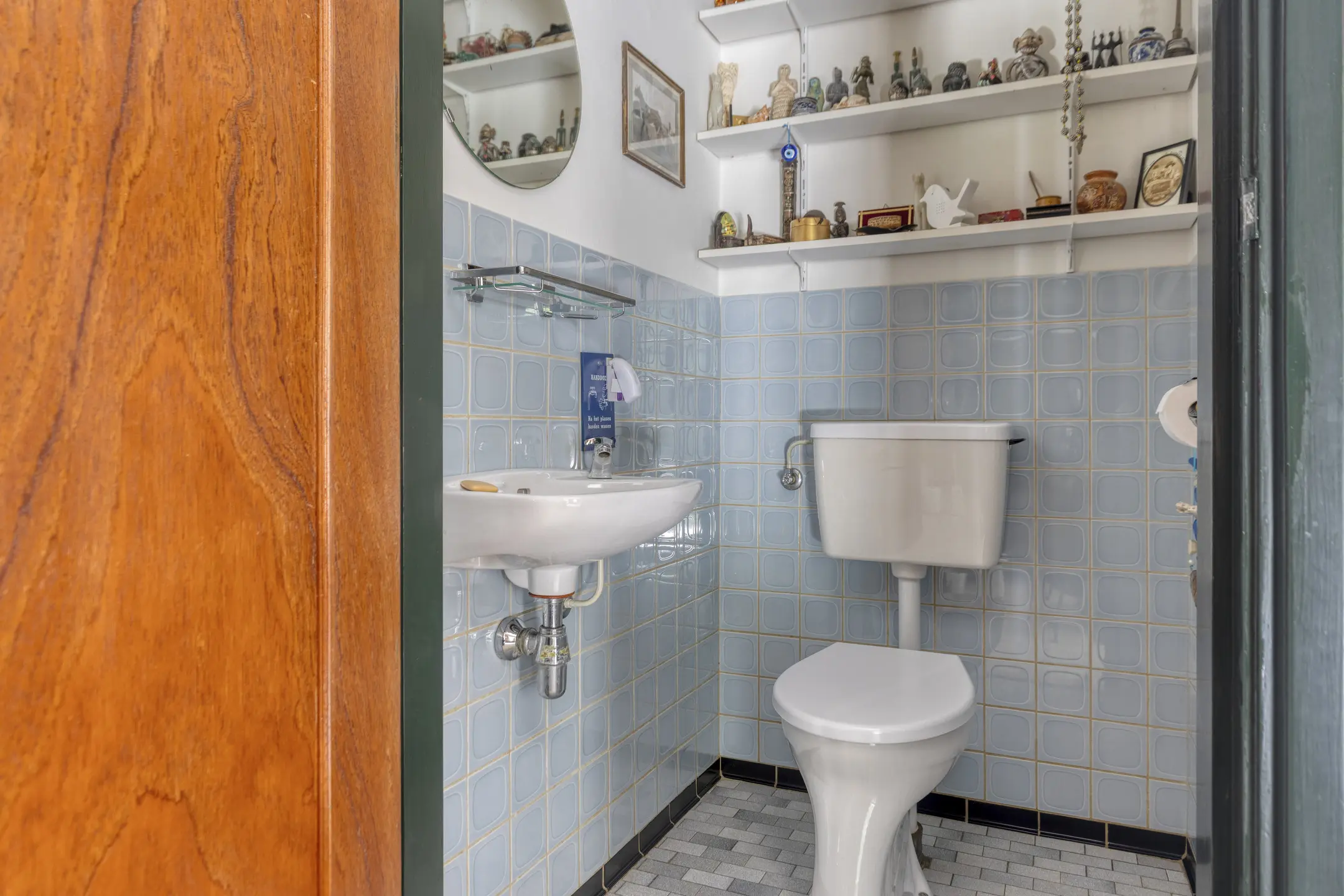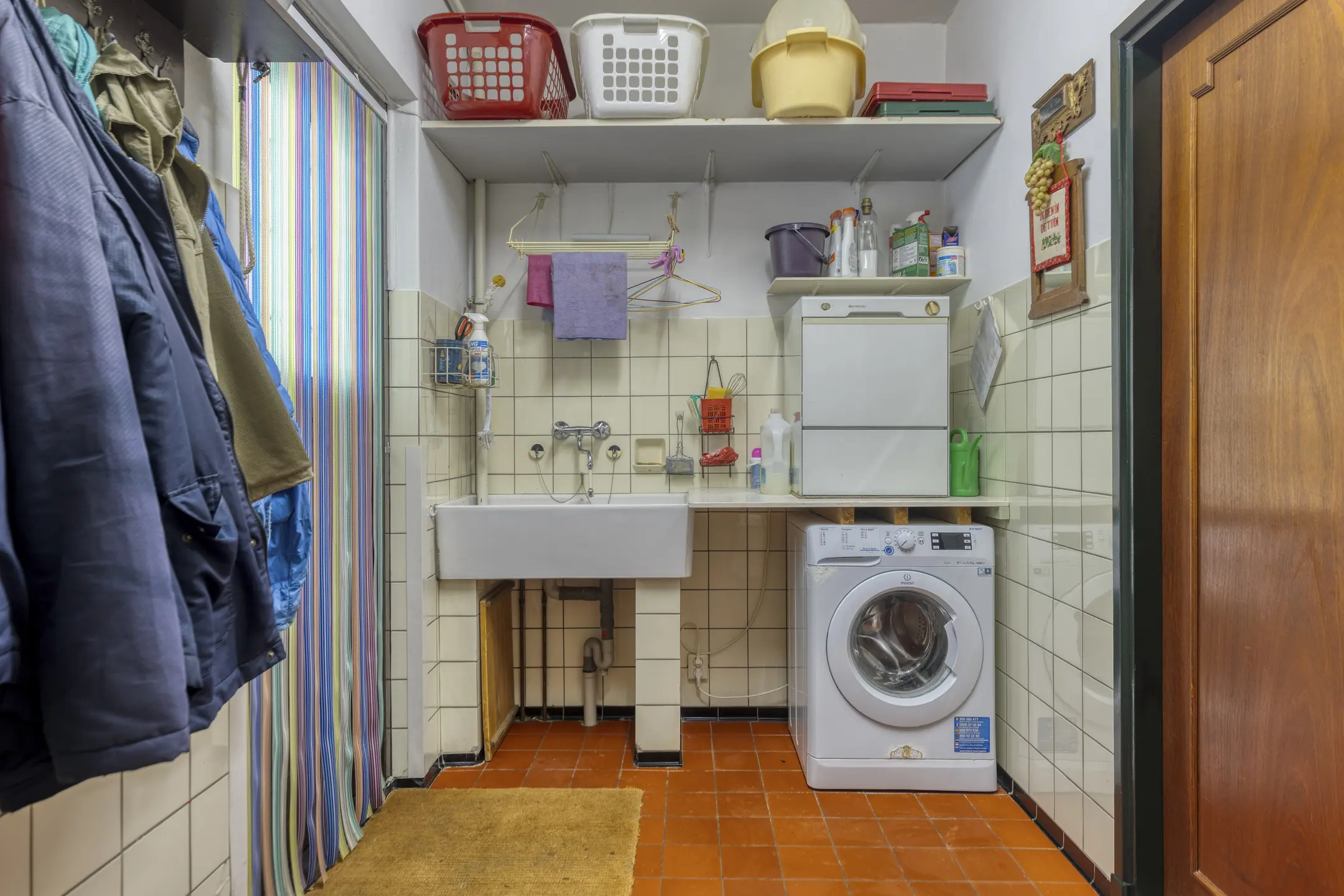 Direct naast de keuken vind je de praktische bijkeuken. Hier zijn de aansluitingen voor wasmachine en droger, een losse spoelbak en voldoende ruimte voor een extra koelkast of vriezer. Vanuit hier heb je toegang tot de inpandige garage en de tuin.