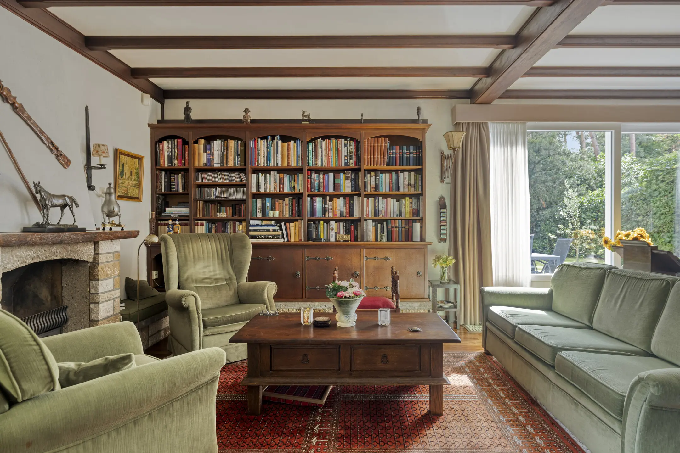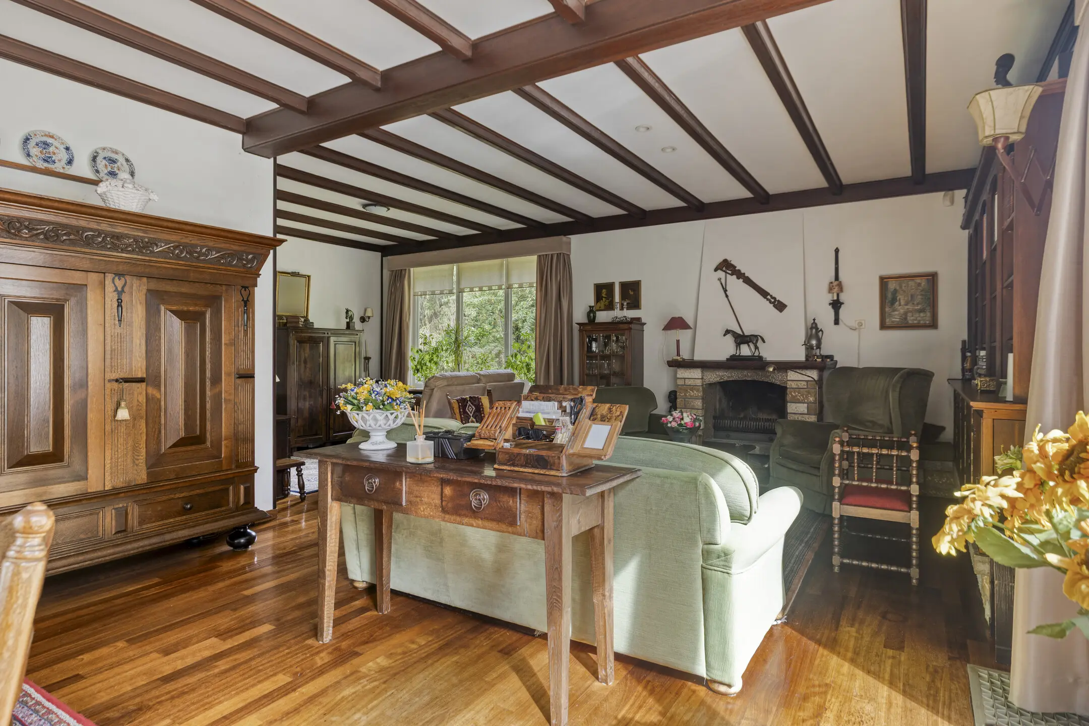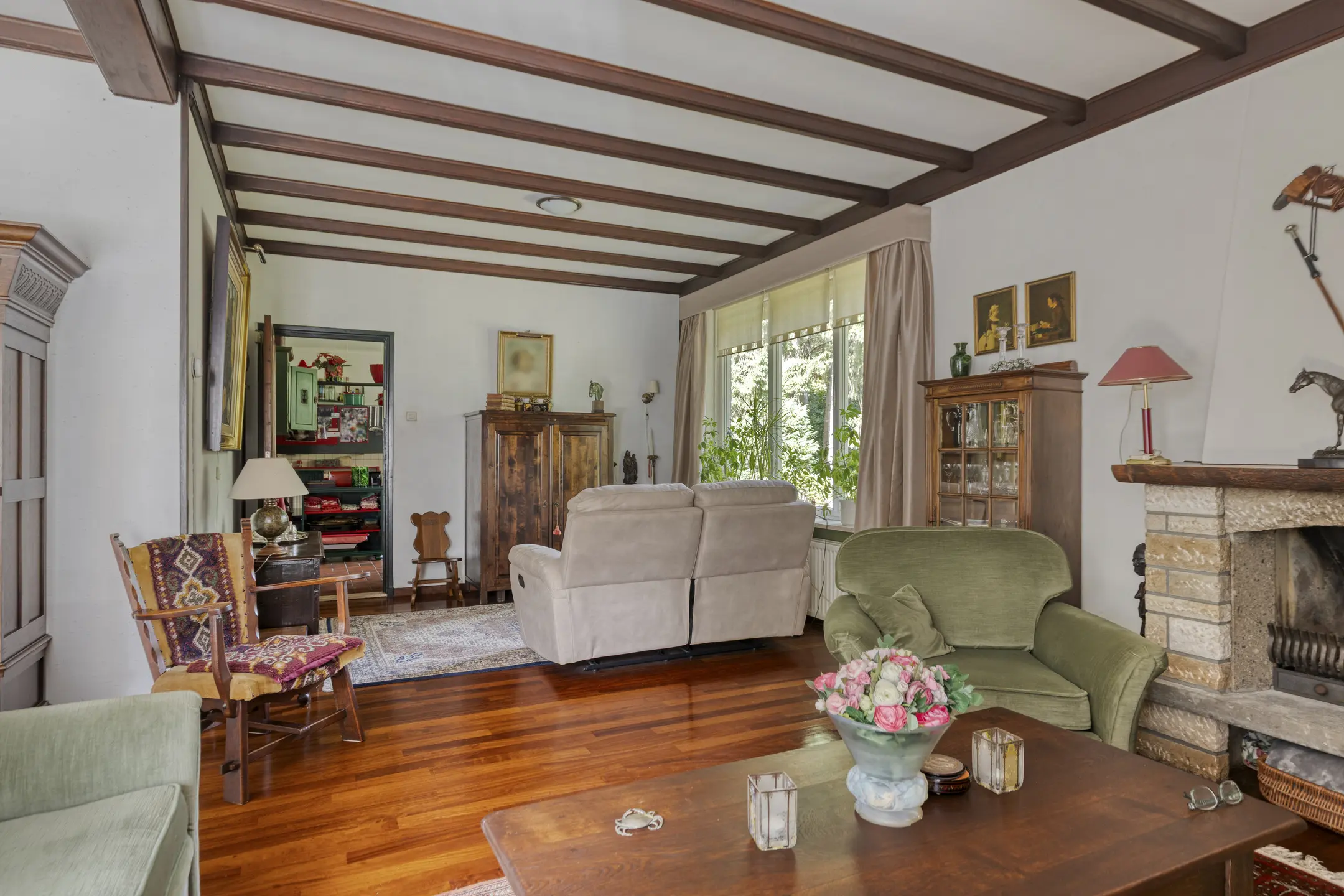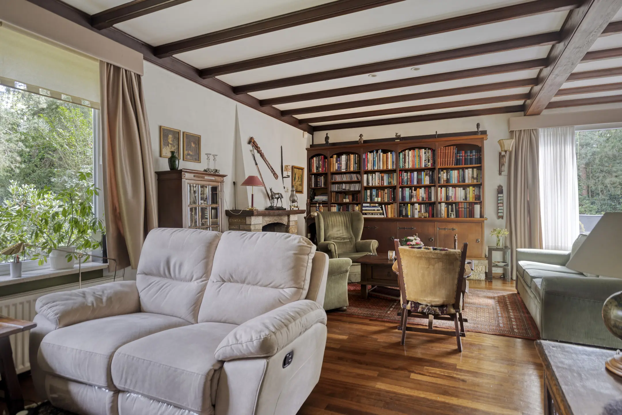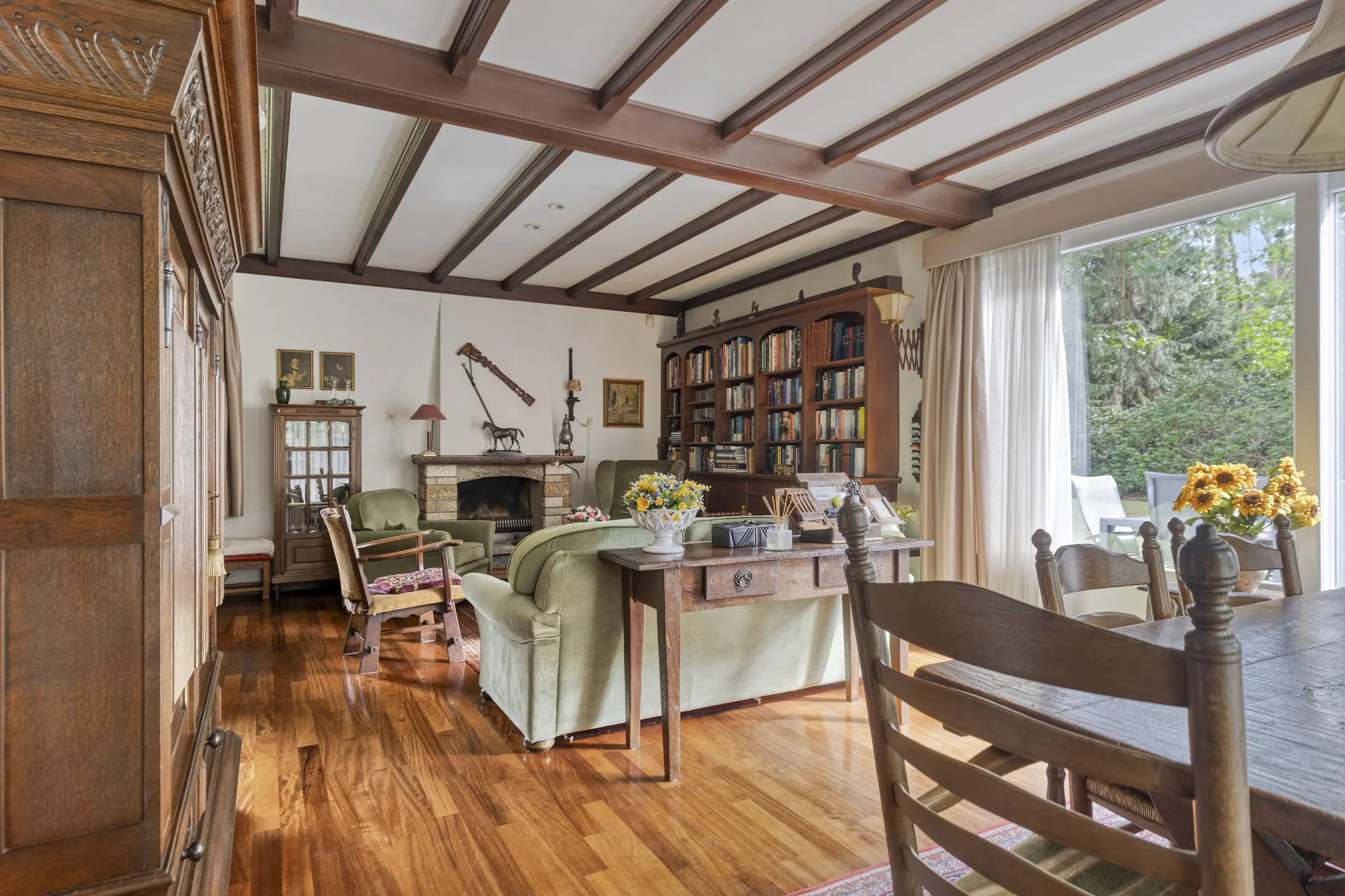 Zodra je de woonkamer binnenstapt, voel je de warmte en gezelligheid van dit huis. Het balkenplafond, de houten vloer en de open haard geven de ruimte een knusse, bijna chalet-achtige sfeer, alsof je in een vakantiehuis in de bergen zit. De grote ramen zorgen voor een zee aan daglicht en bieden een prachtig uitzicht op het groen van de tuin. Hier creëer je moeiteloos een gezellige zithoek voor lange avonden bij het haardvuur en een eethoek waar je samen geniet van diners. Via de schuifpui stap je direct het terras op, waardoor binnen en buiten naadloos in elkaar overlopen.