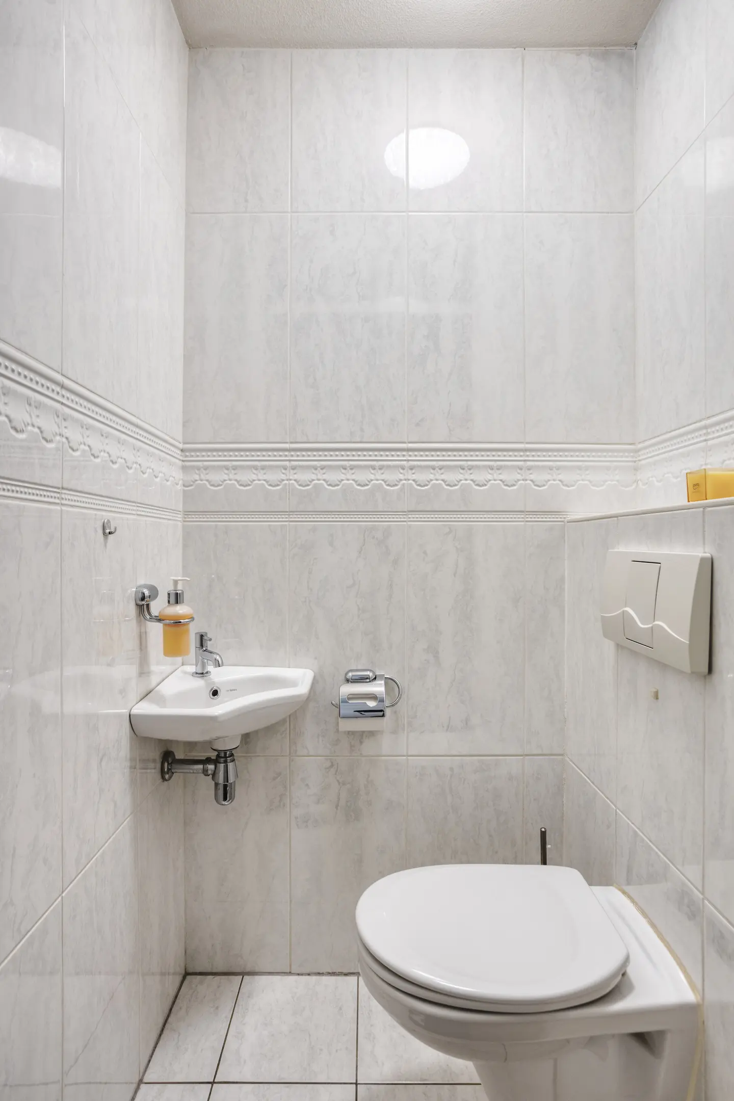De badkamer is verzorgd en van een goed formaat. Hier vind je een moderne inloopdouche met glazen wand en een wastafel.