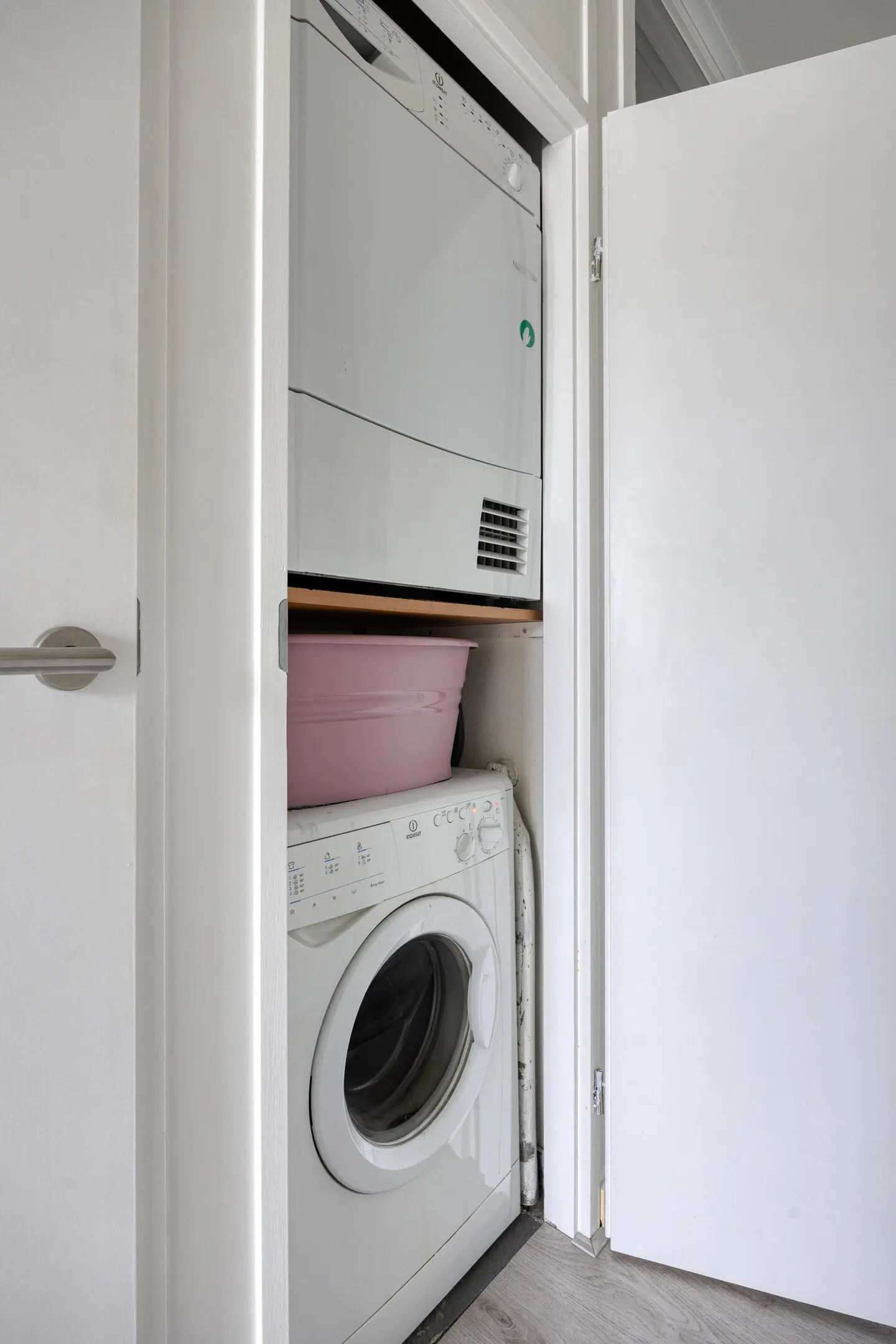 Naast de badkamer bevindt zich de separate wasruimte met aansluitingen voor wasmachine en droger. Praktisch uit het zicht, maar direct binnen handbereik.