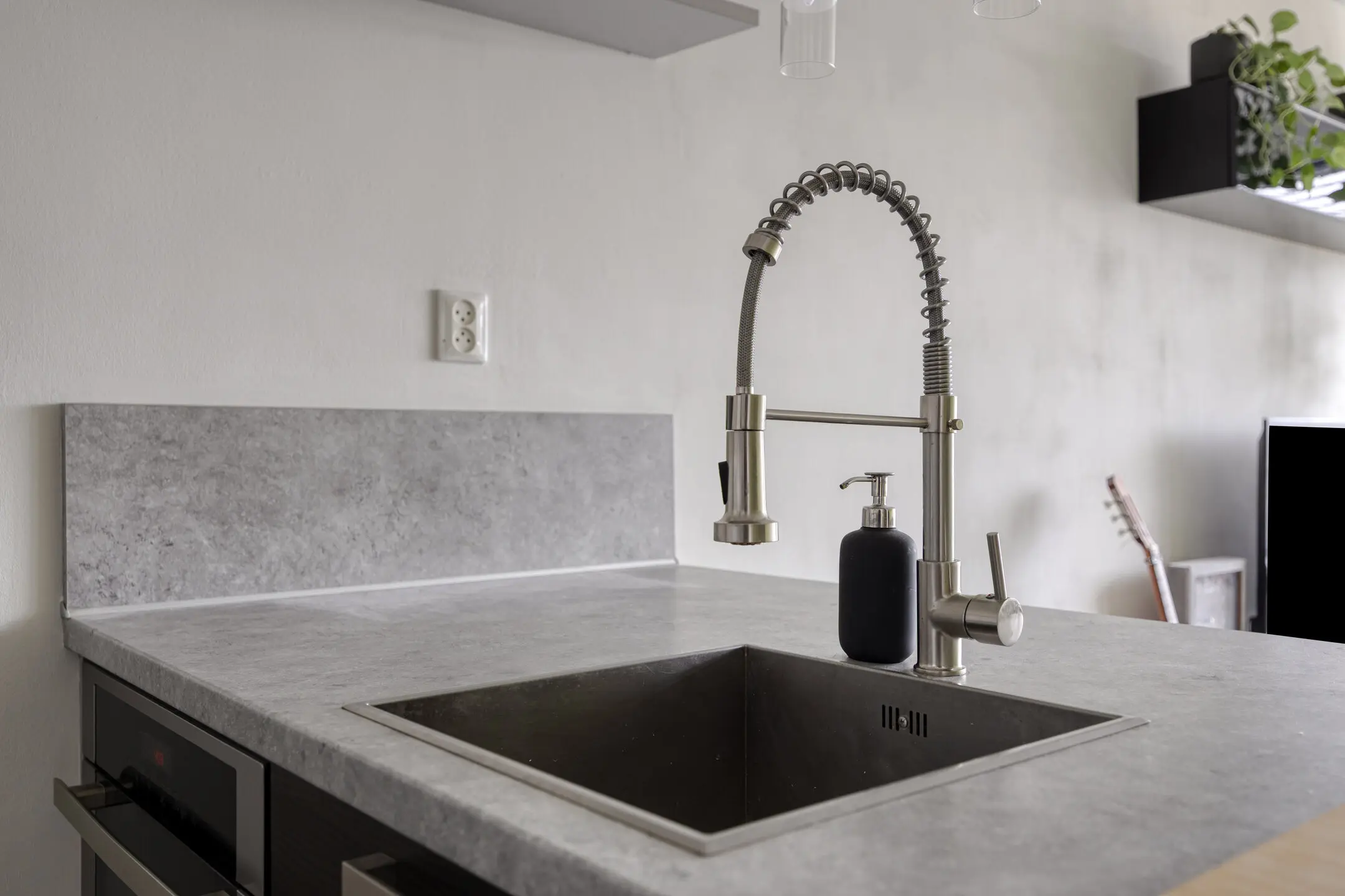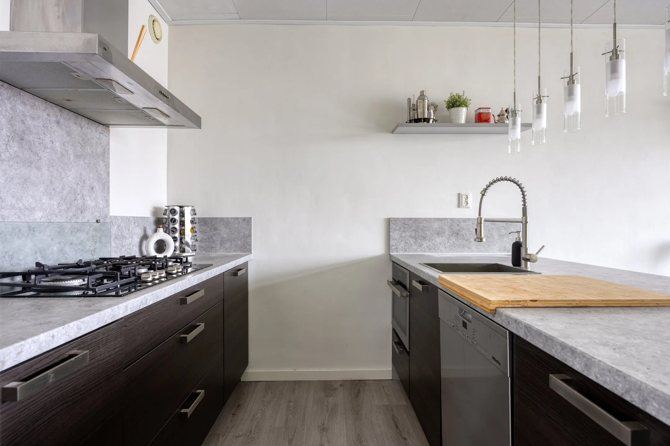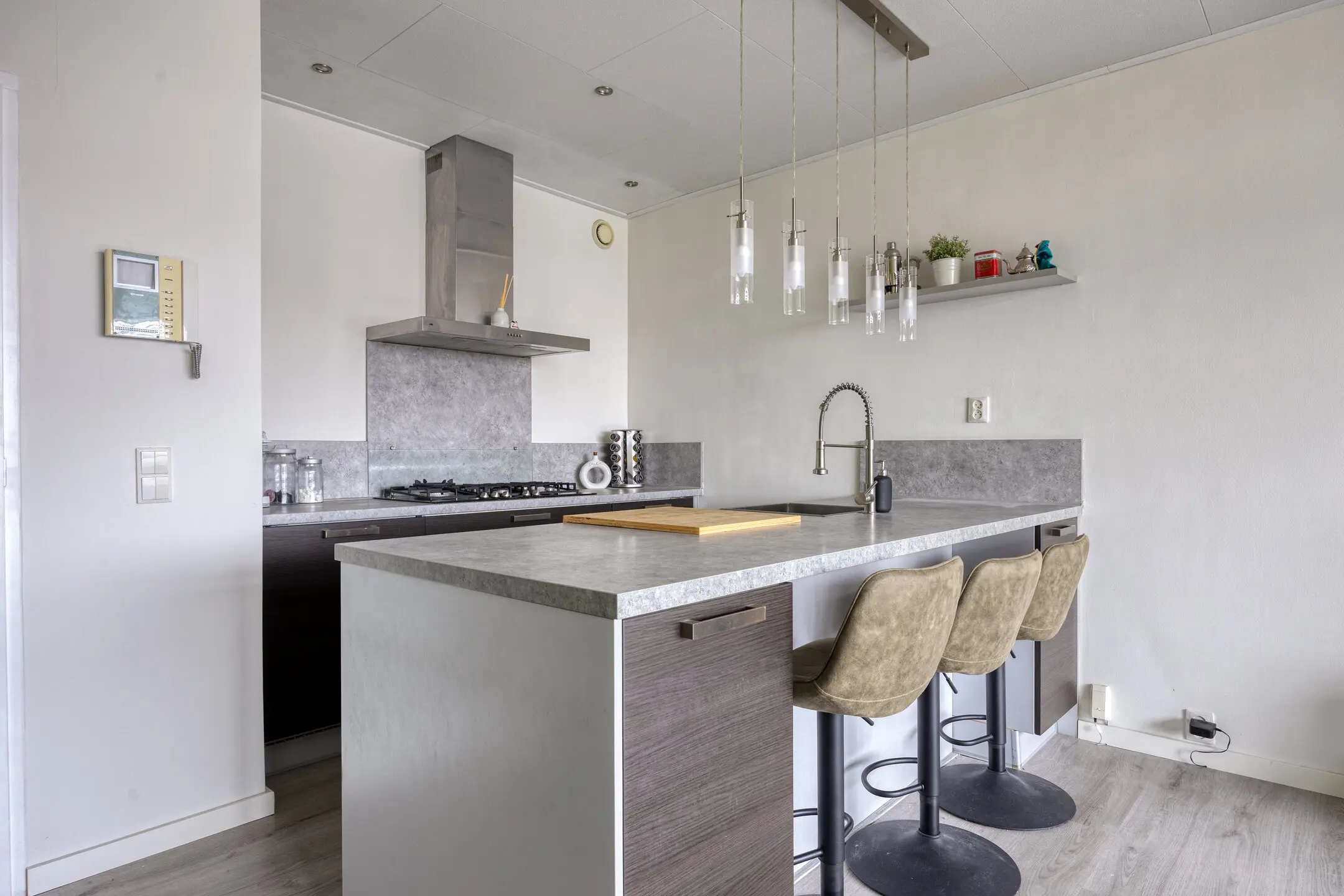 De woonkamer loopt naadloos over in de openkeuken, die direct in het oog springt. Deze parallel opgestelde inbouwkeuken met spoeleiland en baropstelling is uitgerust met een 5-pits gaskookplaat, een koelkast en vriezer, een combi magnetron/oven, een vaatwasser en een afzuigkap. De RVS spoelbak en het kunststof werkblad maken het geheel compleet. Het is een ideale plek voor kookliefhebbers én voor lange, gezellige avonden met vrienden of familie.