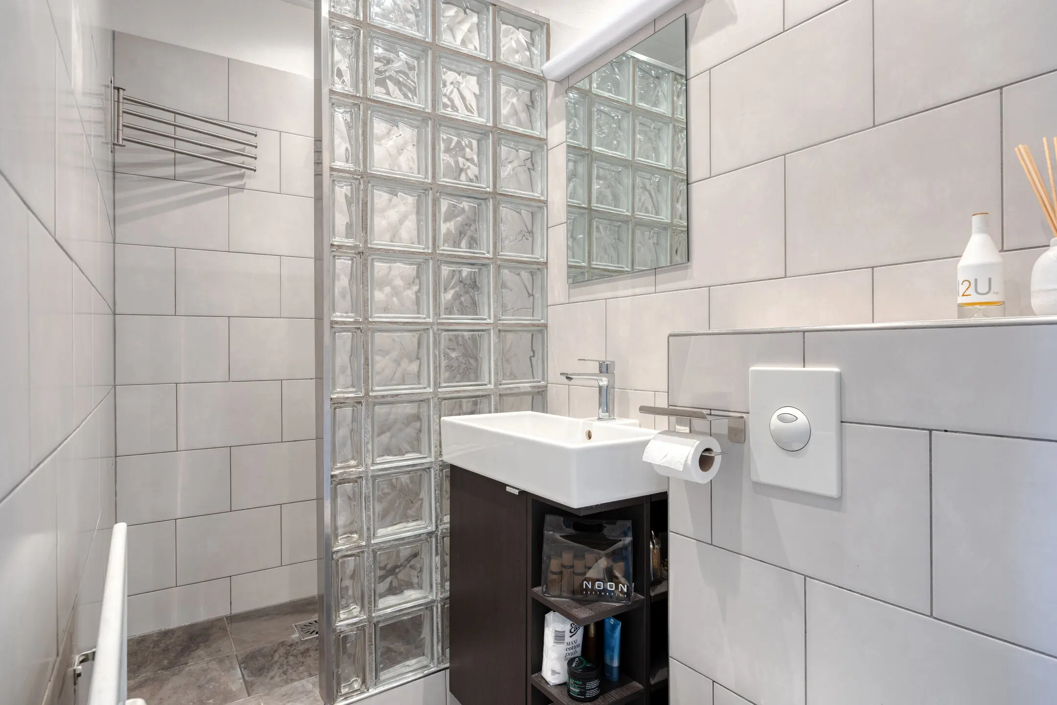 De badkamer is stijlvol afgewerkt en volledig ingericht. Deze ruimte beschikt over een inloopdouche met regendouche, een toilet en een wastafelmeubel.