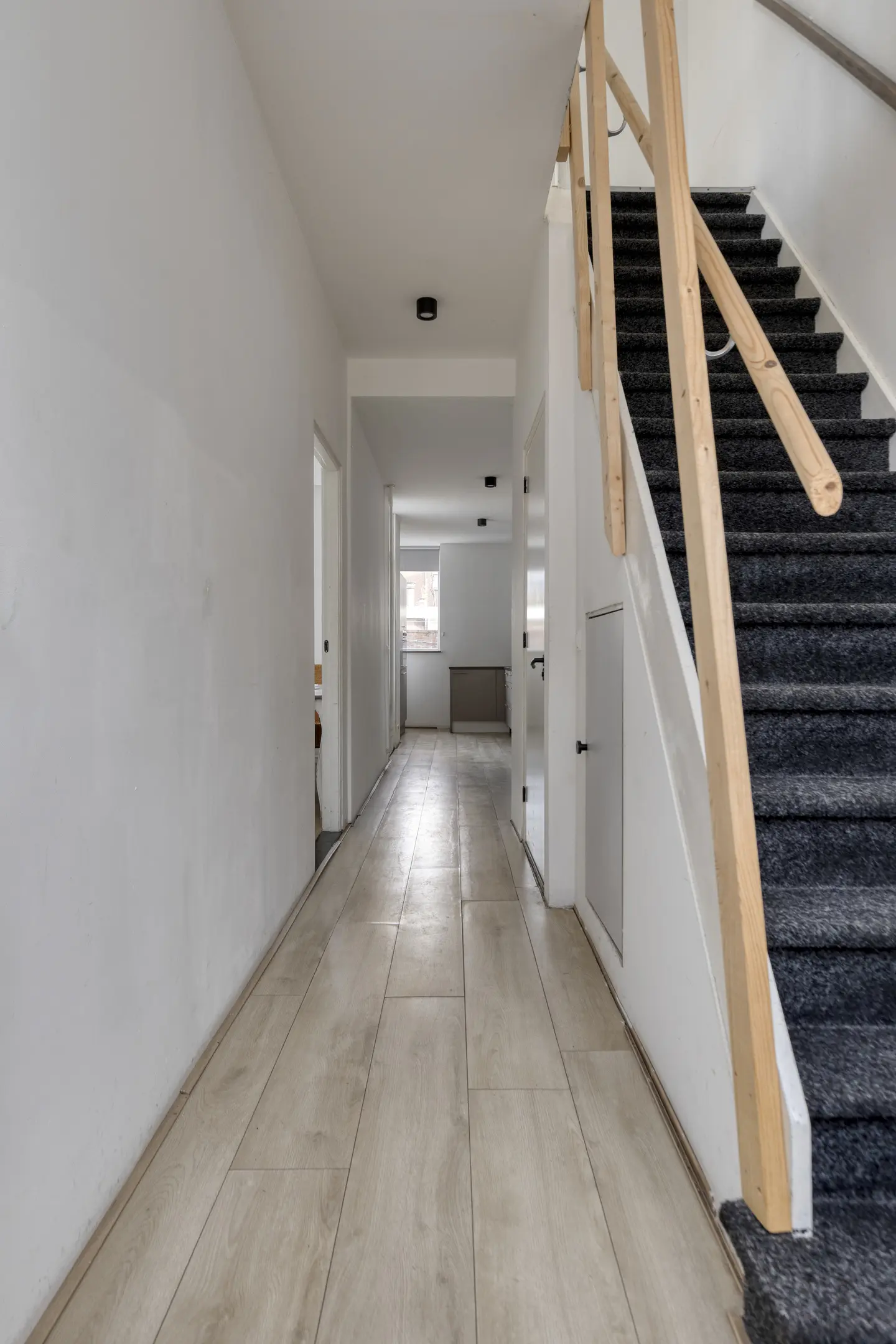 Bij binnenkomst kom je in de hal met toegang tot het toilet, de woonkamer, de keuken en de trap naar de eerste verdieping. De gehele begane grond is voorzien van een lichte laminaatvloer.