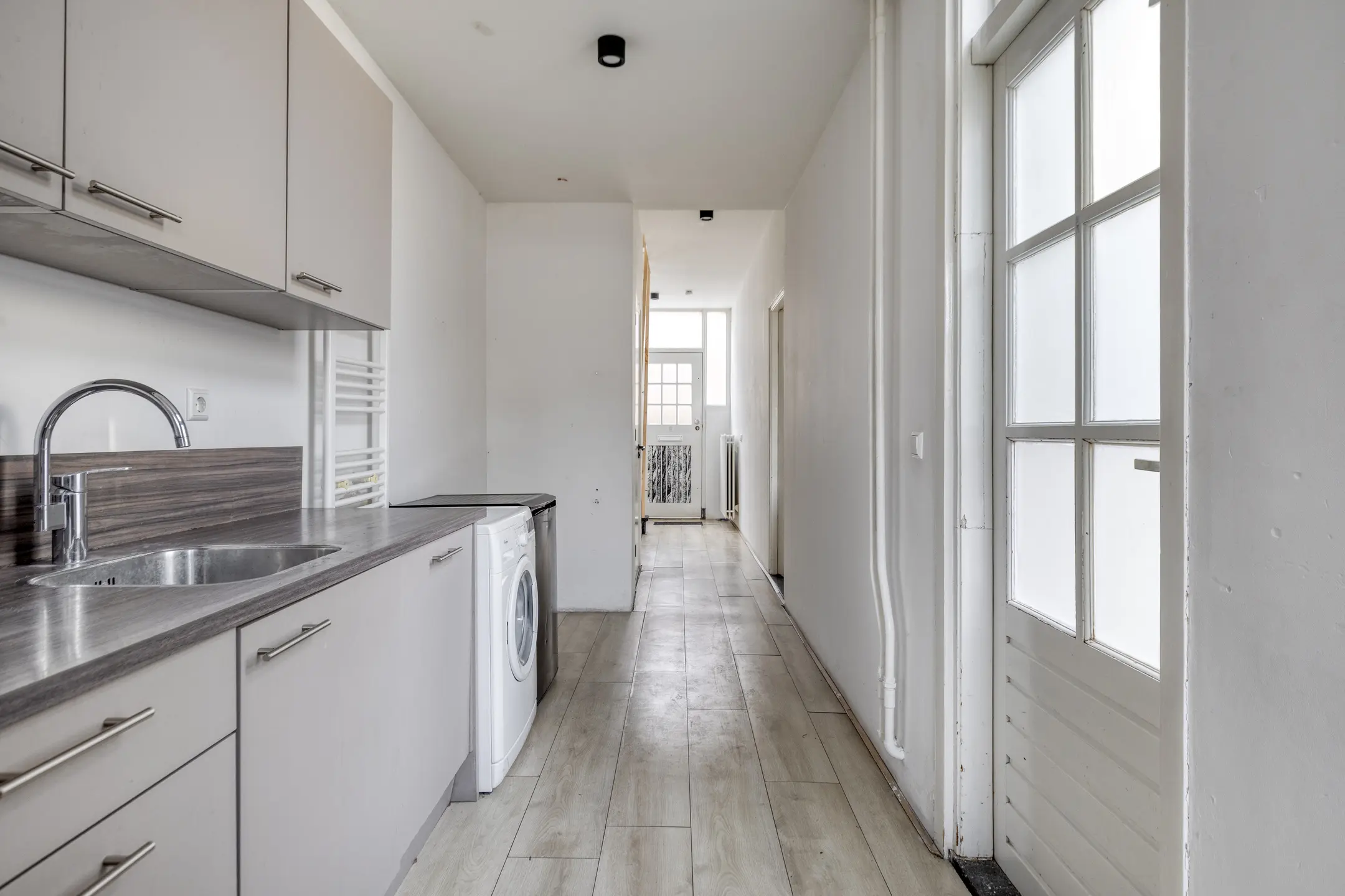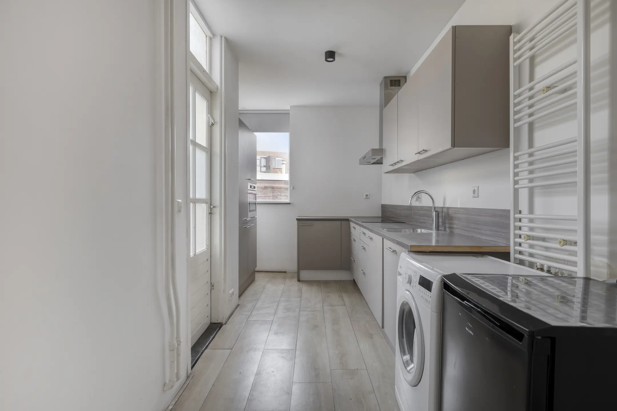 De gesloten keuken is diep en praktisch ingedeeld en voorzien van een vaatwasser, spoelbak met kraan, inductiekookplaat, diverse lades en kasten, en voldoende werkruimte. Tevens vindt je hier ook de aansluitingen voor wasmachine en droger. De keuken is uitgevoerd in een warme taupe-kleur met een donker houtkleurig werkblad.