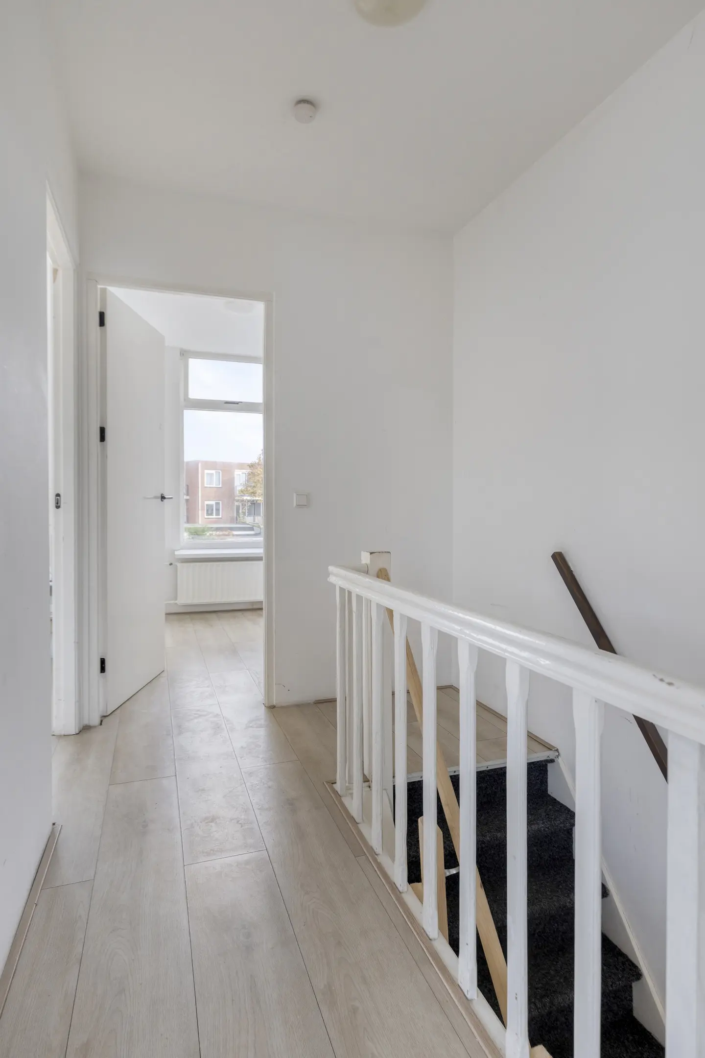 Op de eerste verdieping vind je drie slaapkamers en de badkamer, allemaal voorzien van een lichte laminaatvloer.