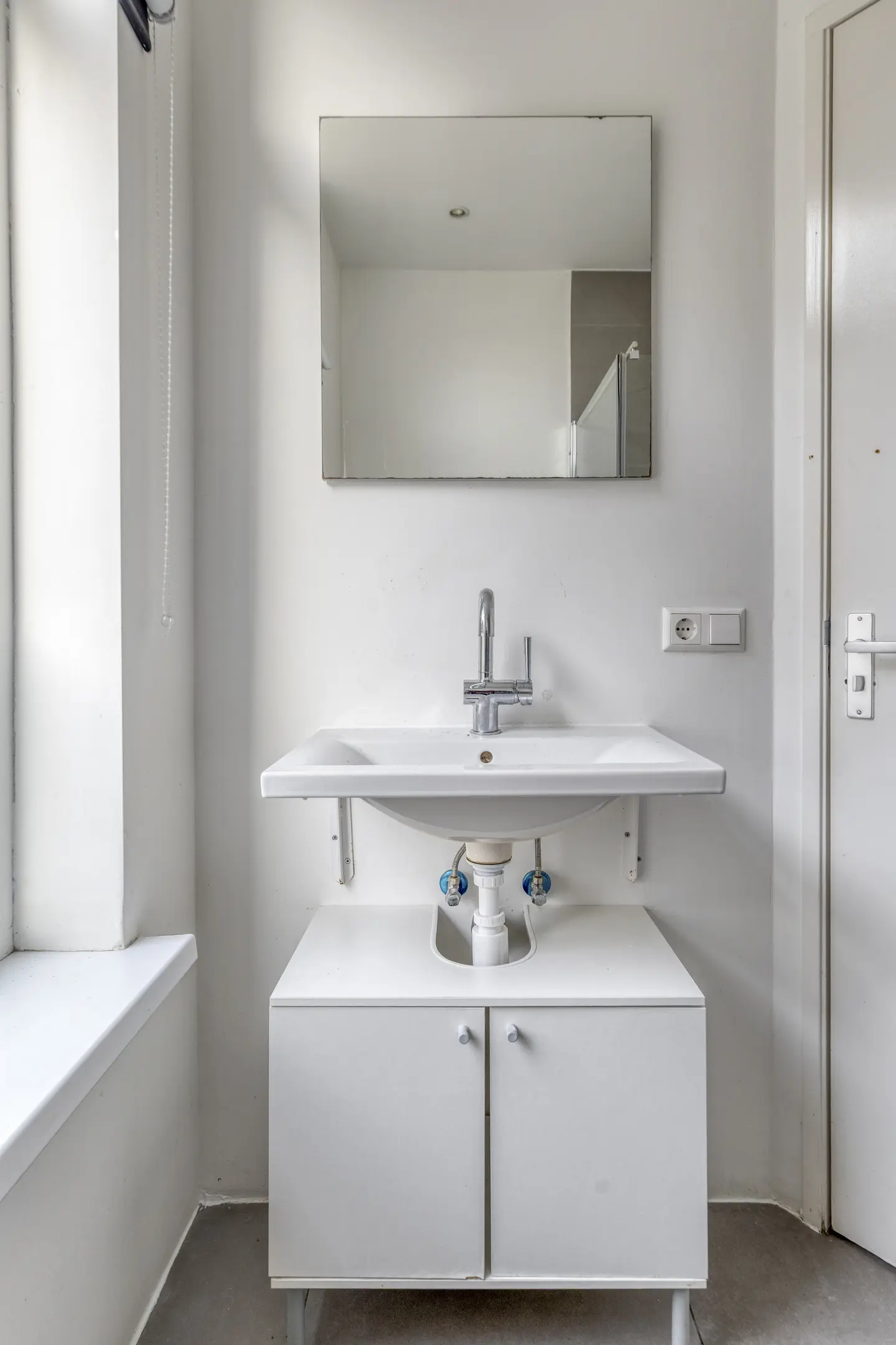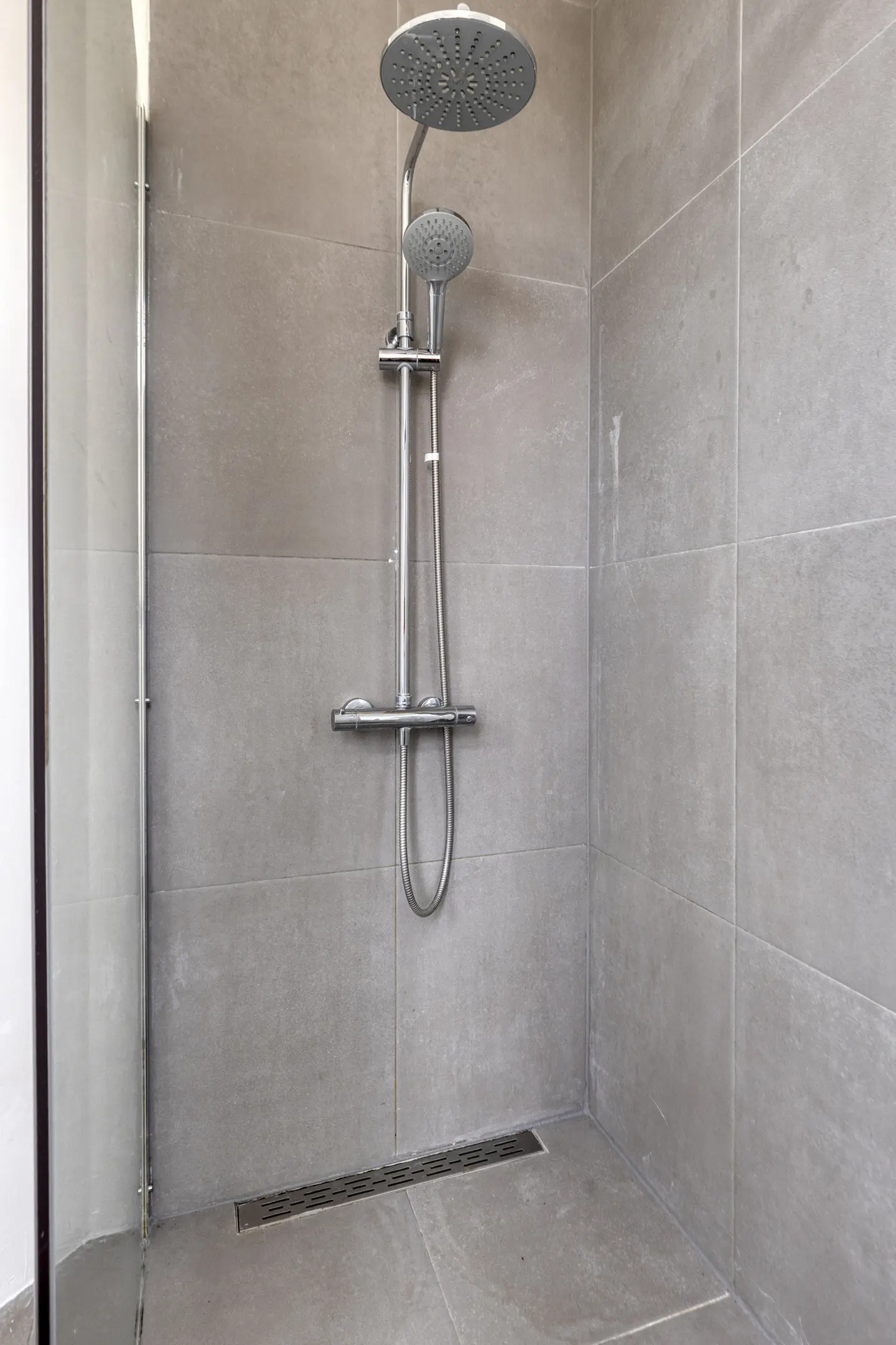 De badkamer is verzorgd en voorzien van lichtgrijze cementkleurige vloertegels, witte wanden, een inloopdouche en een wastafel met kraan.