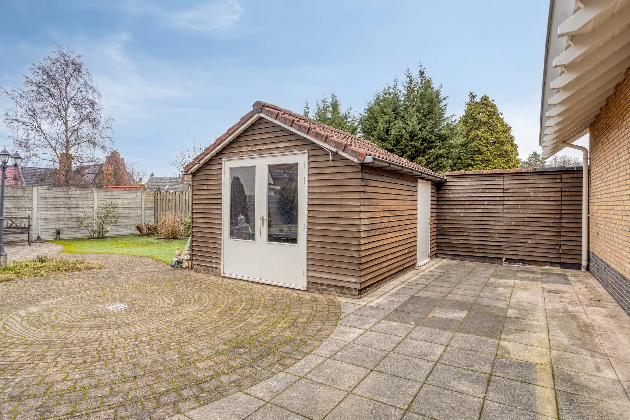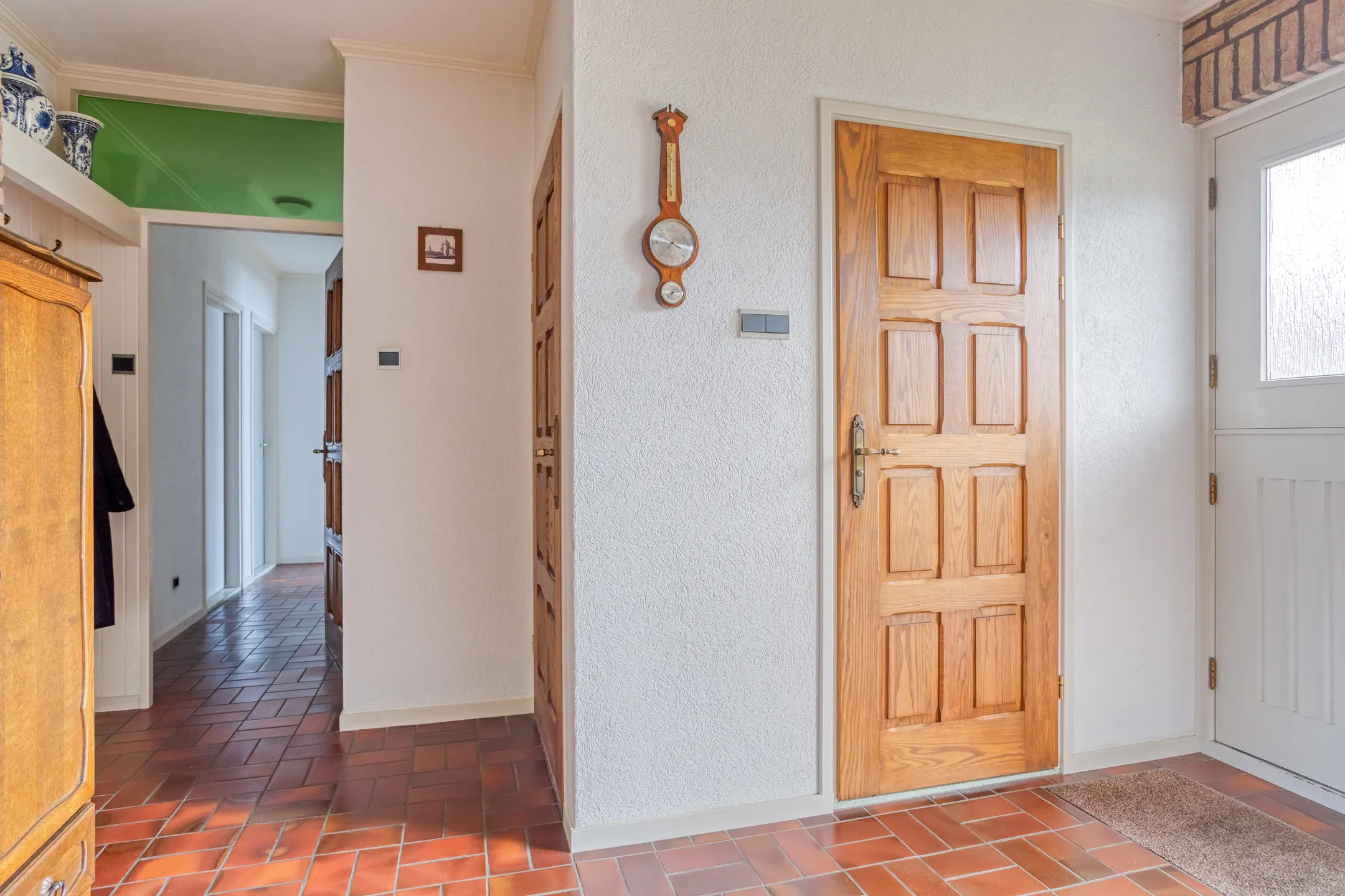 De riante voortuin en ruime oprit bieden plek voor meerdere auto’s. Via het pad bereik je de voordeur, en ook de garage is direct toegankelijk. Een fijne, verzorgde entree met volop ruimte.