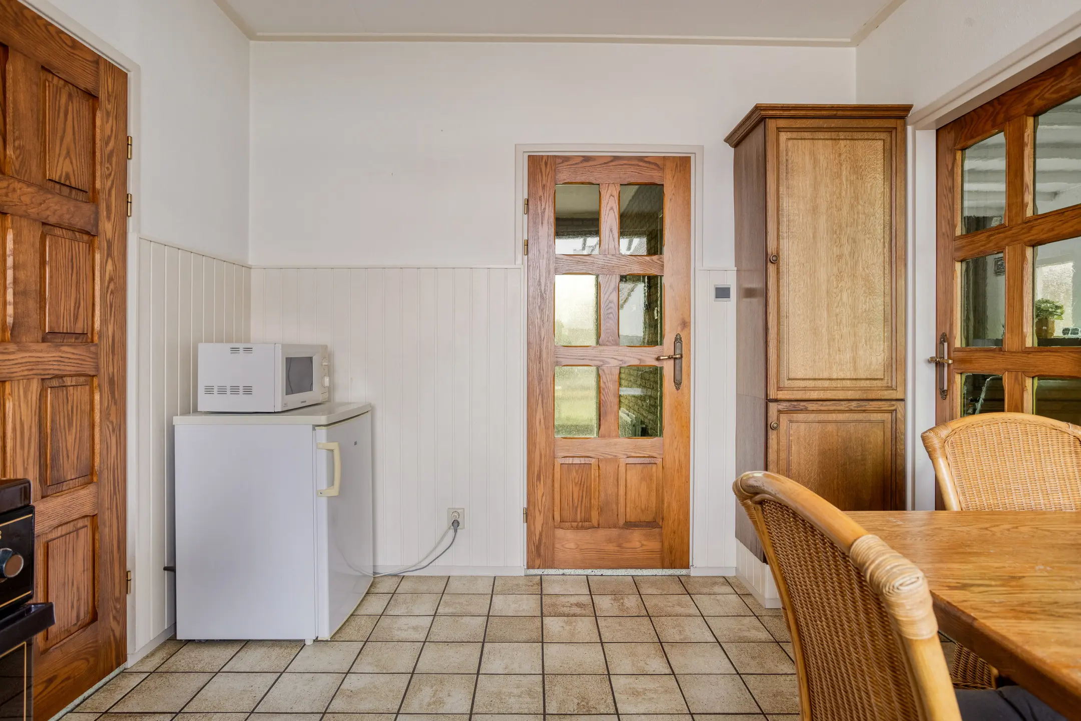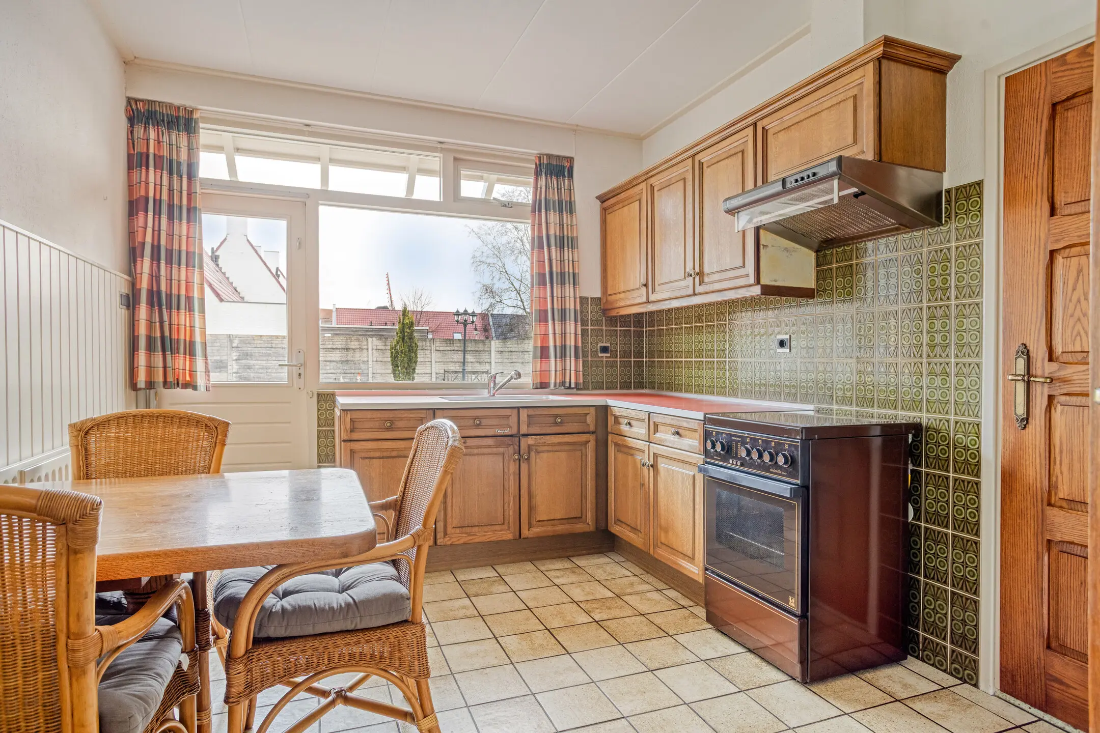 De huidige keuken is praktisch ingericht en voorzien van een losse oven met kookplaat, spoelbak, afzuigkap en diverse kasten en laden. Via de deur heb je bovendien direct toegang tot de tuin, wat het geheel extra prettig maakt en volop mogelijkheden biedt voor binnen- en buitenleven.
