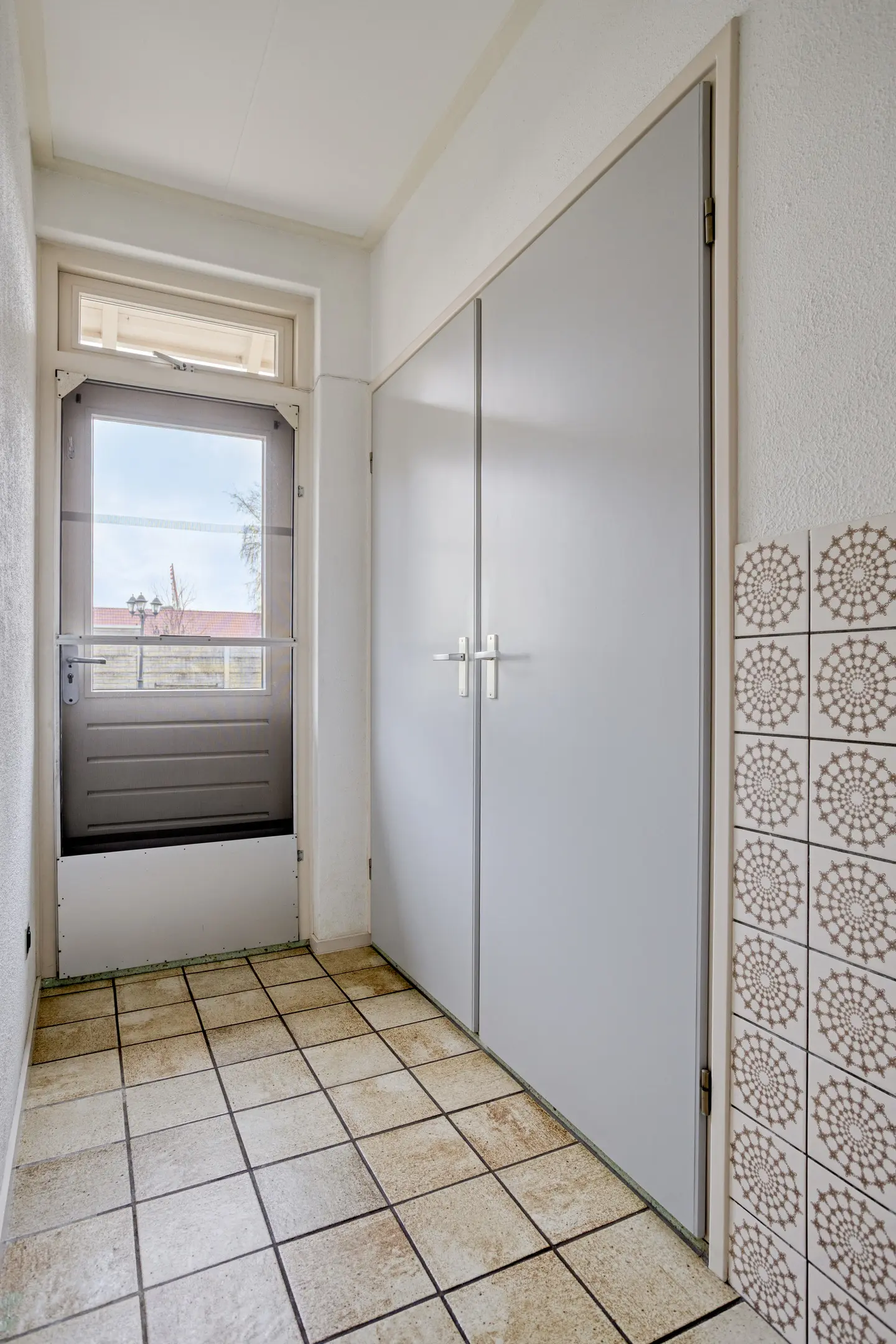 De hal vormt het centrale punt van de woning en geeft toegang tot het toilet, meterkast, de woonkamer, keuken en de tussenhal richting slaapkamers en badkamer.