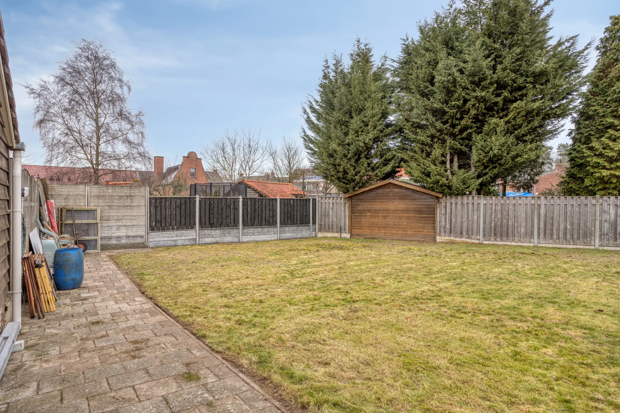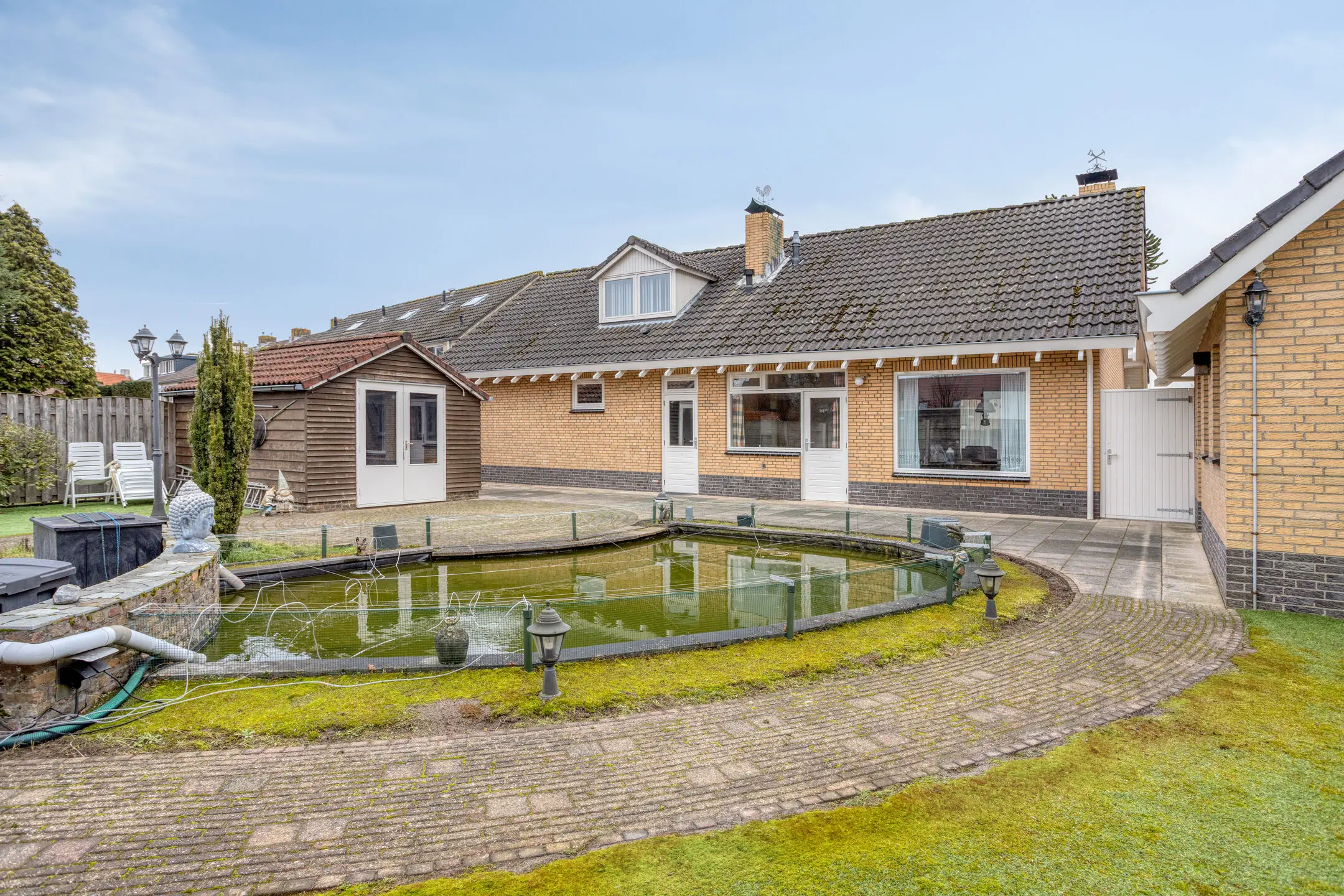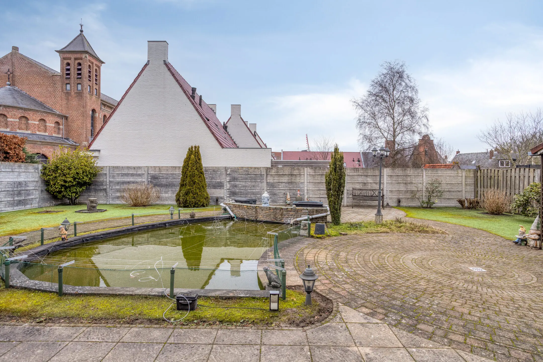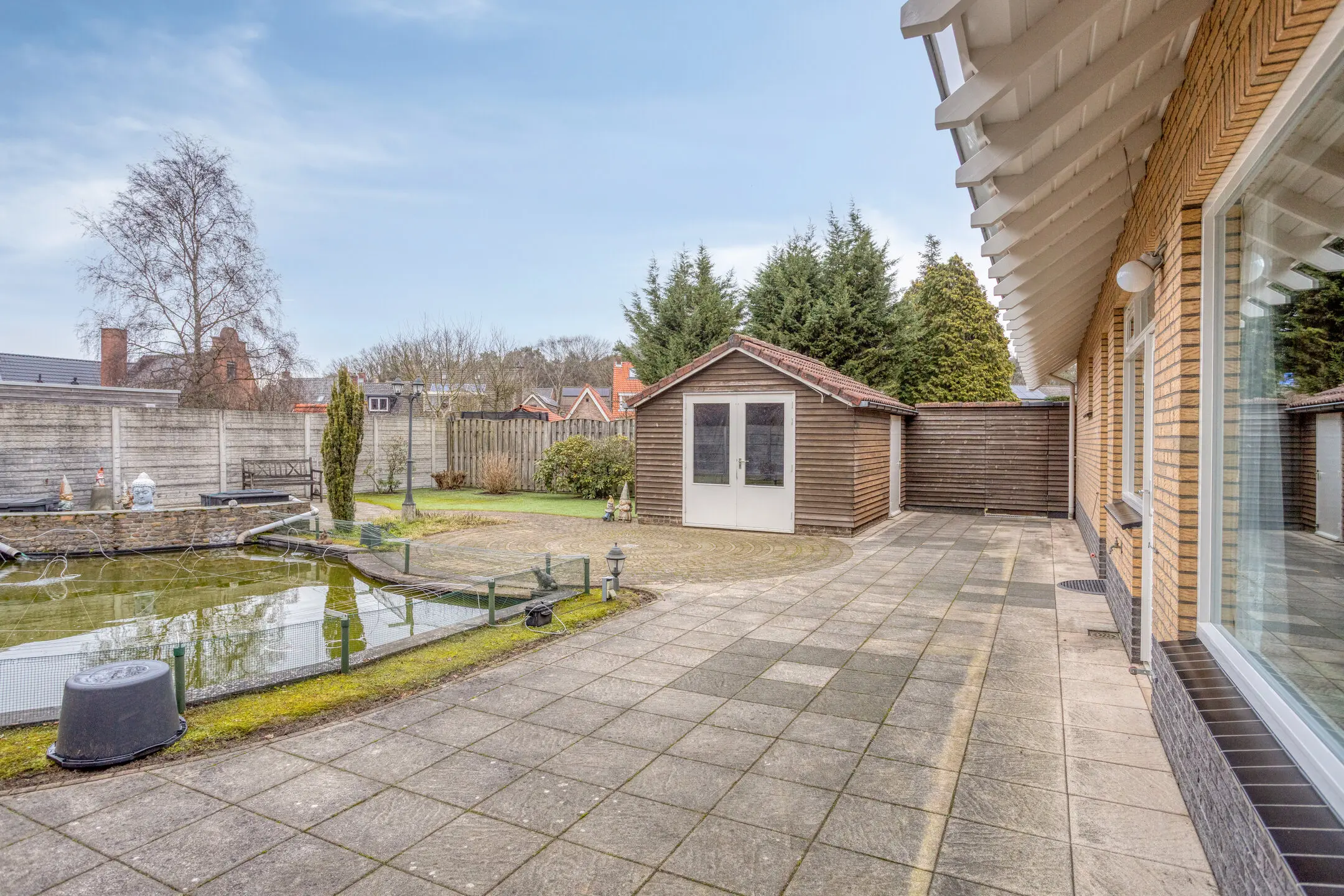De achtertuin is écht mega. Hier vind je een terras, een gazon, een vijver centraal in de tuin, een handige berging en toegang tot de garage. En dan begint de fantasie pas echt:
