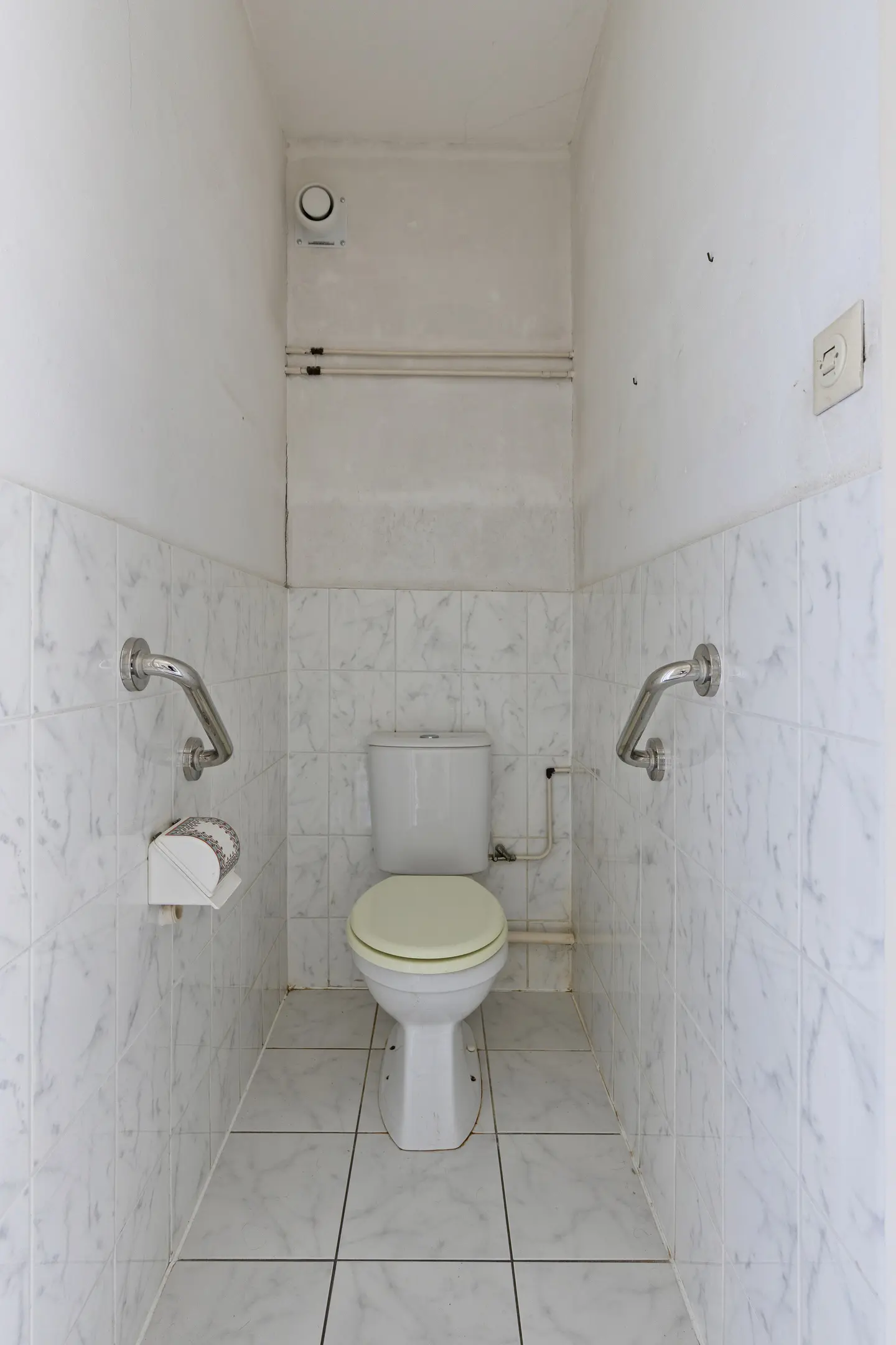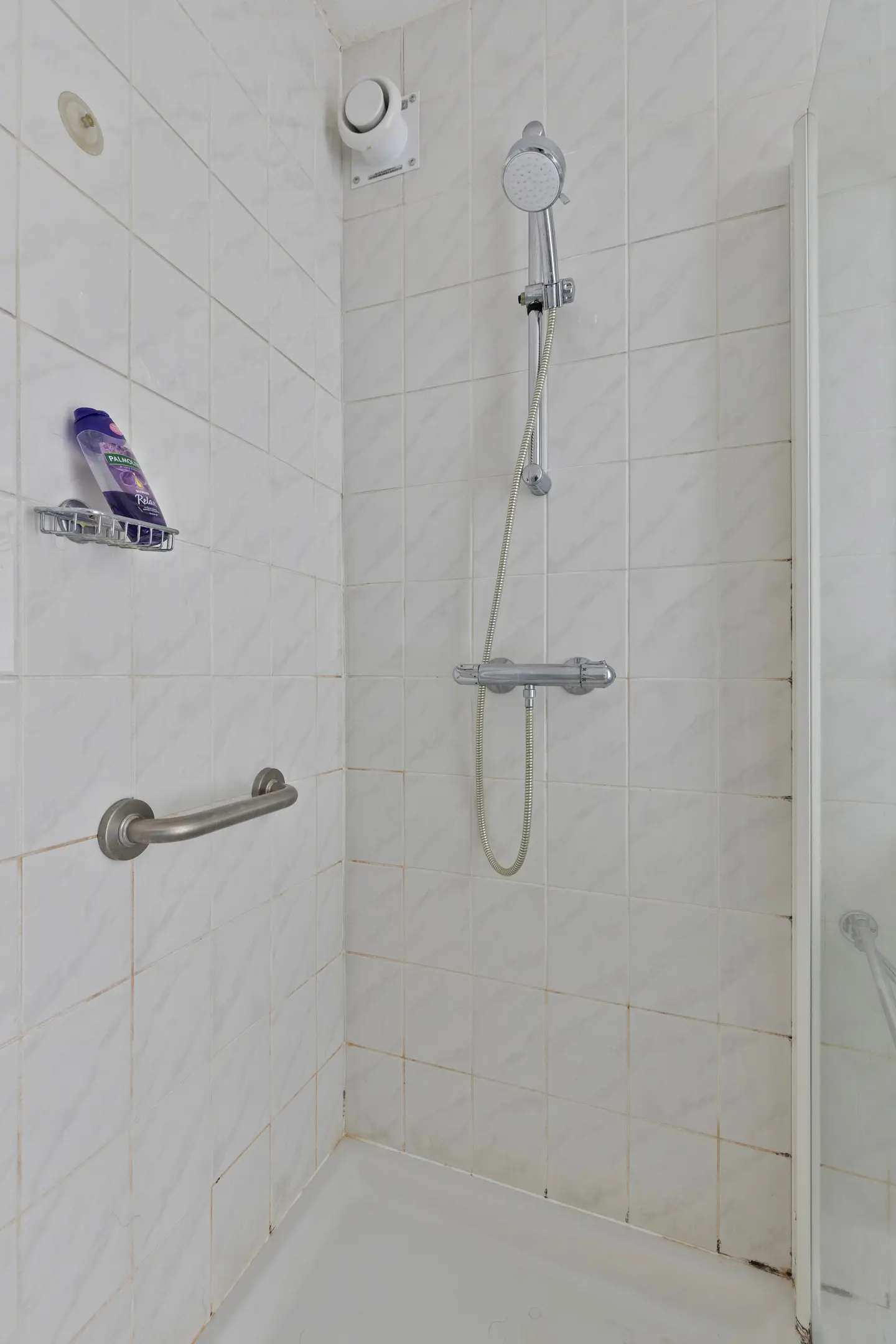 De badkamer is praktisch ingericht met een douche, wastafel en de aansluiting voor de wasmachine. Net als de keuken is deze ruimte gedateerd, maar vormt juist daarom een goede basis voor een frisse, moderne renovatie. Het toilet is separaat van de badkamer.