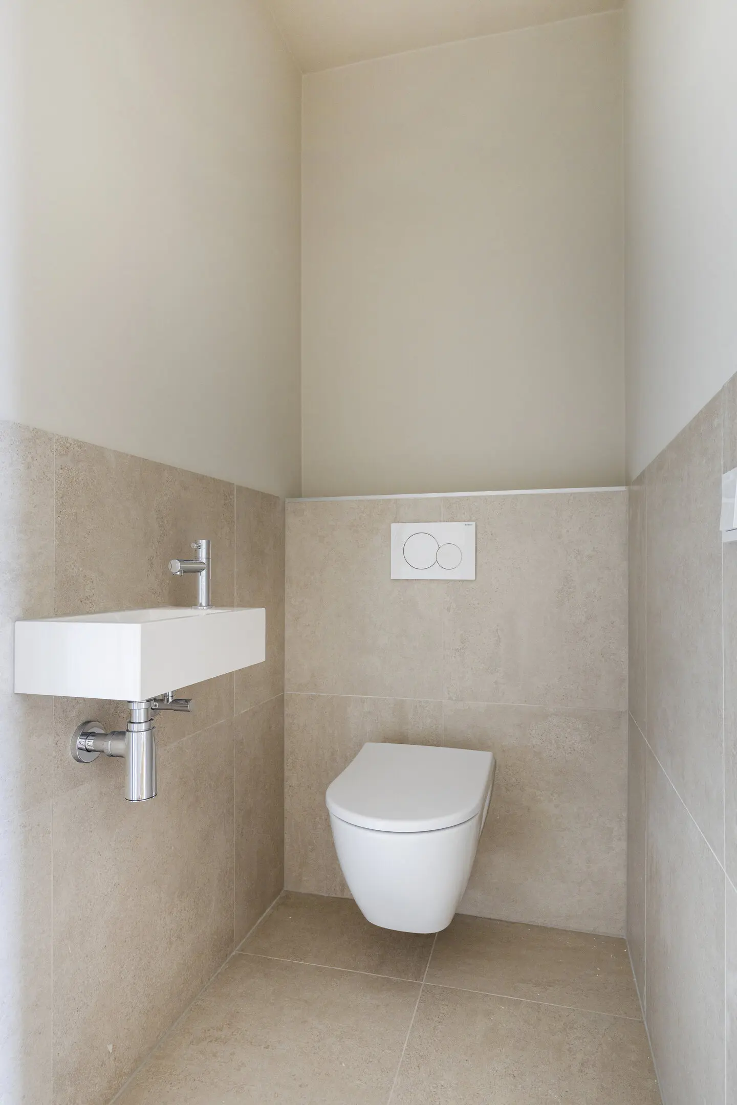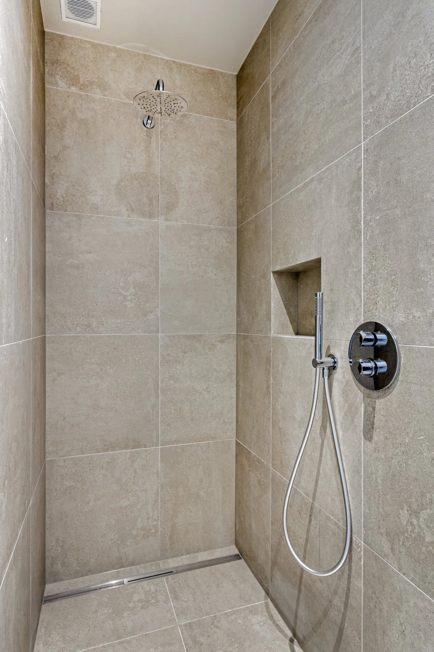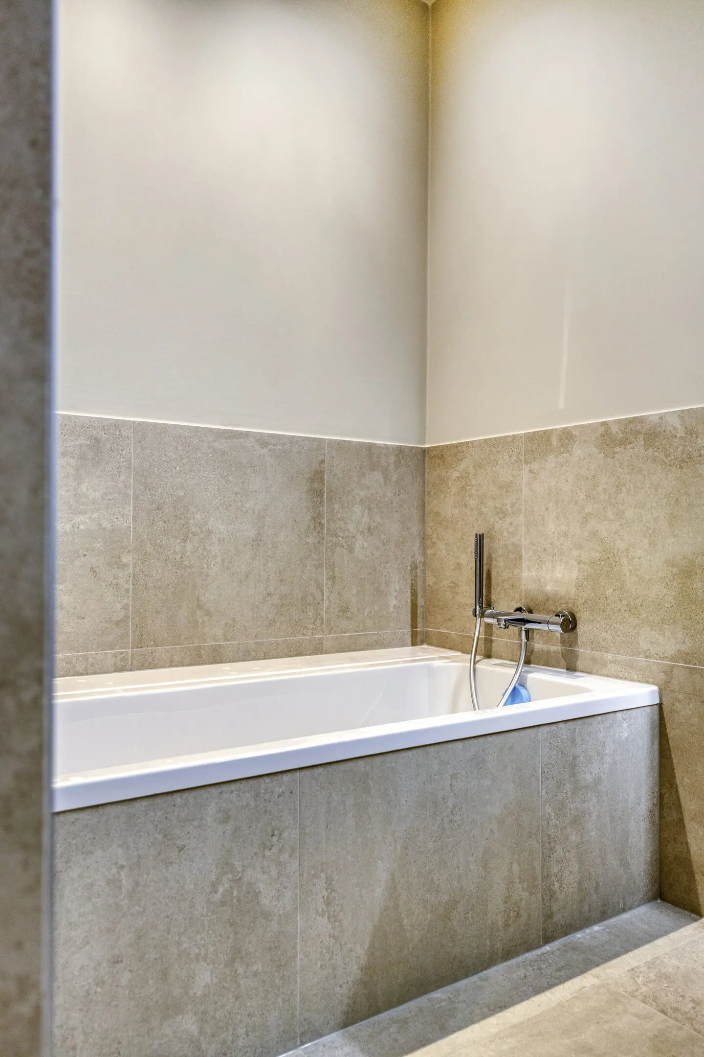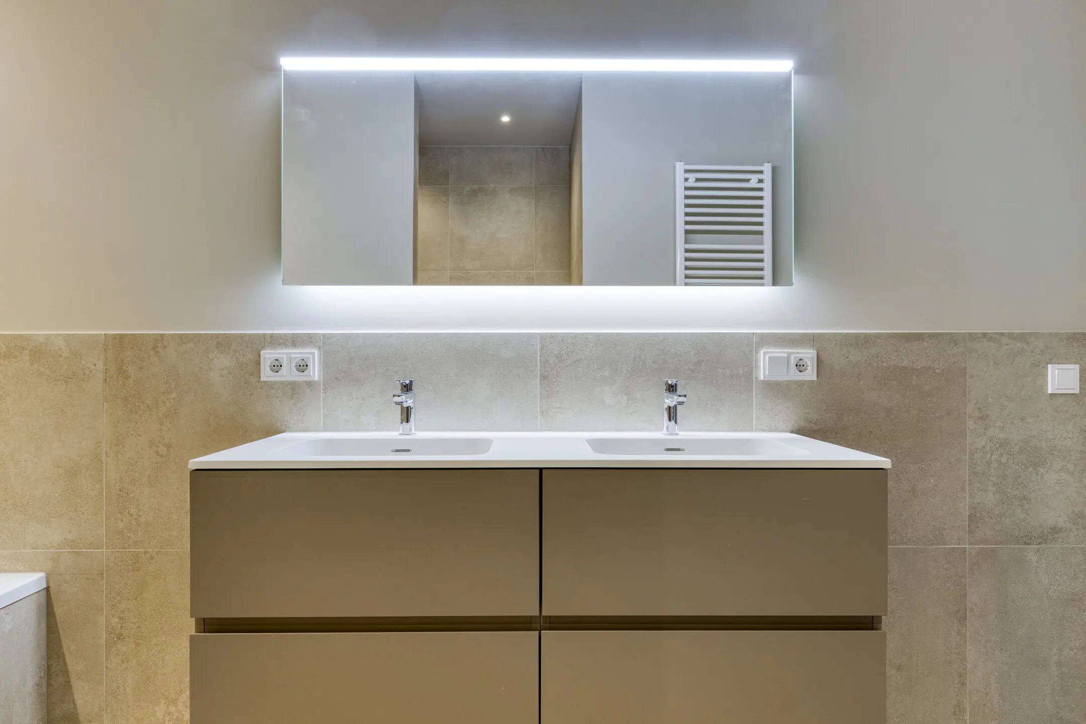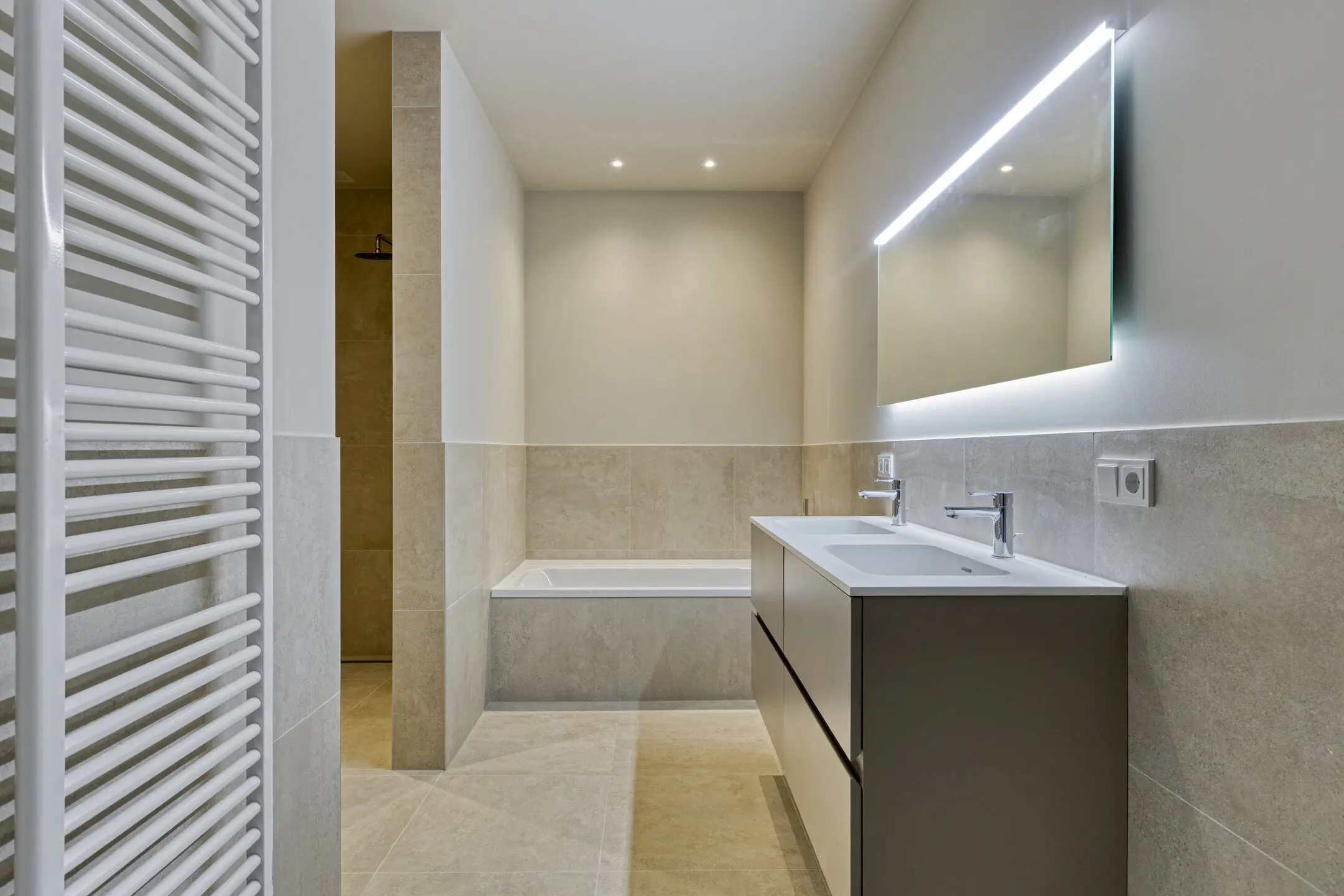 De badkamer straalt pure luxe uit door het gebruik van natuurlijke tinten zoals zandkleur en beige. De ruimte is ingericht met een dubbele wastafel met meubel, een handdoekenradiator, een ligbad en een ruime inloopdouche. Een plek waar je iedere dag kunt ontspannen en genieten van wellness-gevoel in eigen huis.