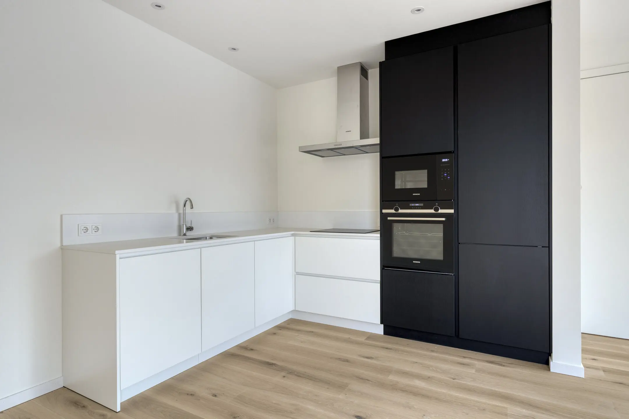 De open keuken sluit naadloos aan op de woonkamer en is uitgevoerd in een stijlvolle combinatie van zwart en wit. Het lage keukendeel is strak wit afgewerkt en de hoge kasten zijn uitgevoerd in modern zwart. De keuken is volledig uitgerust met een spoelbak, vaatwasser, magnetron, oven, inductiekookplaat, afzuigsysteem, koelkast en vriezer. Daarnaast is er volop bergruimte dankzij diverse laden en kasten.