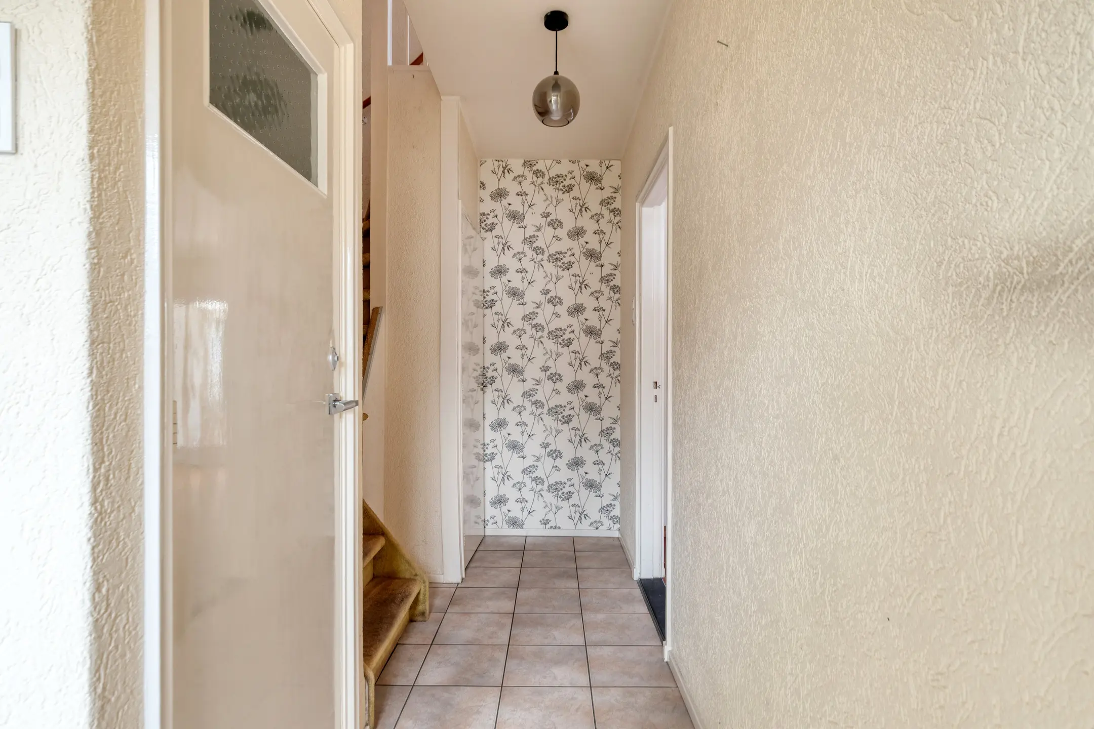 Via de entree kom je in de ruime hal met meterkast, trapopgang, een ingebouwde kast, toilet en toegang naar de woonkamer.