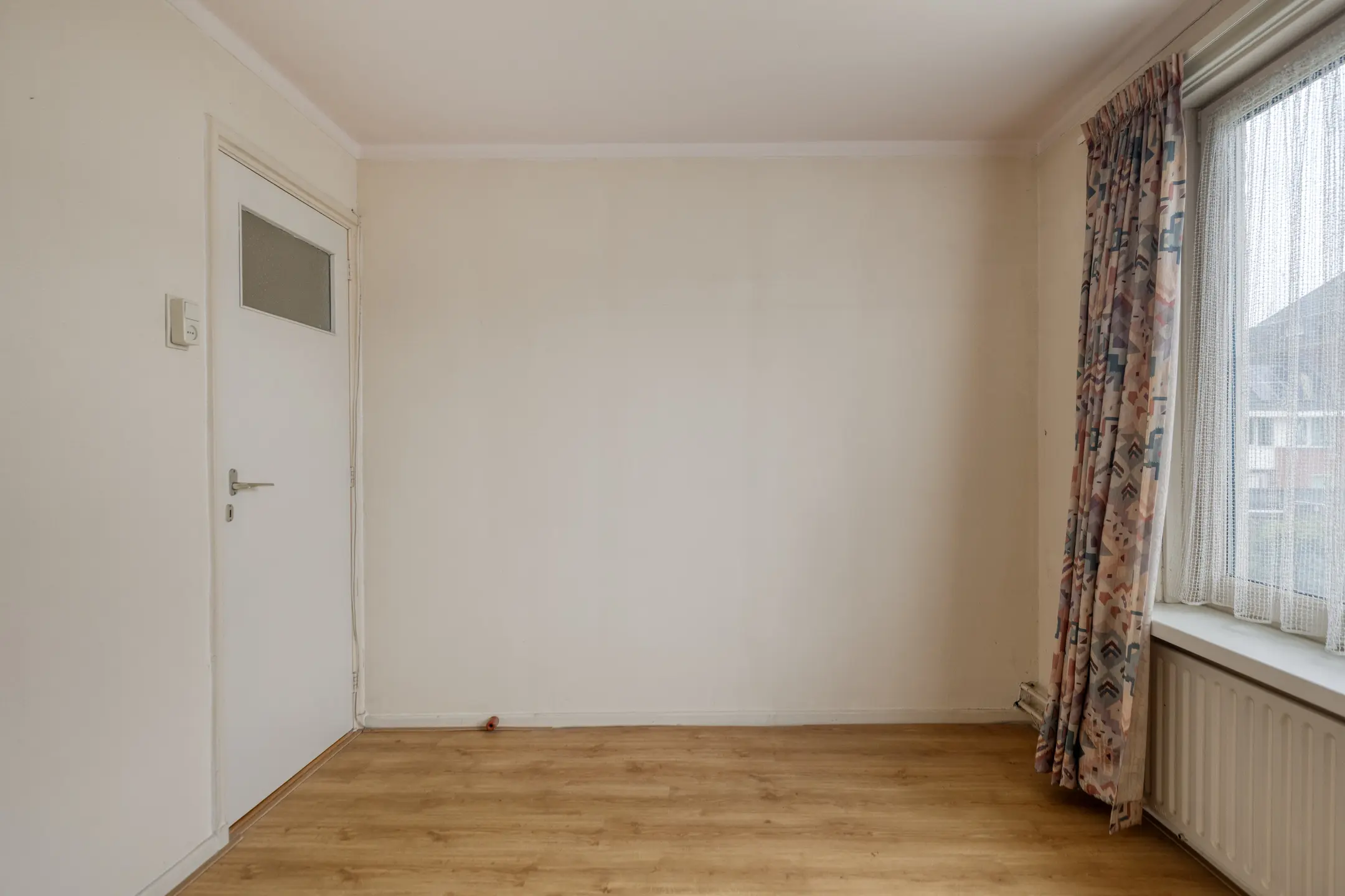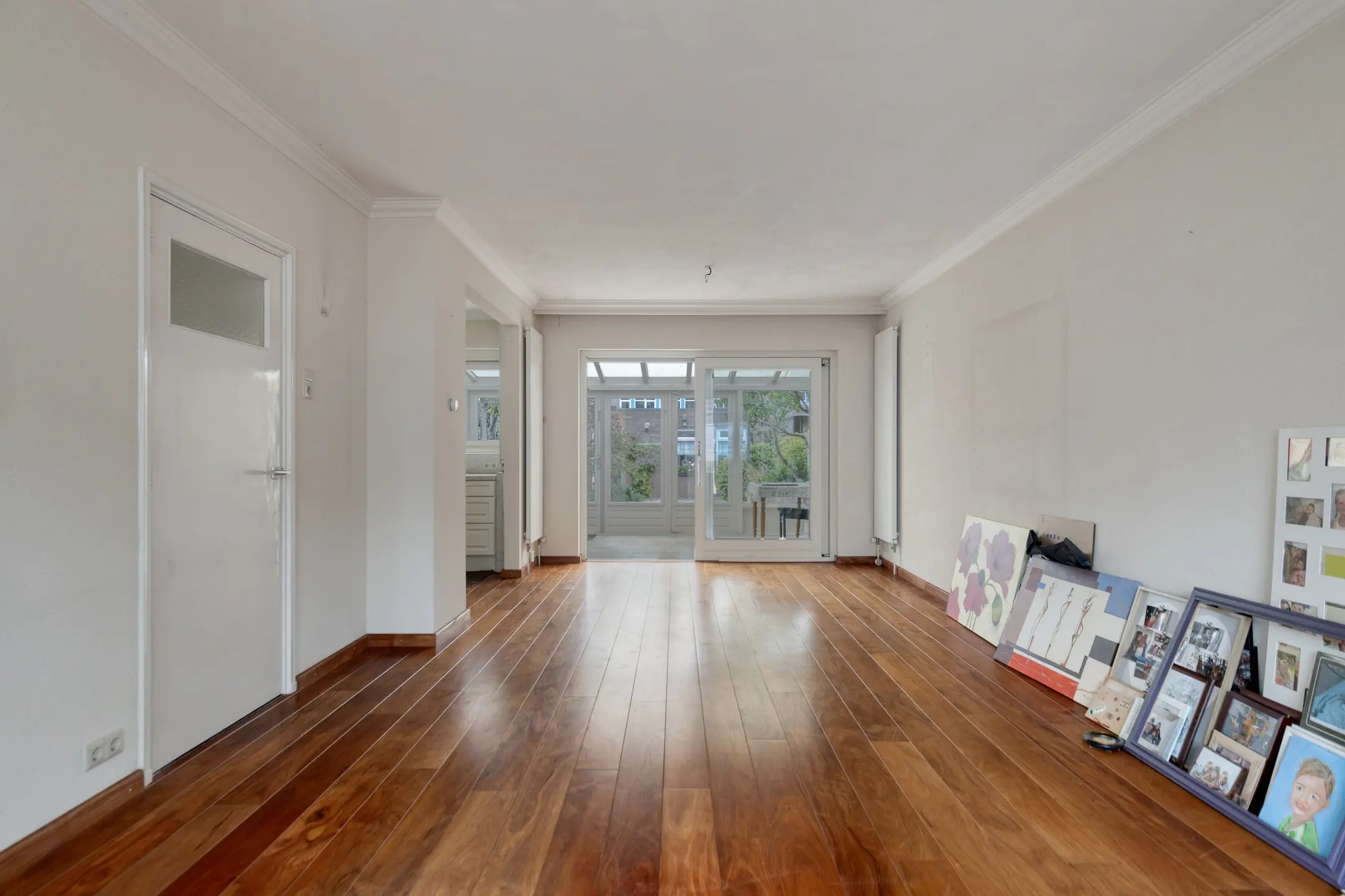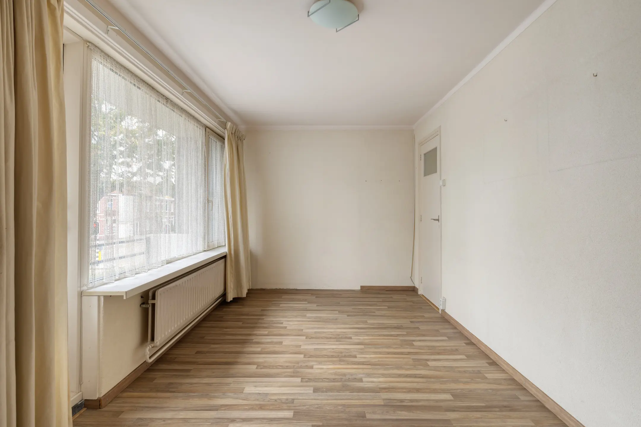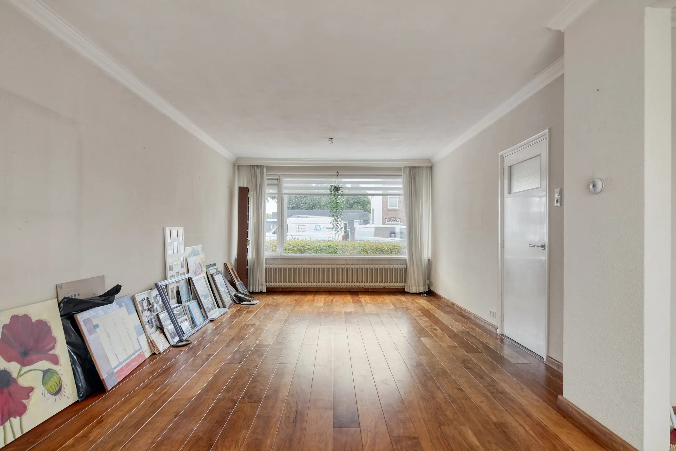 De woonkamer is royaal en licht dankzij het brede raam aan de voorzijde. Hier geniet je van een fijne zithoek met veel daglicht en een warme houten vloer. Vanuit de woonkamer loop je door naar de half-open keuken aan de achterzijde.