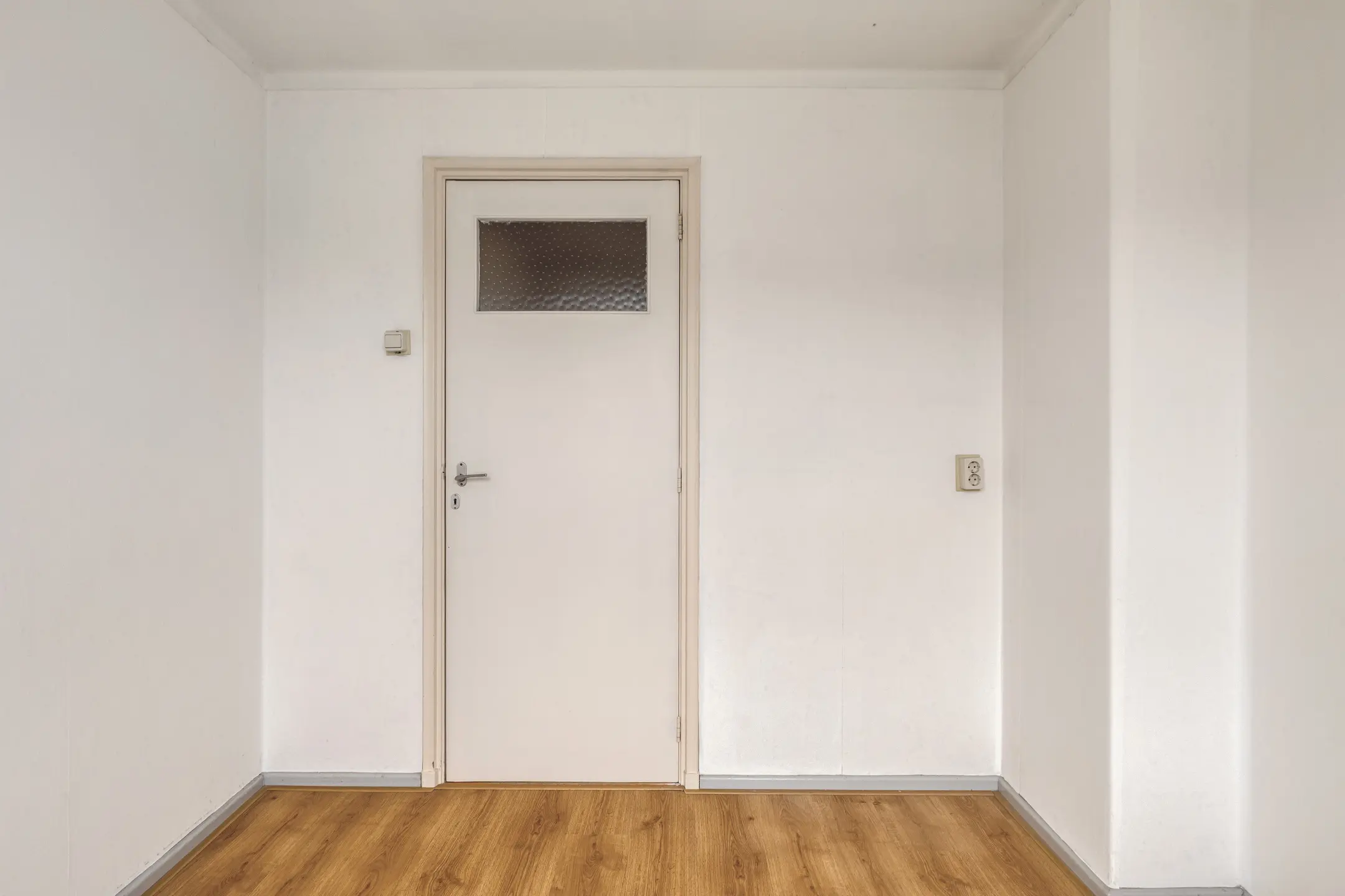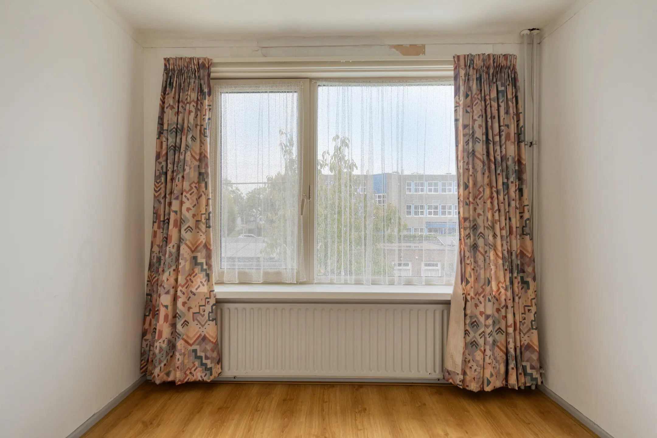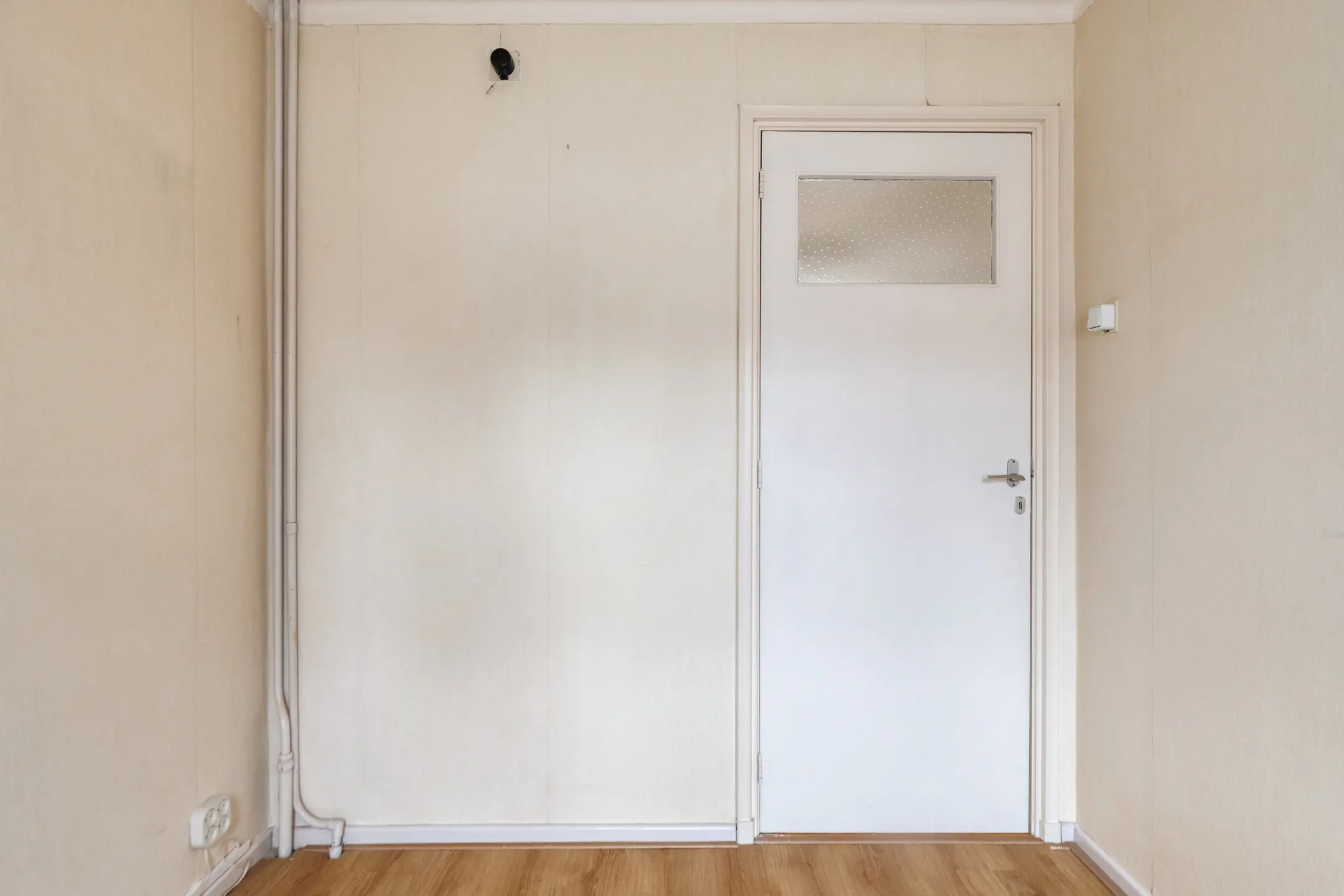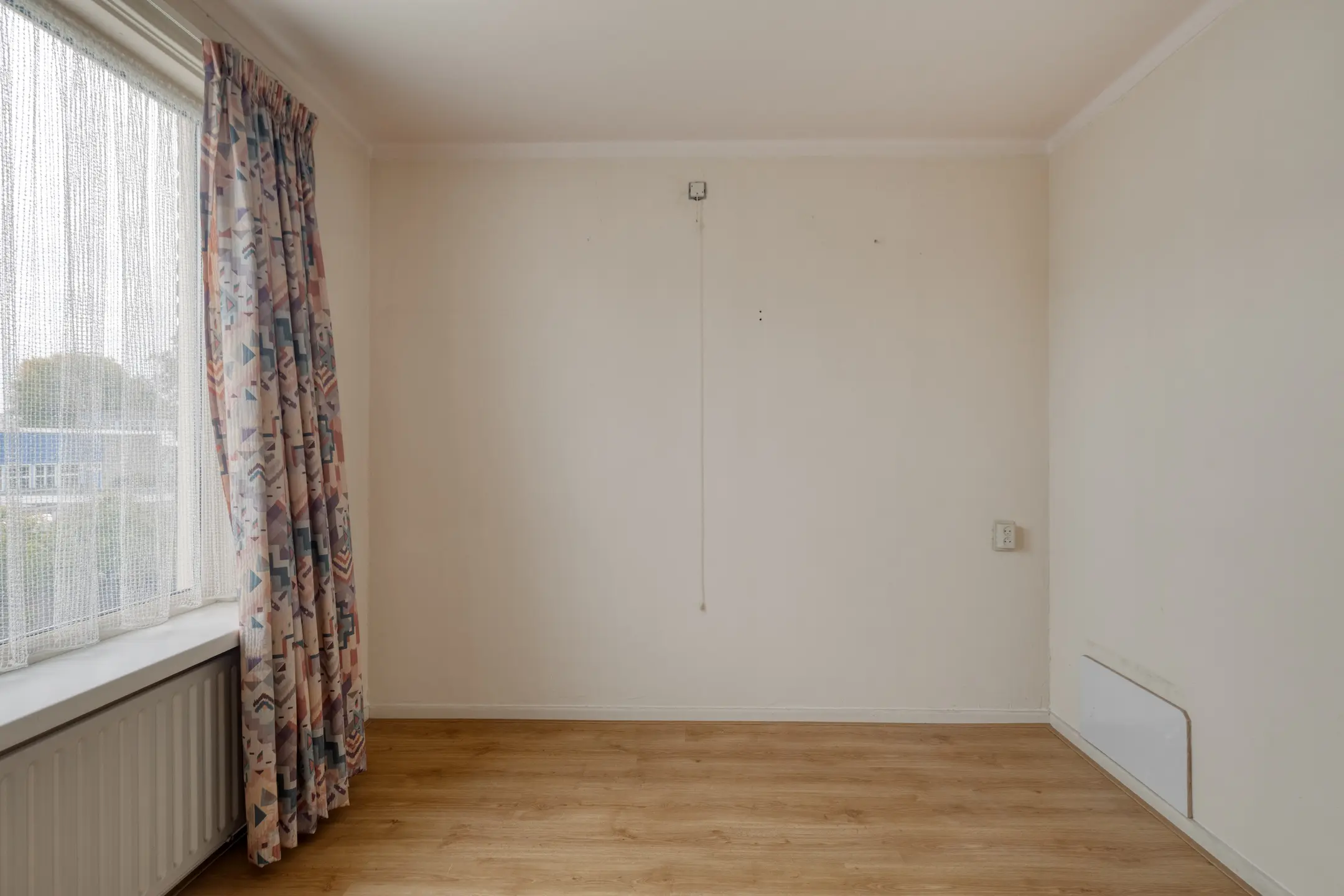 De woonkamer is royaal en licht dankzij het brede raam aan de voorzijde. Hier geniet je van een fijne zithoek met veel daglicht en een warme houten vloer. Vanuit de woonkamer loop je door naar de half-open keuken aan de achterzijde.