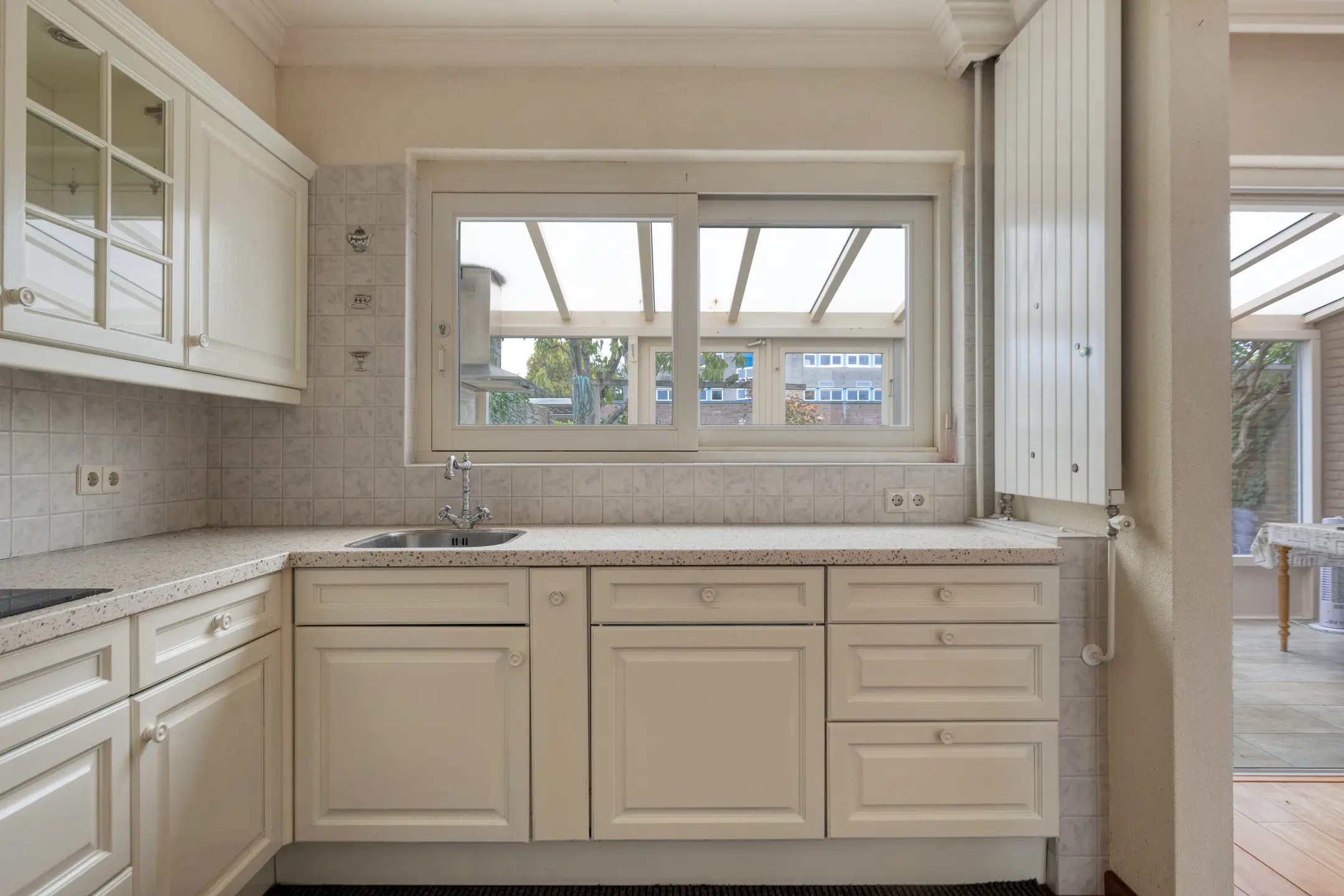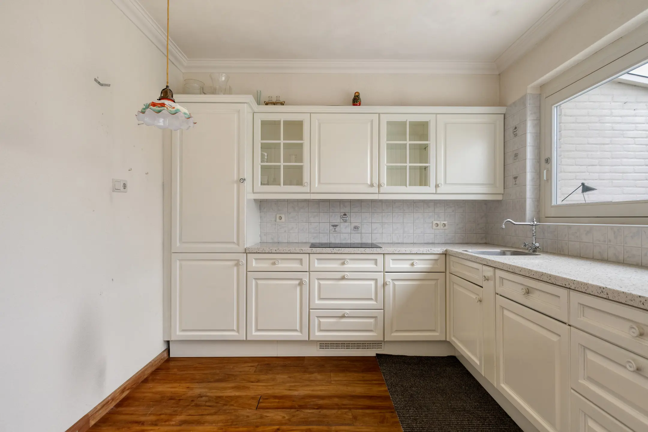De keuken is praktisch ingericht en voorzien van o.a. een inductiekookplaat, afzuigsysteem, vaatwasser, spoelbak, koelkast en vriezer. Het raam zorgt voor voldoende daglicht en geeft een fijne sfeer.