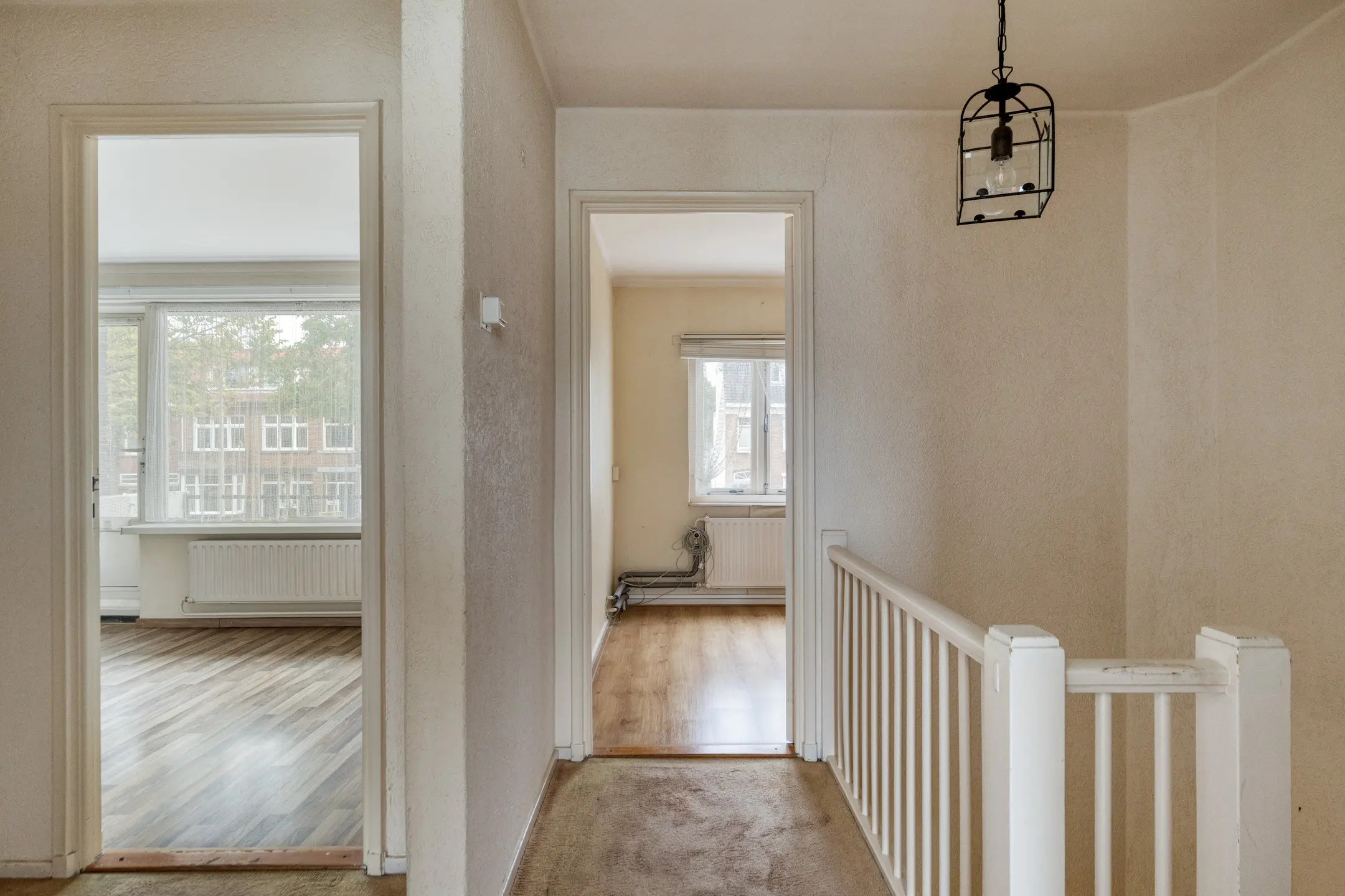 De vloeren zijn afgewerkt met laminaat, terwijl de overloop en trap bekleed zijn met een zandkleurig tapijt.