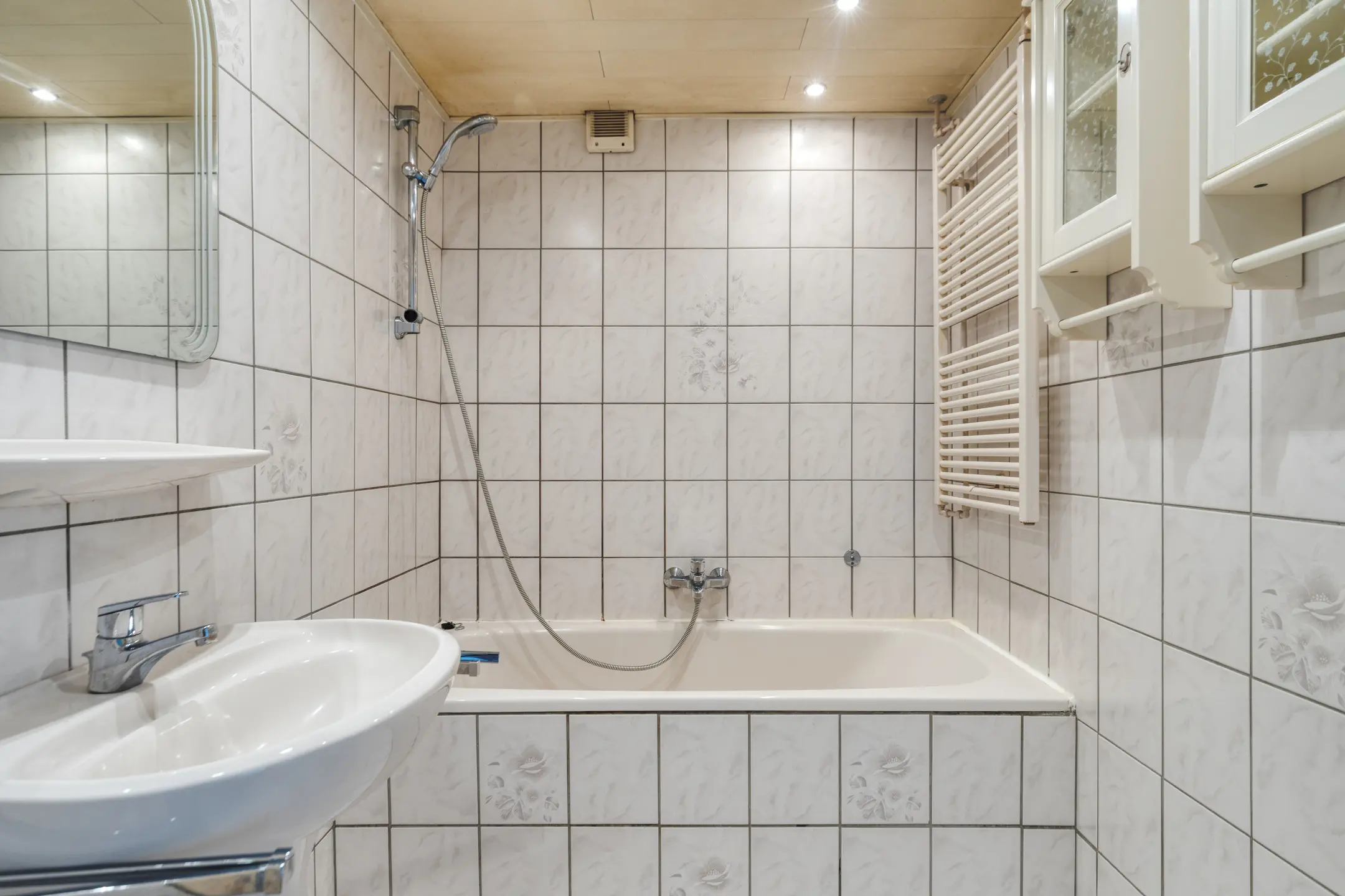De badkamer is eenvoudig, maar ruim genoeg om volledig naar eigen smaak te moderniseren. Momenteel uitgerust met een ligbad/douchecombinatie, wastafel en handdoekradiator.