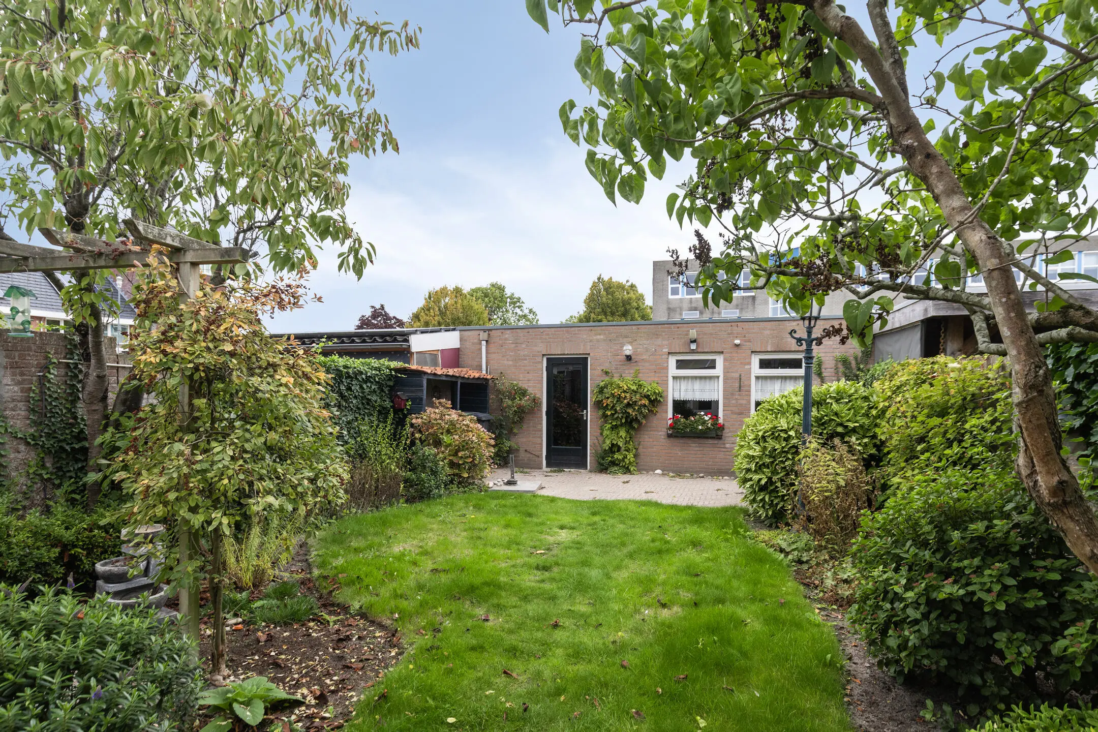 De achtertuin is ruim en gelegen op het noorden, voorzien van klinkers, een stuk gazon en groene beplanting langs de randen. Achterin de tuin bevindt zich de garage.